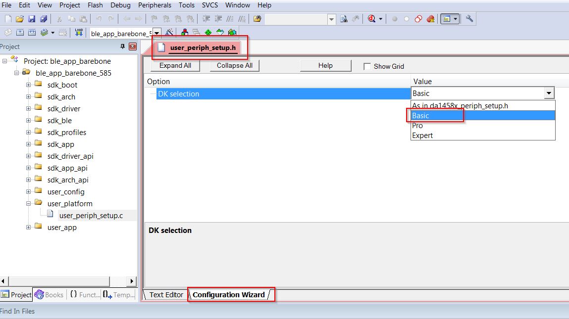 The user_periph_setup.h file contains hardware settings related to the Basic Development Kit used. The default is the ProDev Kit.