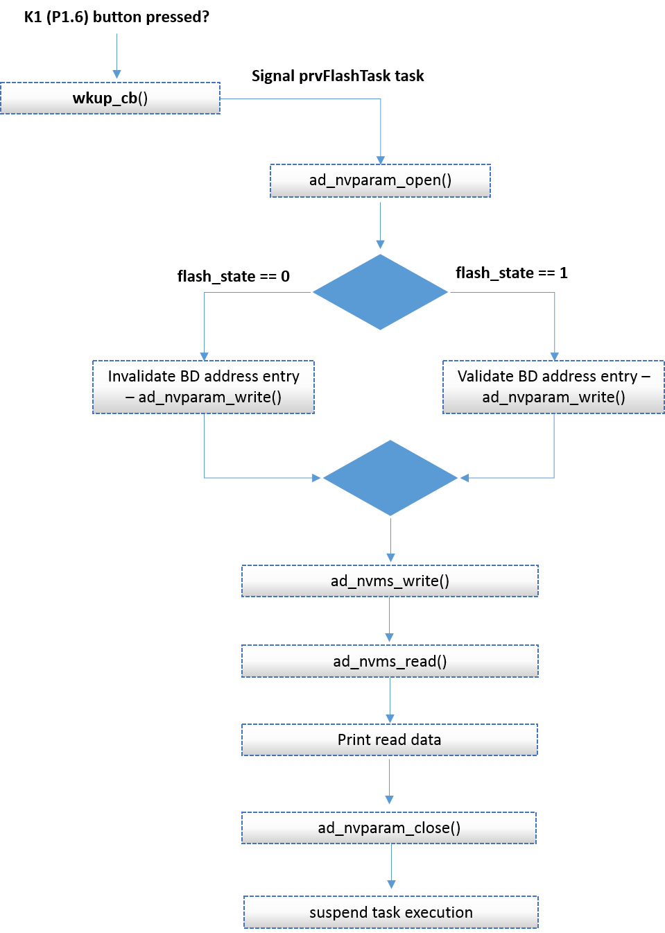 This section analyzes an application example which demonstrates using the flash adapters. The example is based on the freertos_retarget sample code found in the SDK. It adds an additional freeRTOS task which is responsible for various flash operations and enables the wake-up timer for handling external events. Both the NVMS and NVMS_PARAM APIs are demonstrated.