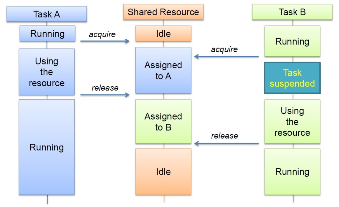 - Synchronous writing/reading operations, block the calling freeRTOS task while the operation is performed using Semaphores rather than relying on a polling loop approach. This means that while the hardware is busy transferring data, the Operating System (OS) scheduler may select another task for execution, thus utilizing processor time more efficiently. After the transfer finishes, the calling freeRTOS task is released and resumes its execution.
