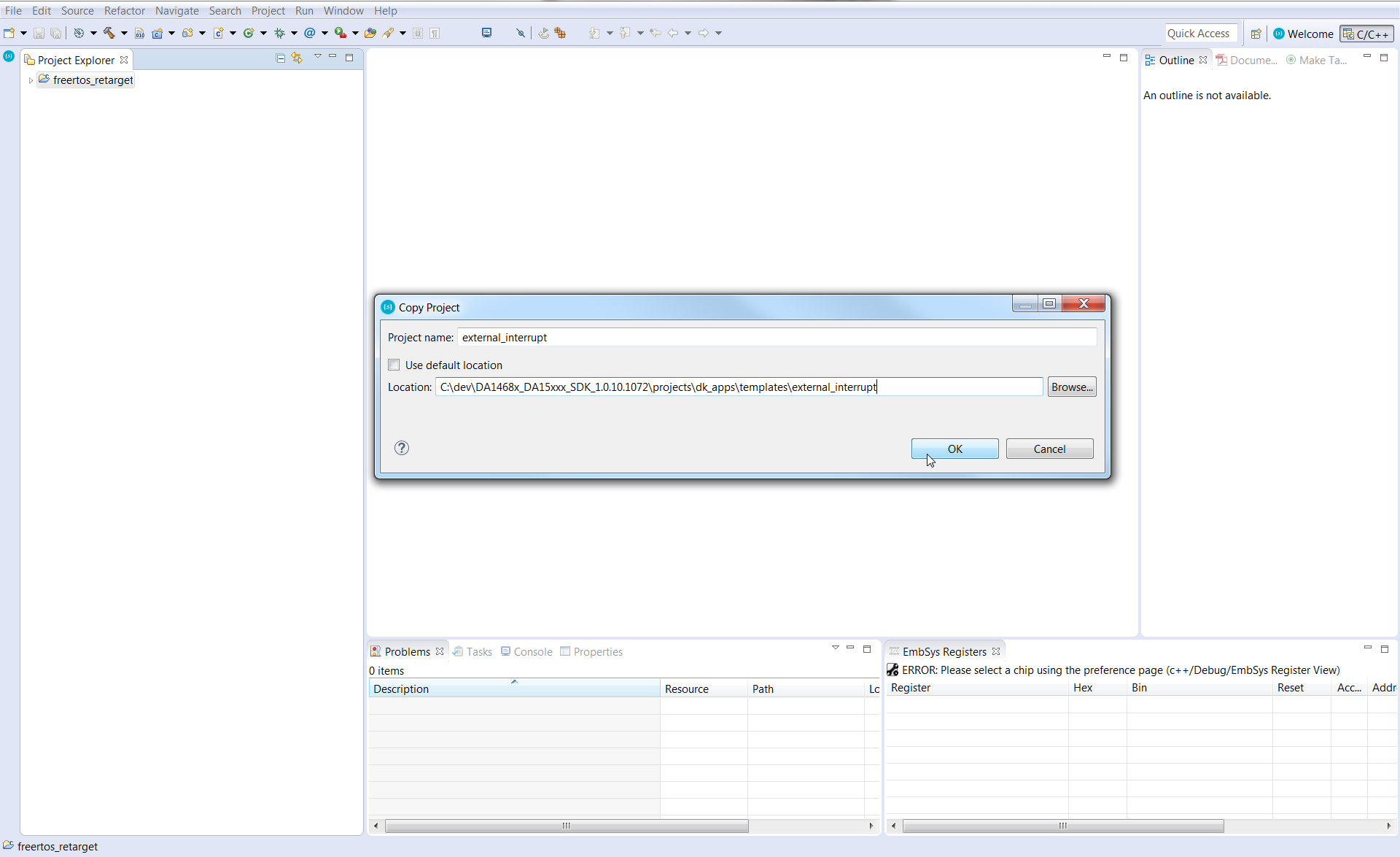 Copy and paste your project and call it external_interrupt. When pasting, make sure you paste in the same folder as the source project. In this case, SDKROOT is “C:\dev\DA1468x_DA15xxx_SDK_1.0.10.1072” and the destination folder is set to “C:\dev\DA1468x_DA15xxx_SDK_1.0.10.1072\projects\dk_apps\templates\external_interrupt”.
