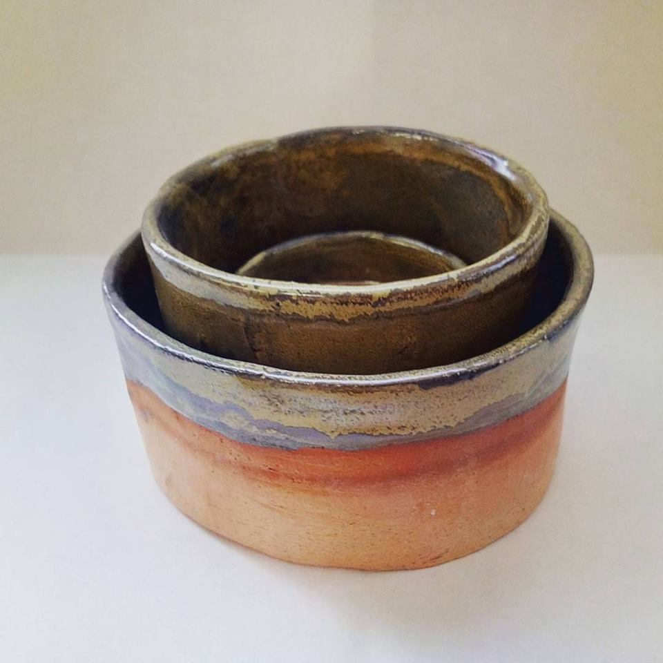 Handbuilding techniques include pinch pots, coiling and also Slab building to create cylinder and box forms, such as these nesting bowls featured in image above.