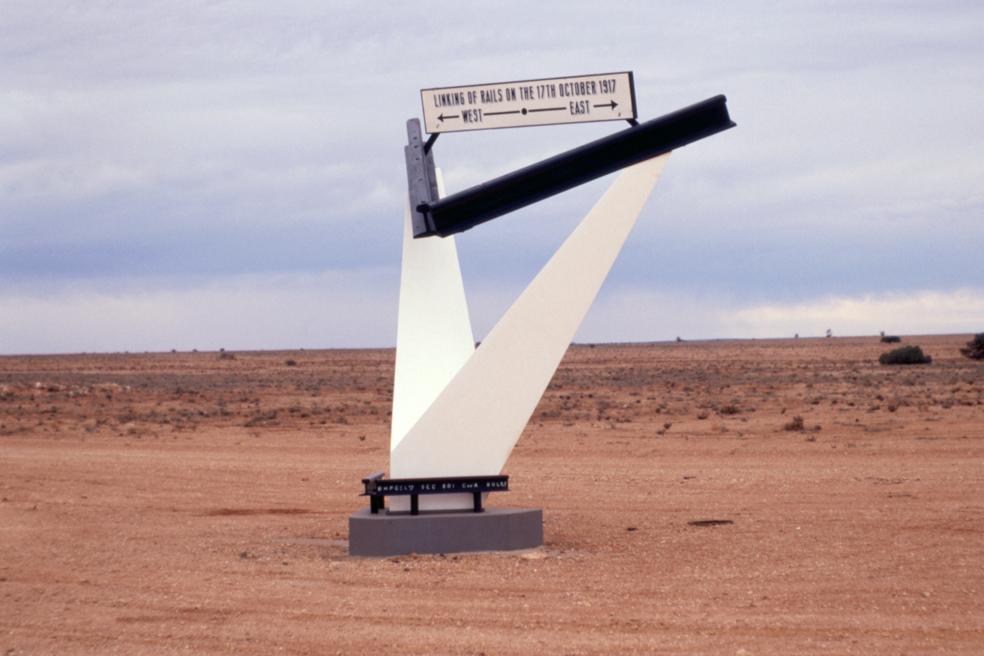 I slept well on the carriage seat, except for a period when someone parked a diesel outside the window. There was a glorious sunrise which I did not photograph, being still too befuddled to think clearly. We should have left Tarcoola at five but it was nearer eight before we got away. At a photo stop at Manna Bank, the diesels blew a fuse, again leaving 3801 to haul the train up the slight grade itself. Took a photo of Barton before we reached the monument near Ooldea marking the joining of the lines from east and west in 1917. Apparently they were six inches out! Some rain fell while we were out, but it evaporated almost as soon as it hit the ground.