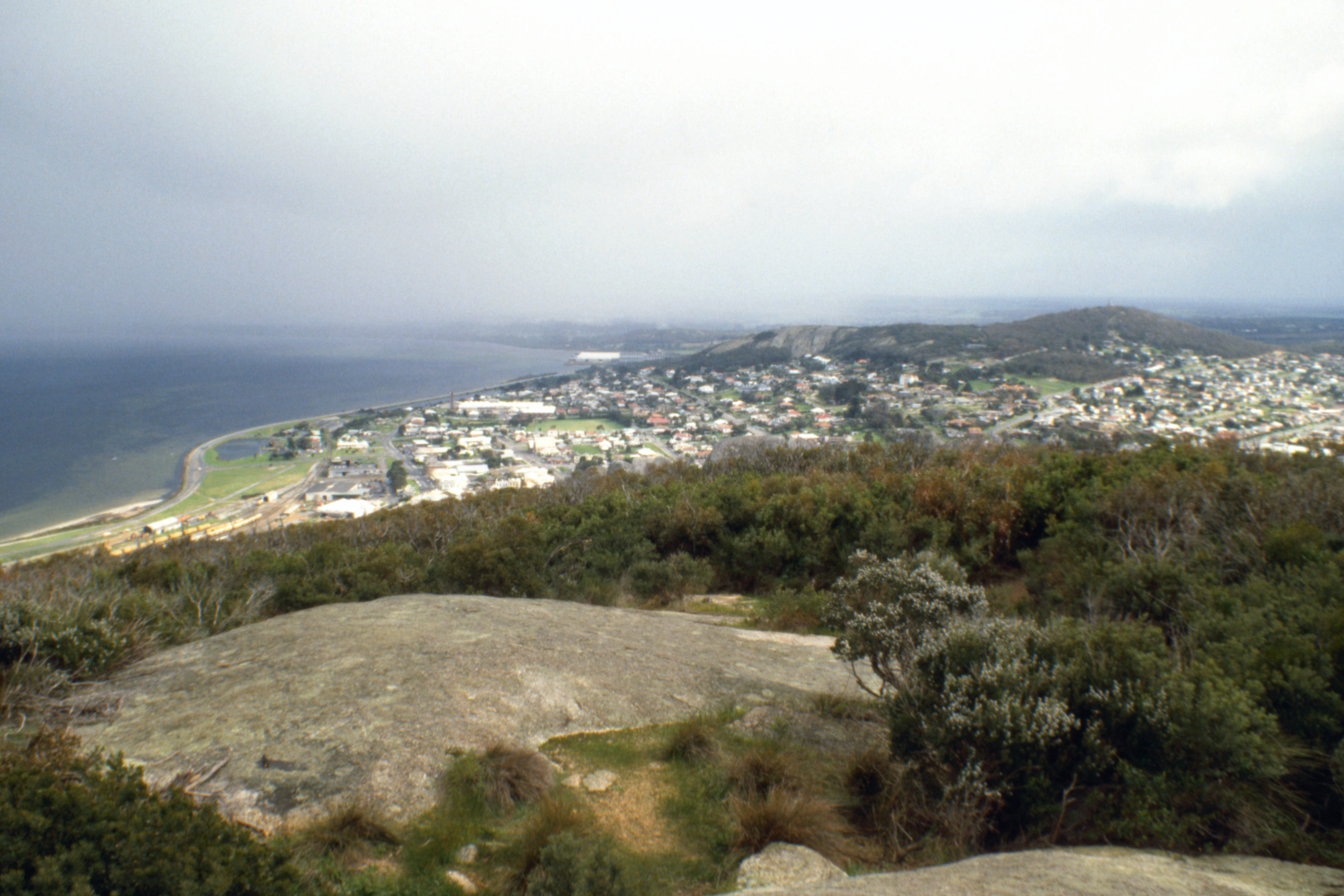 Up a bit earlier but took longer over breakfast. Booked in for another two nights and expressed interest in a trip to the Stirling Ranges tomorrow. Wandered up the Albany Highway to investigate a couple of camping shops but they had no suitable footwear. Walked up Mt Mitchel, on the other side of town from Mt Clarence. Good views from the top, where there is a look-out tower with a small souvenir shop and tearoom, which proved a better shelter than yesterday’s loo.