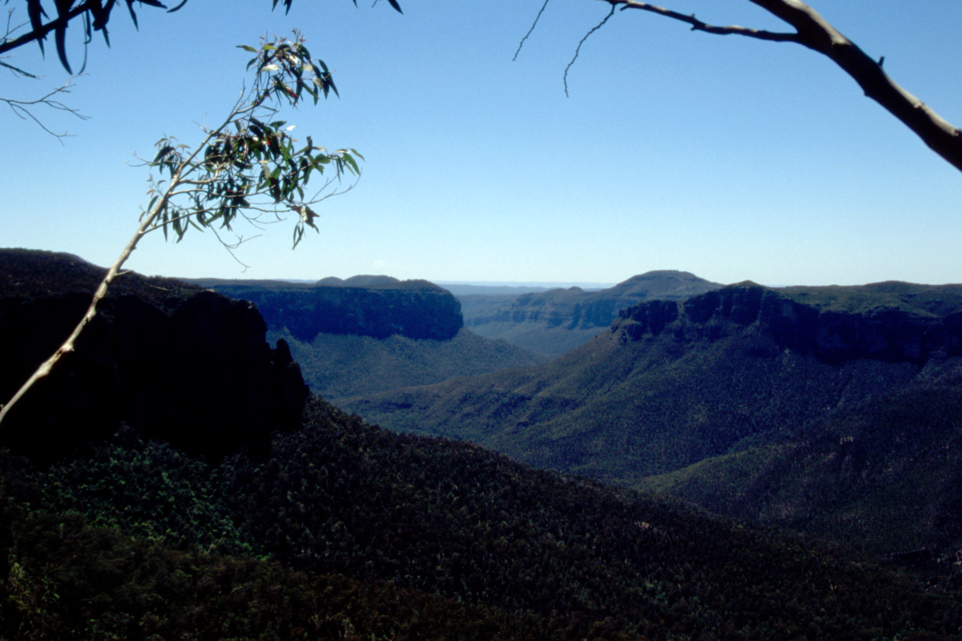 The Blue Mountains are really an escarpment, with the steep slope facing Sydney and an only slightly less steep western face. It is cut by deep steep-sided canyons which make travel very awkward and thwarted many attempts by the early settlers to cross into the interior by the usual approach of following the rivers. Ultimately, they tried following a ridge and found a way across. That route is now the main highway west from Sydney towards Perth, and passes through Katoomba (pop 8,300), 110 kilometres by rail from Sydney and about 3,300 feet higher. Katoomba is the main tourist centre of the region, attracting a lot of short break visitors from the coast for the scenery and walking.