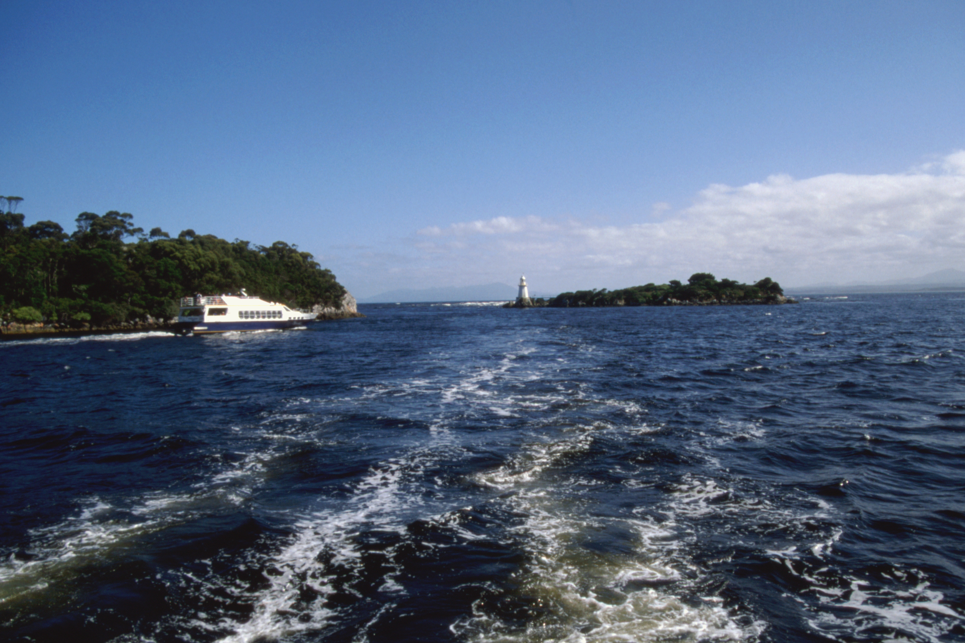 As this was my last day in Strahan, I loaded all my gear in the car and left it in the Municipal car park near the wharf before joining the Wanderer II, a catamaran built in Hobart in 1996, length 25 metres, beam 8.5m and draught 1.5m, with a capacity of 160 passengers and service speed about 25 knots. She was nearly full as we headed across the Macquarrie Harbour to Hell’s Gate, the harbour entrance where a local version of the Lang Dyke was constructed to deepen the channel. Then to Sarah Island for an hour, a penal settlement from 1826 to 1835 for those who broke the rules at Port Arthur. There is not much left standing but it’s amazing how much had been built there while the island was in use.