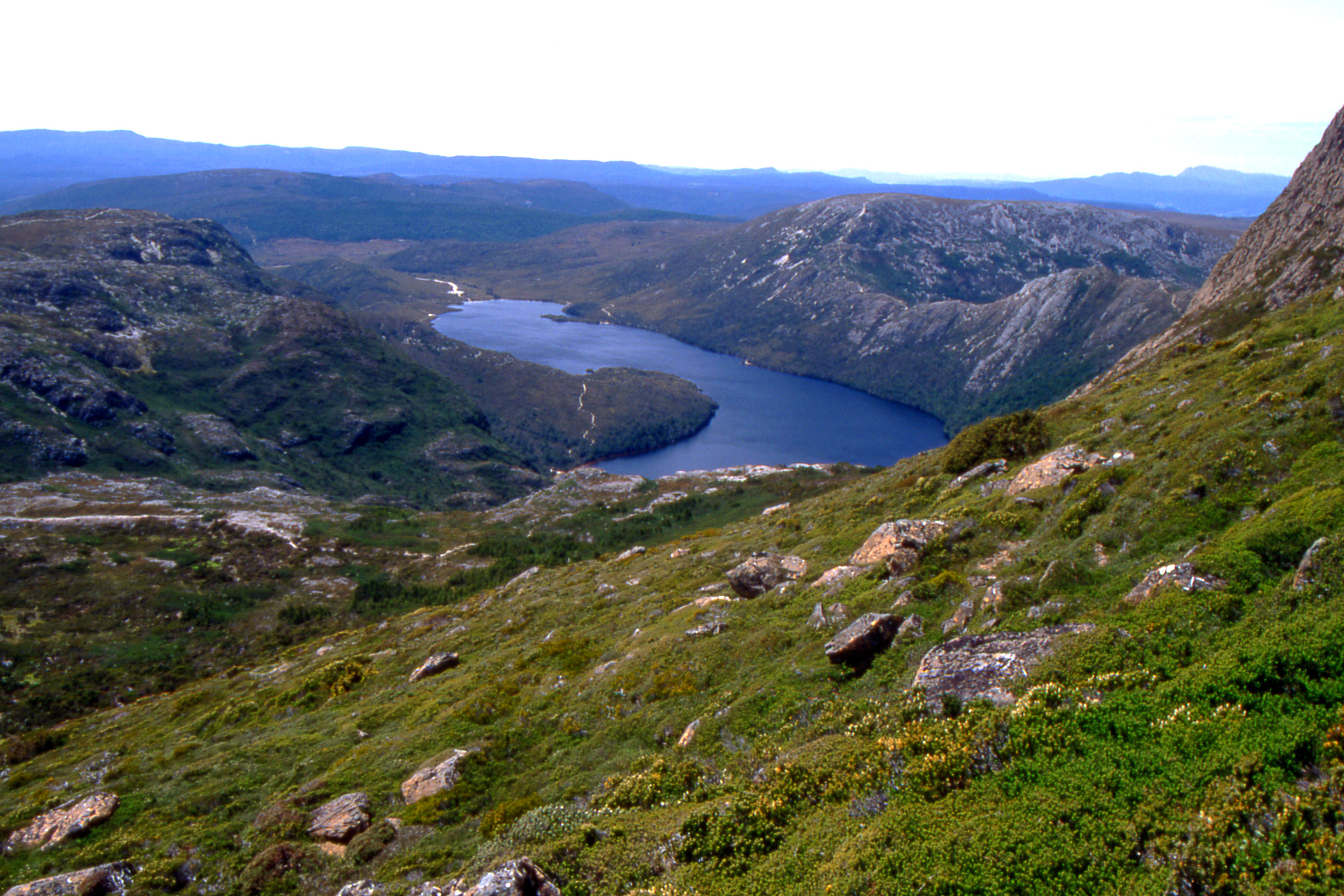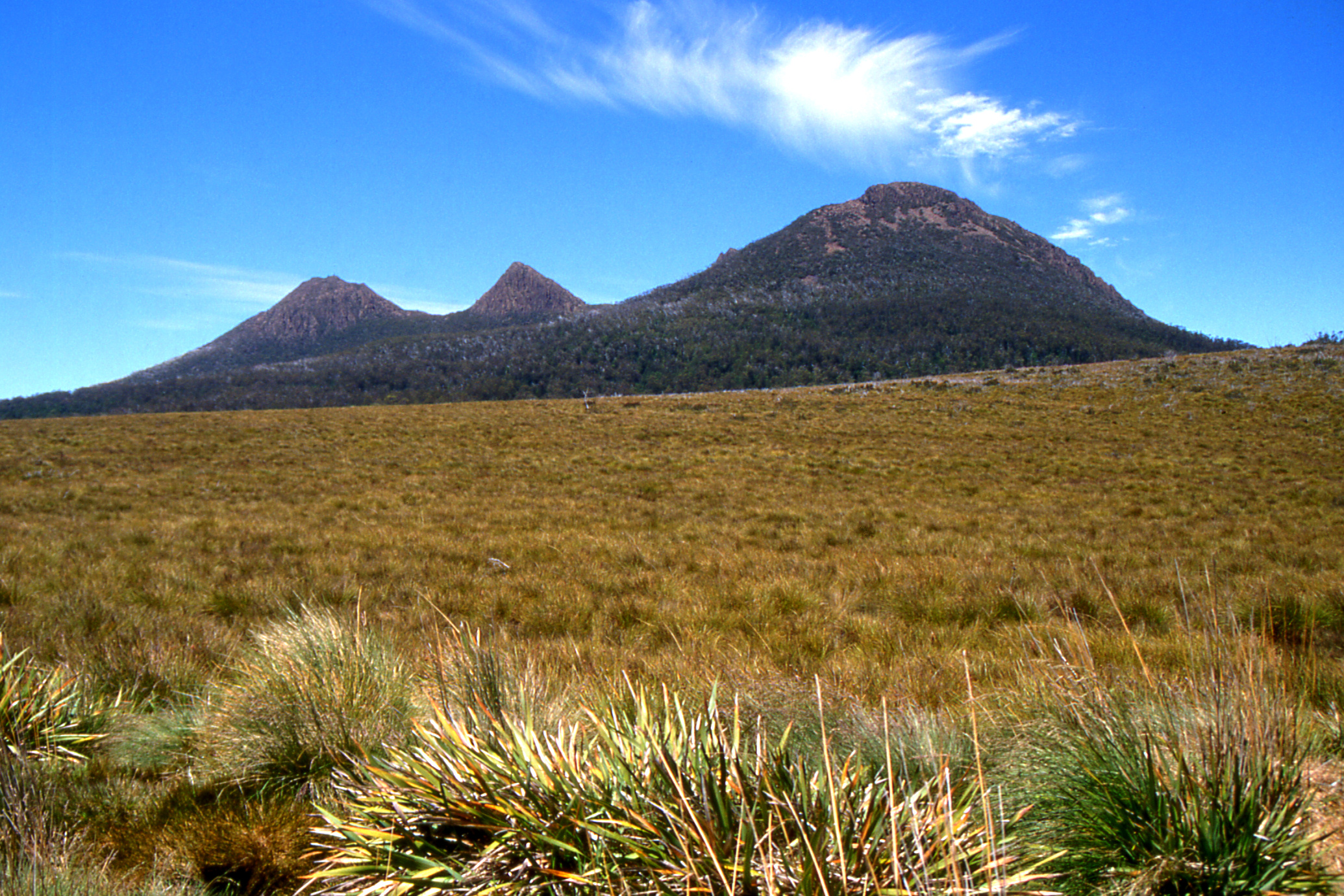 Looking west from Cradle Mountain (1545m) over the Cradle Plateau and Crater Peak (1270m) |