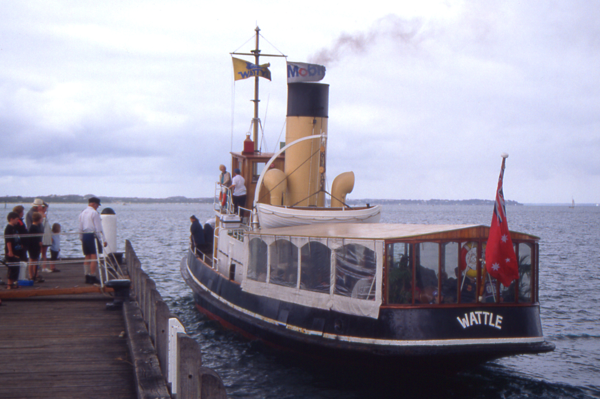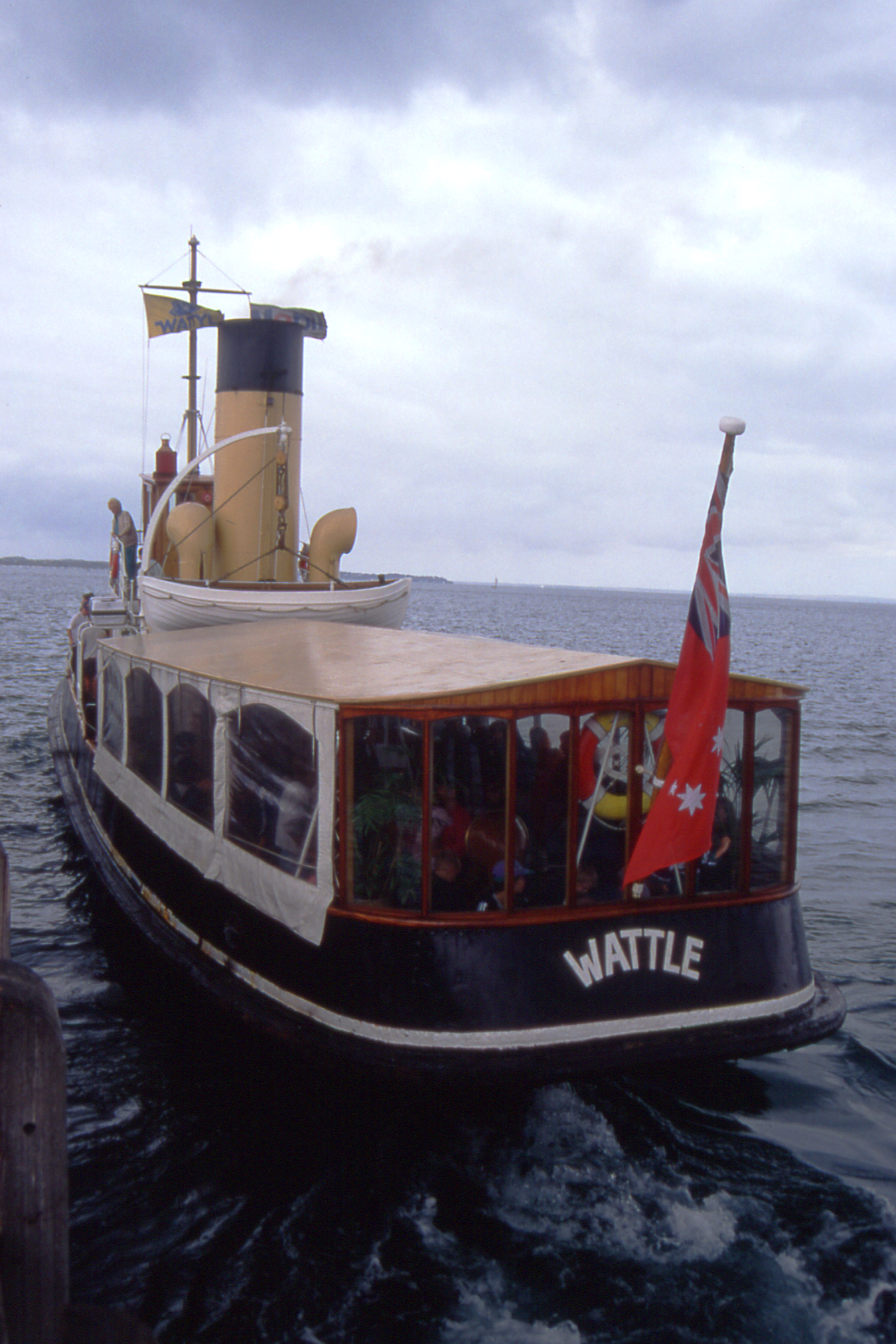 Steam tug Wattle approaching the pier at Rye My bed was available for another night so I bought it before wandering into the town, stopping for breakfast of tea, fruit salad and yoghurt in a convenient cafe. Then I caught the 1055 bus twenty minutes along the coast to Rye for my second encounter with the steam tug Wattle. During the school holidays, she sails regularly from Rye out to the South Channel light to see the small colony of fur seals which bask on the horizontal beams of the structure supporting the light. Fur seals are considerably larger than our grey seals but seem to have no problem lifting their bulk two or three feet from the sea to the beams. (There is a plan to remove the light to allow for widening of the channel, and who needs lights in these days of high-tech satellite navigation systems? The lamp itself may be renovated and preserved as a maritime icon.)