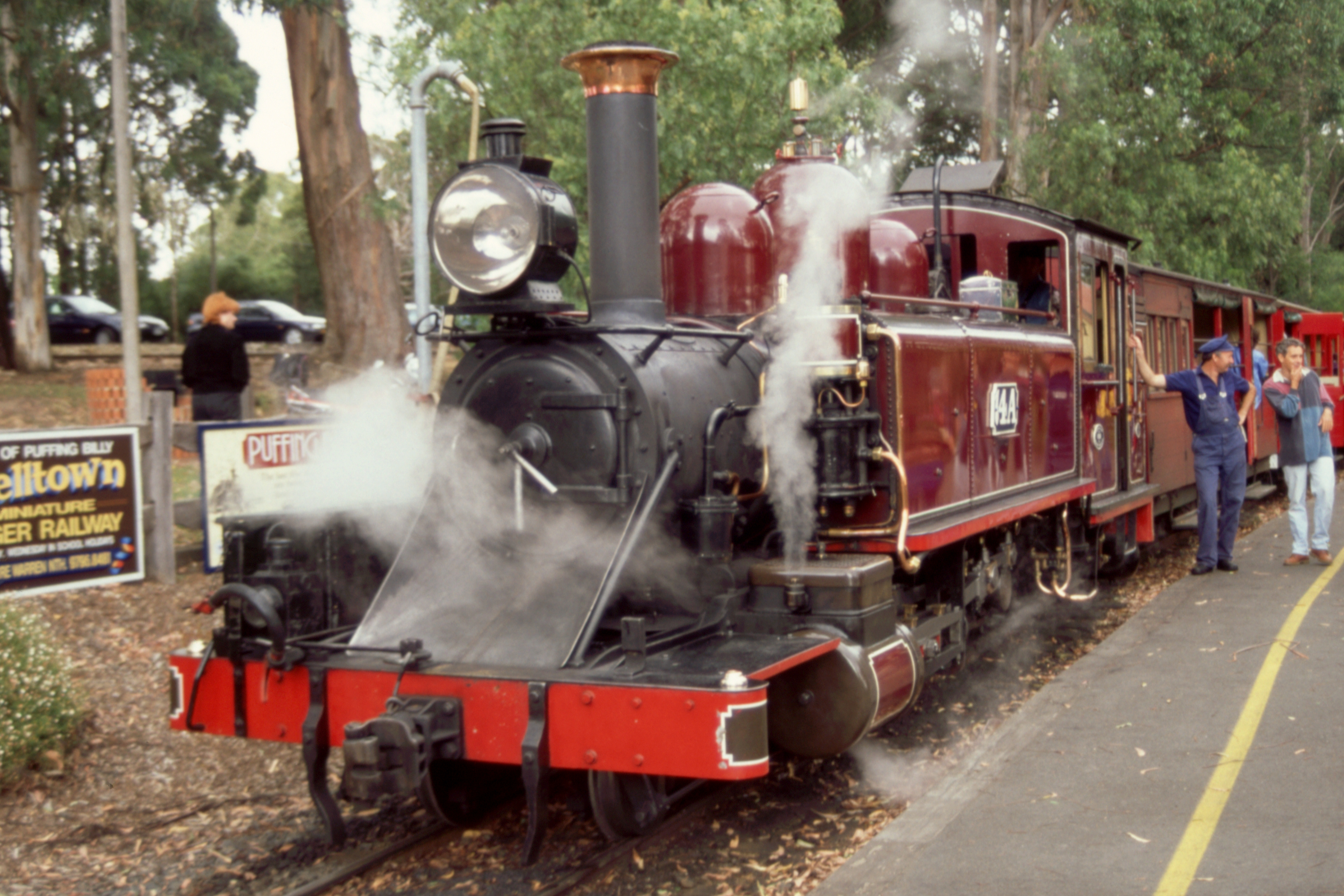 It was cooler in the morning, overcast, even offering a prospect of rain, though none had been forecast (and none happened). I made an early start for Spencer Street and just after eight, I caught the train to Belgrave, change at Ringwood, for the Puffing Billy Railway. The station facilities have been upgraded since my last visit (almost 10 years ago) and I don’t remember a black locomotive I’ll have to check the old photos when I get back. [I only saw 7A (green) & 14A (orange) that time.] I took the first train (black locomotive No.12A) up to Lakeside and back down as far as Menzies Creek where I stopped for a look at the small museum wherein lurks the last Abt rack locomotive of the Mt. Lyell Mining and Railway Company, built in 1938 by the North British Locomotive Company, Glasgow.