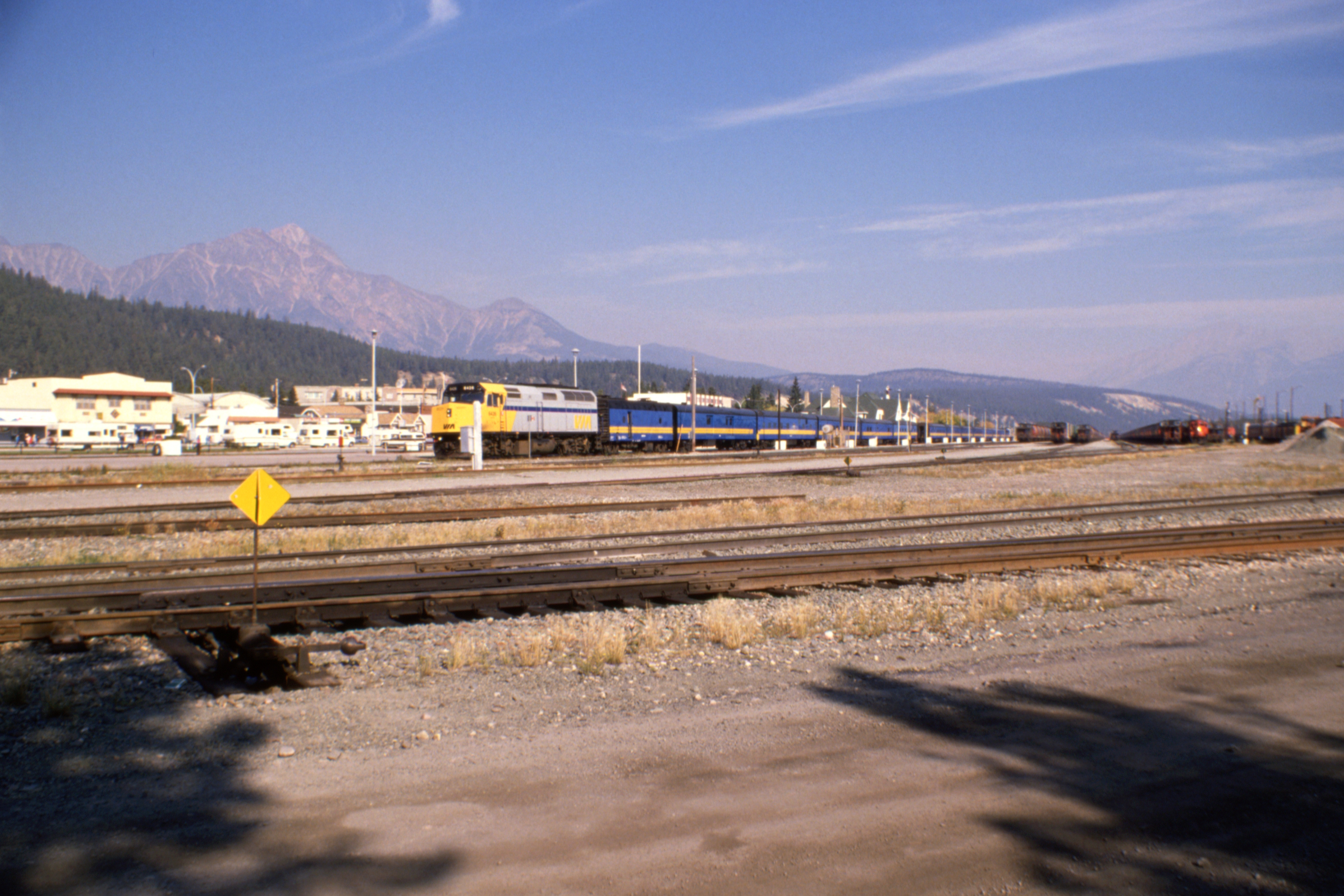 Pyramid Mountain above the railway station at Jasper, with 6426 taking The Skeena off the end of the eastbound Super Continental |