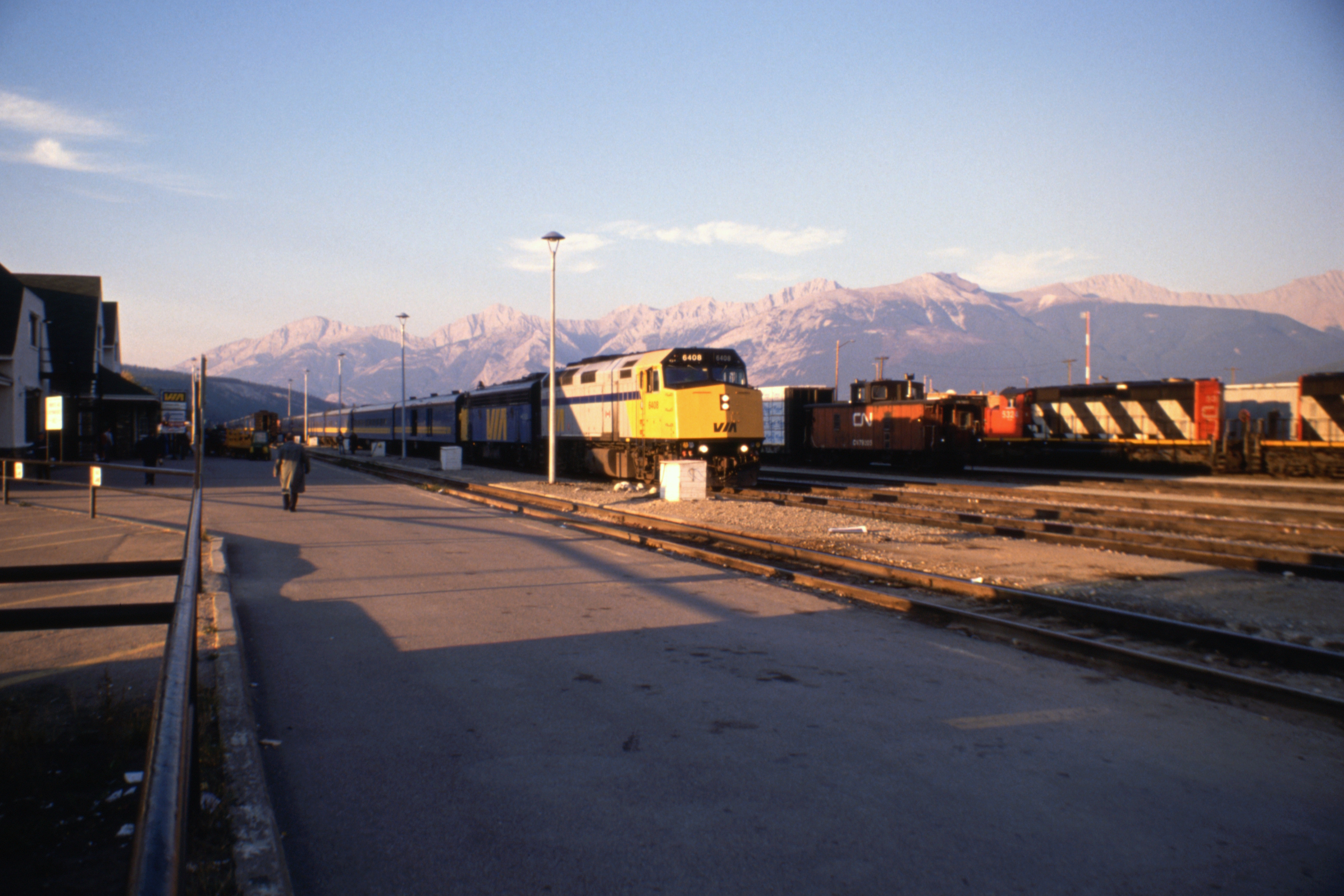 Mountains beyond the yards at Jasper | Mountains beyond the railway station at Jasper with 6408 on the westbound Super Continental |