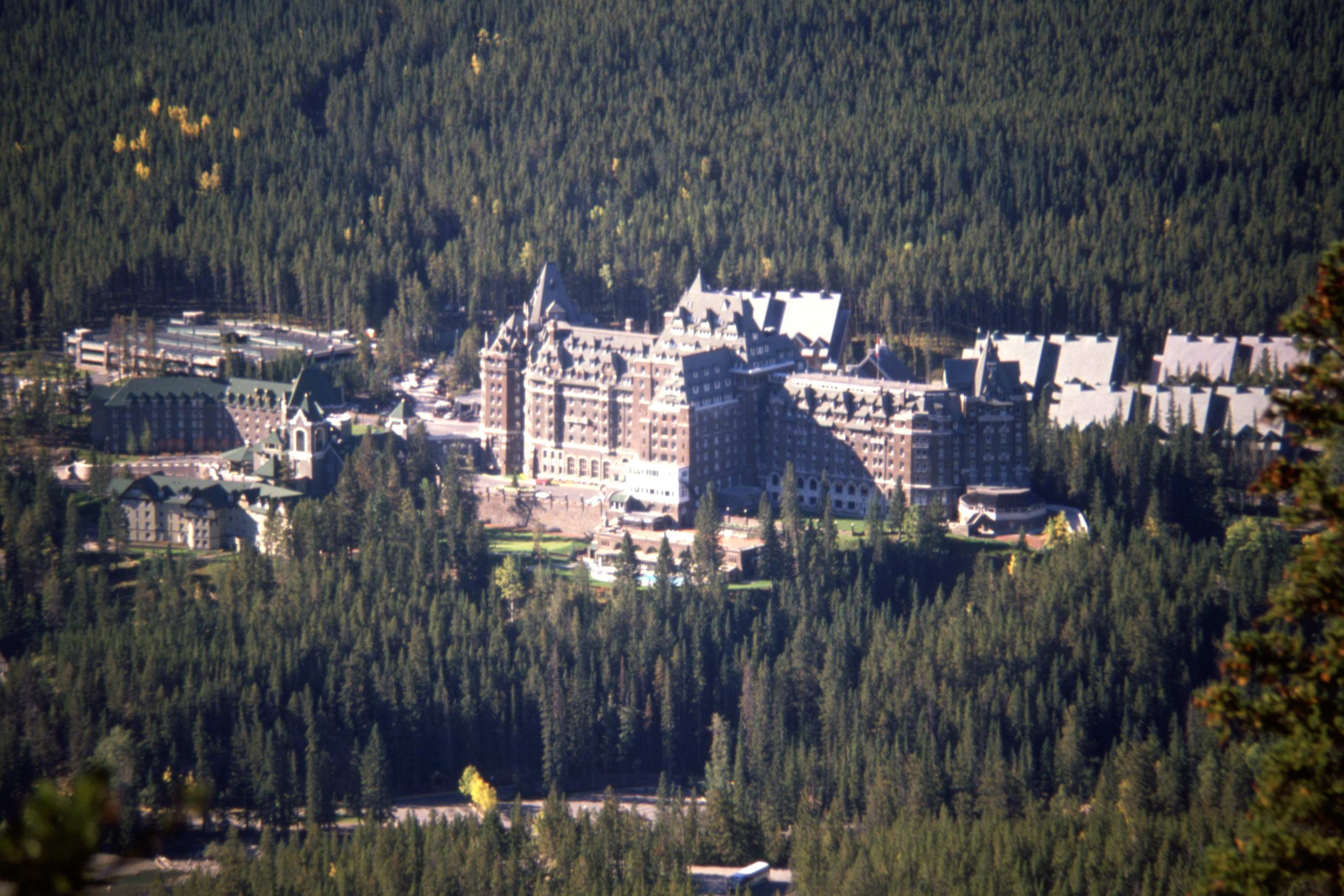 Back down the mountain in the gondola for free, they only check tickets on the way up, then followed a trail through the woods to the Banff Springs Hotel and thence back to town, pausing to take the traditional view of Banff Avenue from the steps of the Park Administration Building.