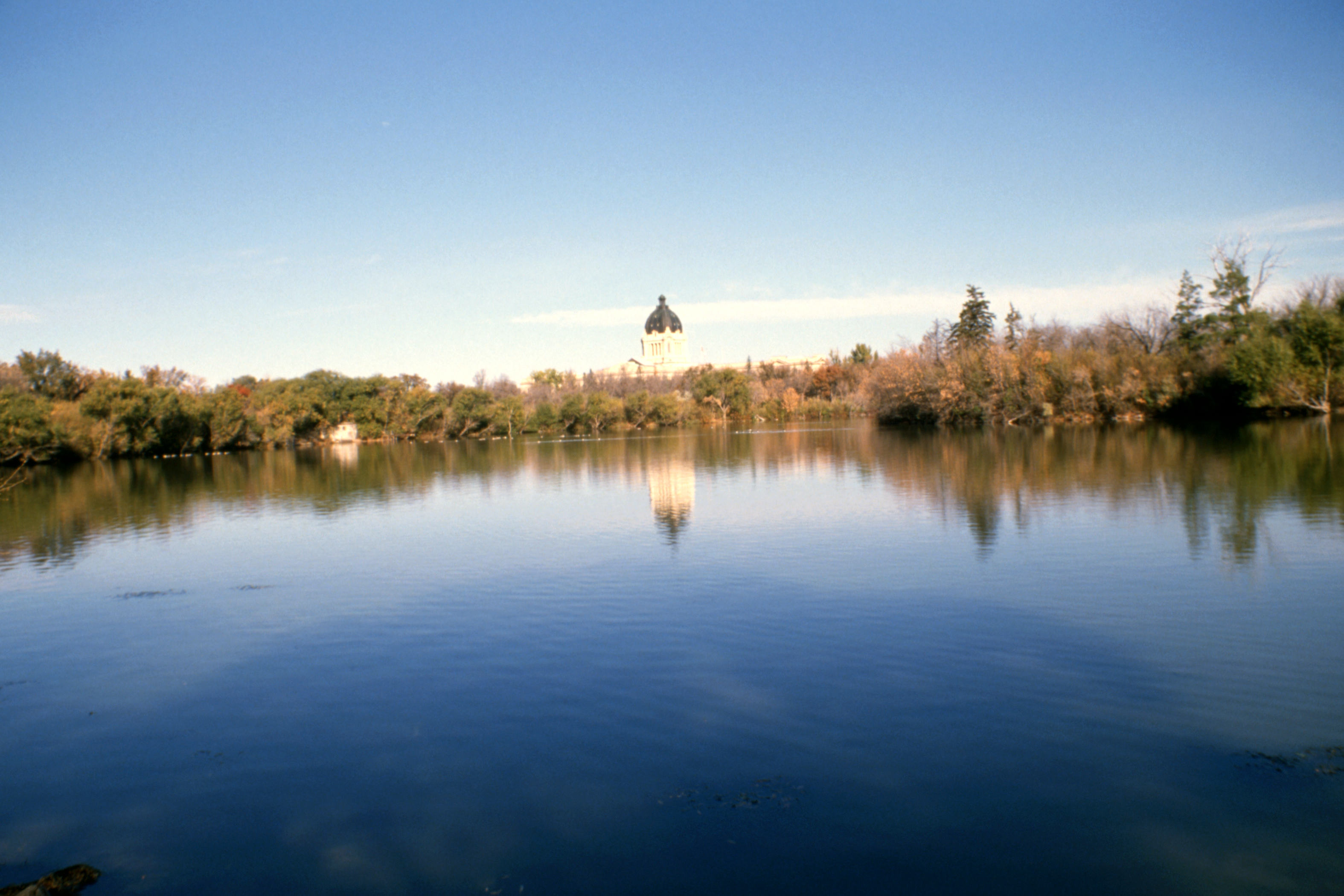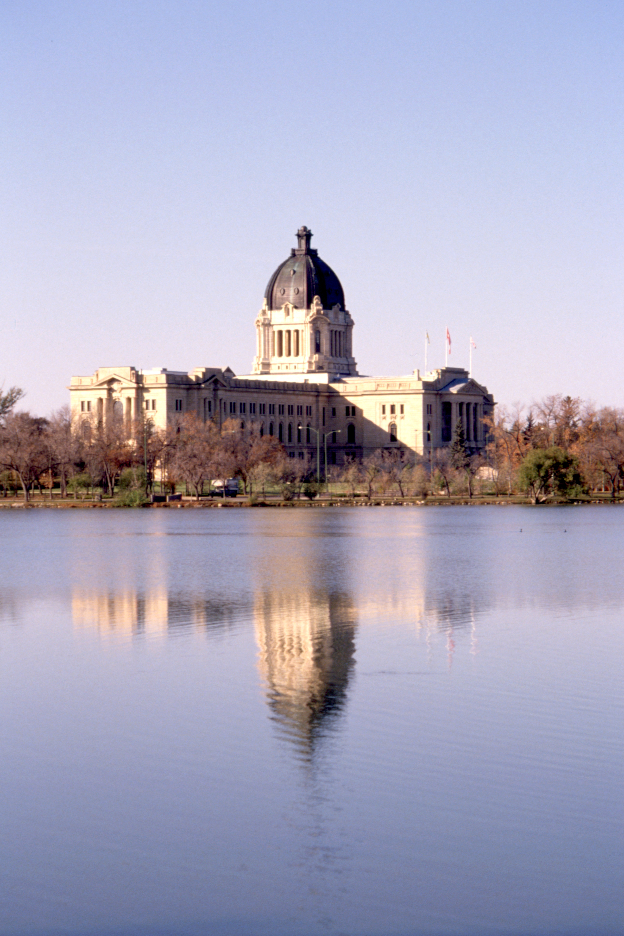 High-rise Regina beyond Lake Wascana | Side view of Saskatchewan Provincial Legislature |
