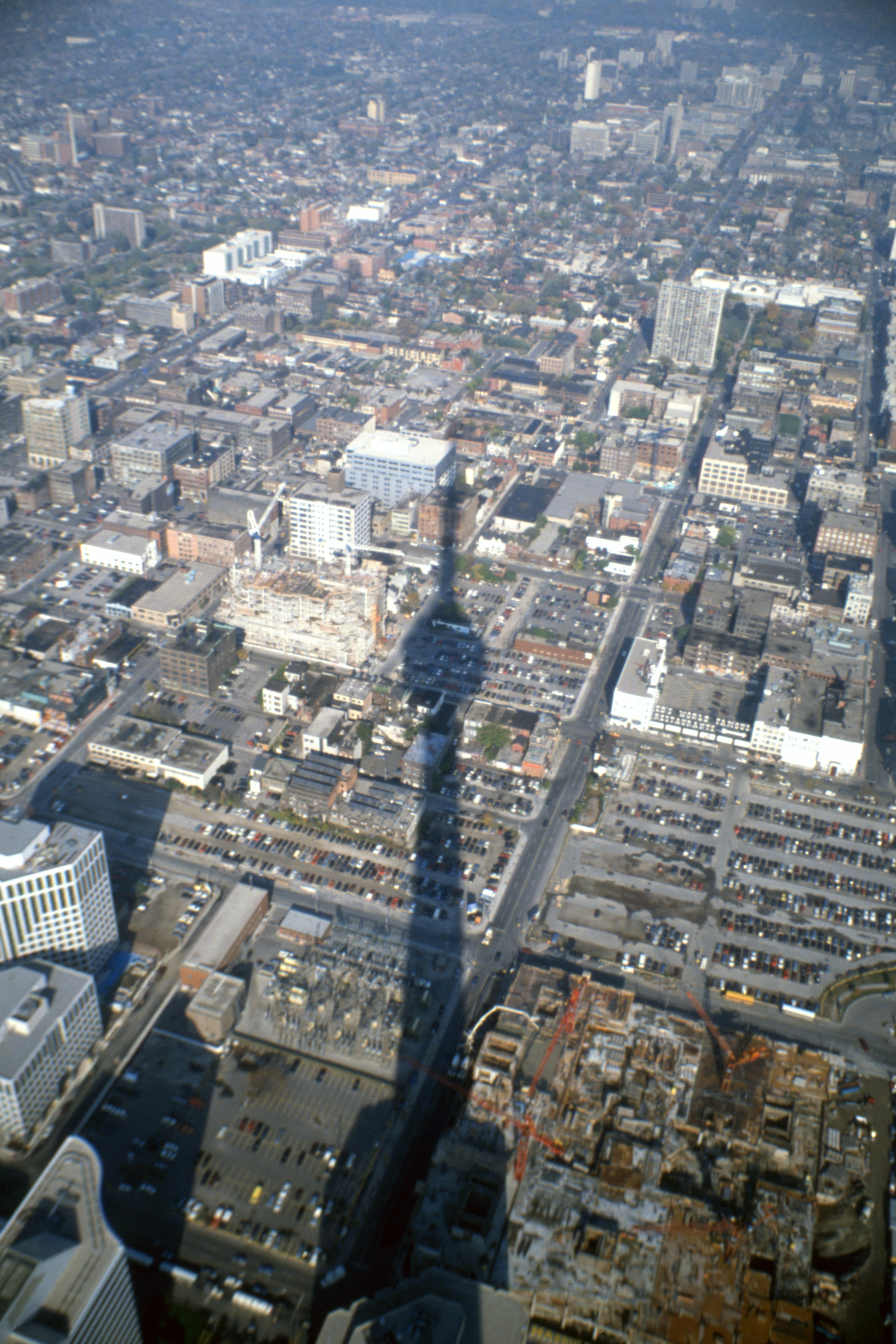 Gable end at the Skydome | CN Tower rising from the Skydome roof |
