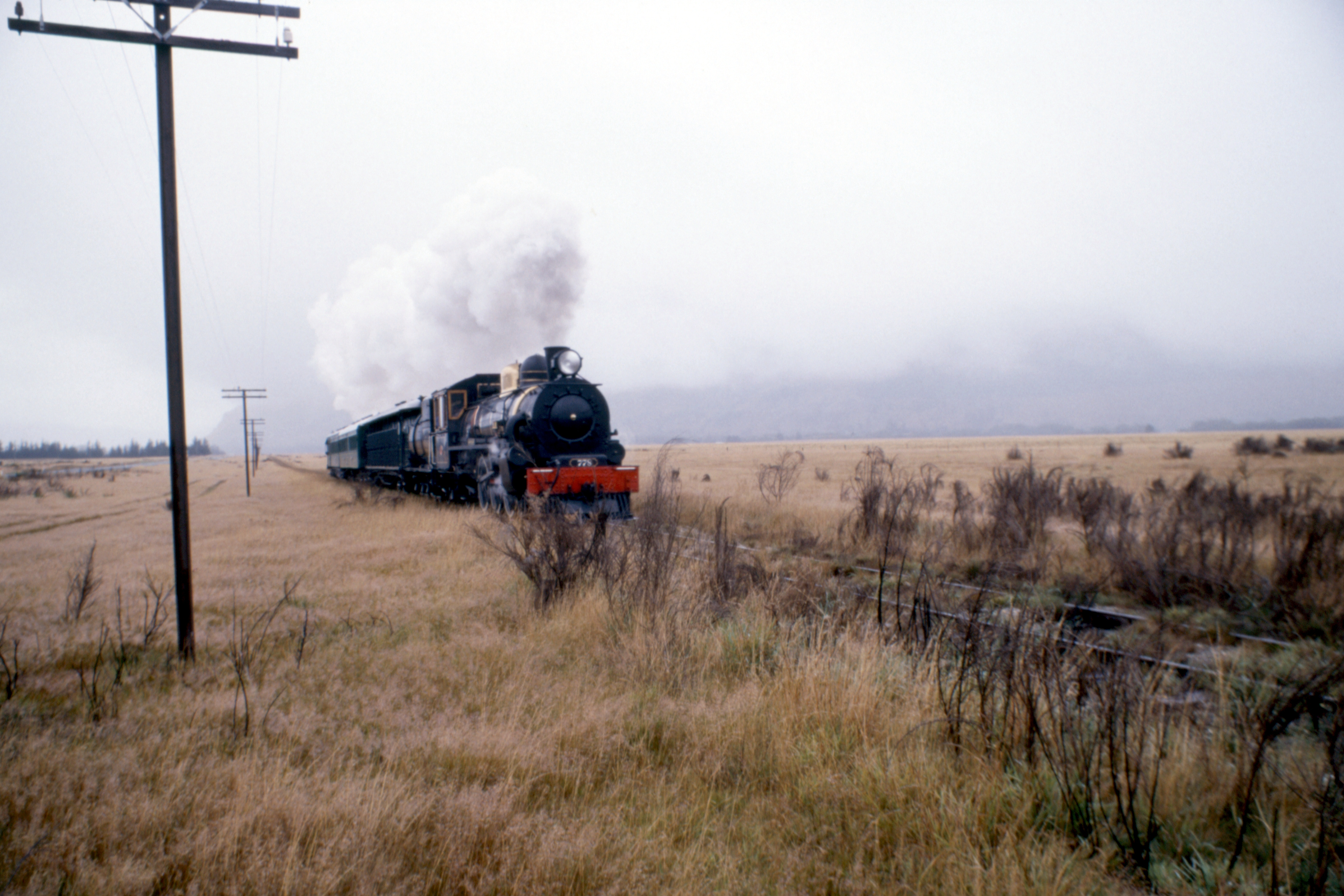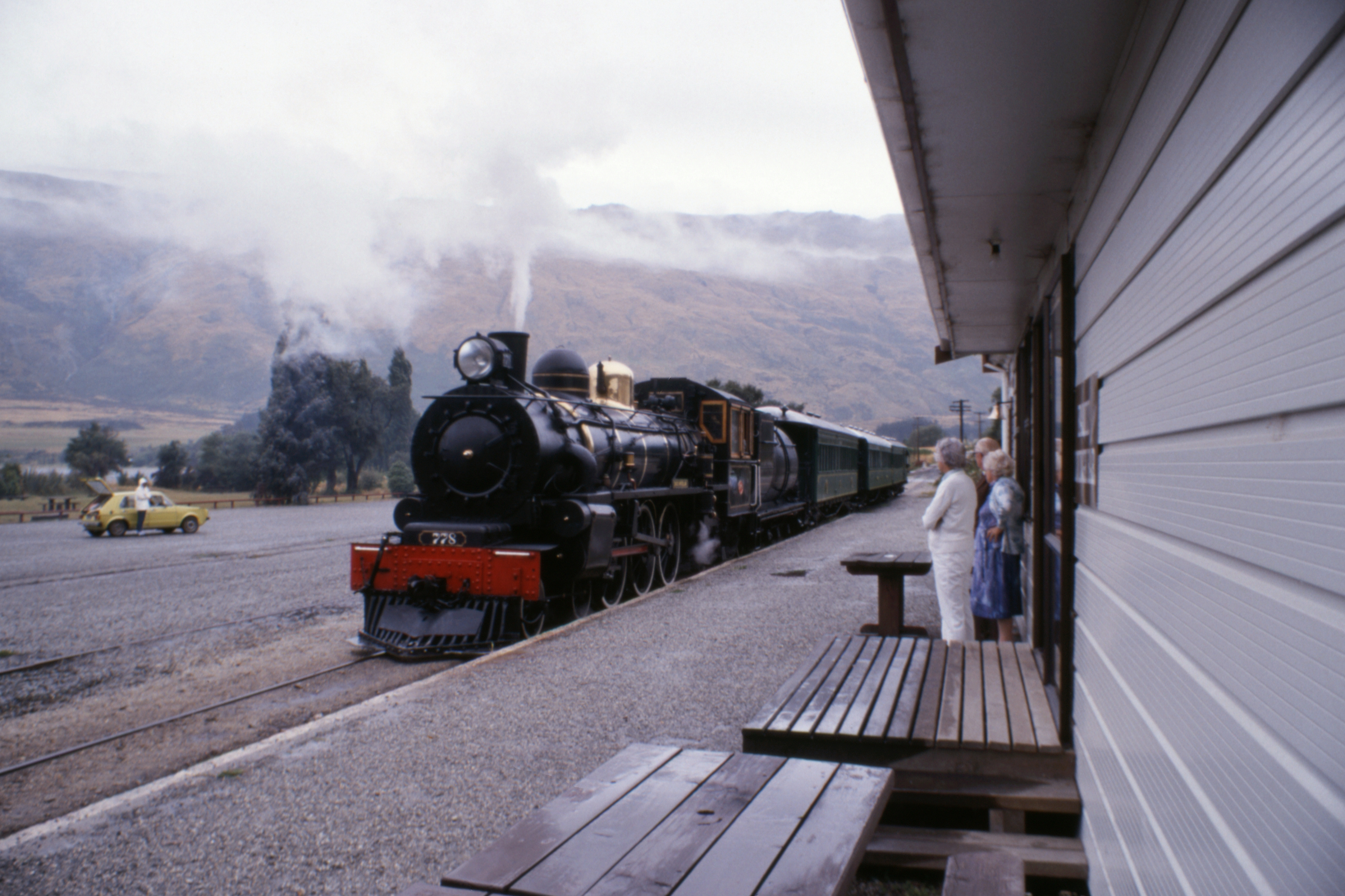A quick breakfast before the crowd got up then onto the road over Cardrona to Frankton, where I did not go into Queenstown but turned, instead, towards Kingston, home of the Kingston Flyer, where I arrived about half past ten to find a deserted station, an un-fired engine in the shed and three coaches in a siding. Then I saw the small sign, “train departs 1000, returns 1115”, so I leapt into the car and headed towards Fairlight, the other end of the trip, in the hopes of getting a lineside shot of the returning train (even though it was still drizzling).