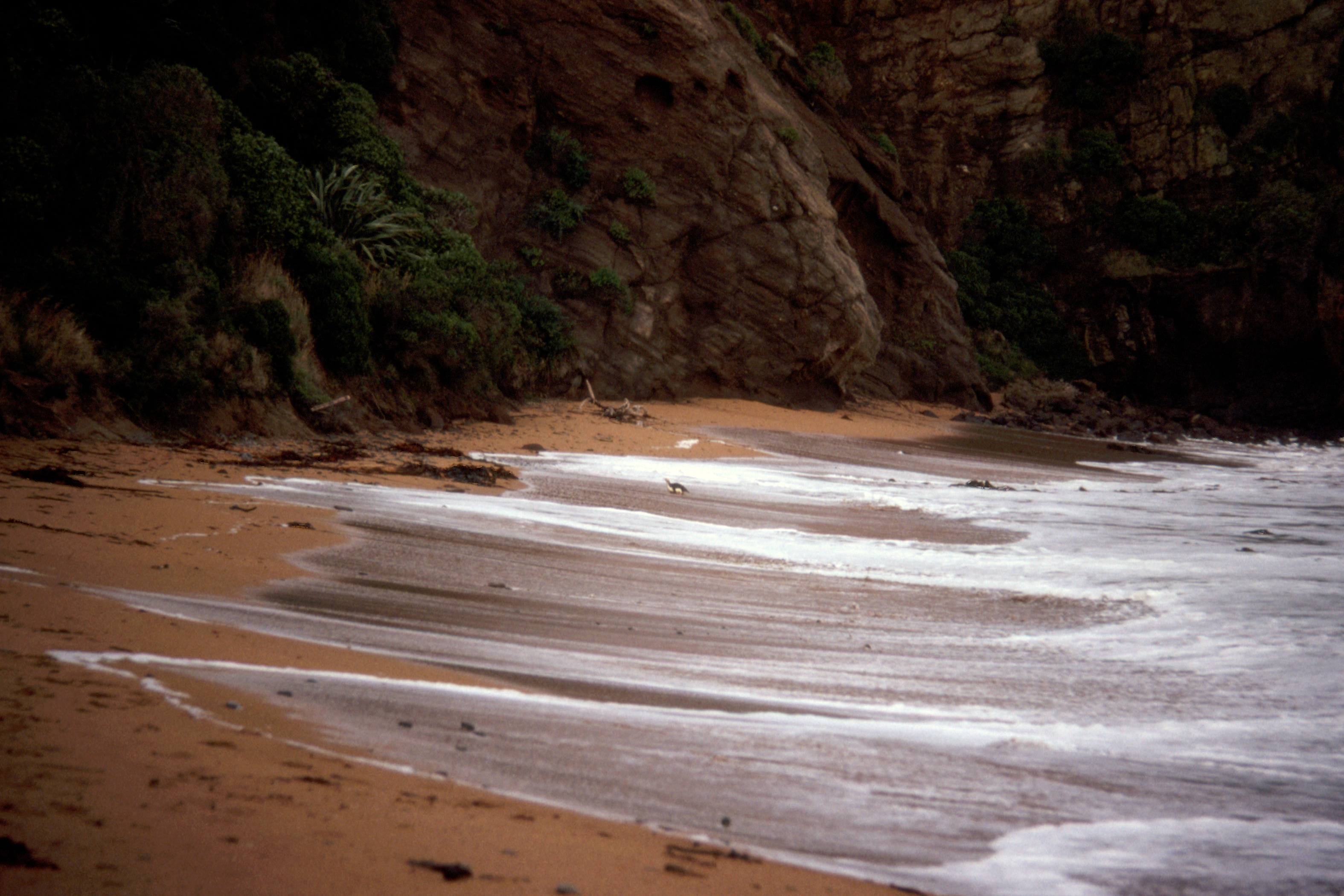 After booking in to the Red Kettle (the YH), I went off to Bushey Beach in the hopes of seeing some penguins, which nest in the bush behind the beach. They go out to sea in the morning and return, sometimes, at dusk. The surf was “energetic”, the tide was high, and I was beginning to think I was on a fool’s errand when, just before eight o’clock, one appeared at the edge of the surf, lurched to it’s feet and was into the bush before I got the camera out. (The camera was zipped inside my jacket out of the way of the occasional raindrops.) About ten minutes later, another one appeared and this time I did get the camera going, although the light was marginal and the bird was a fair distance away. Still, we’ll see what develops.