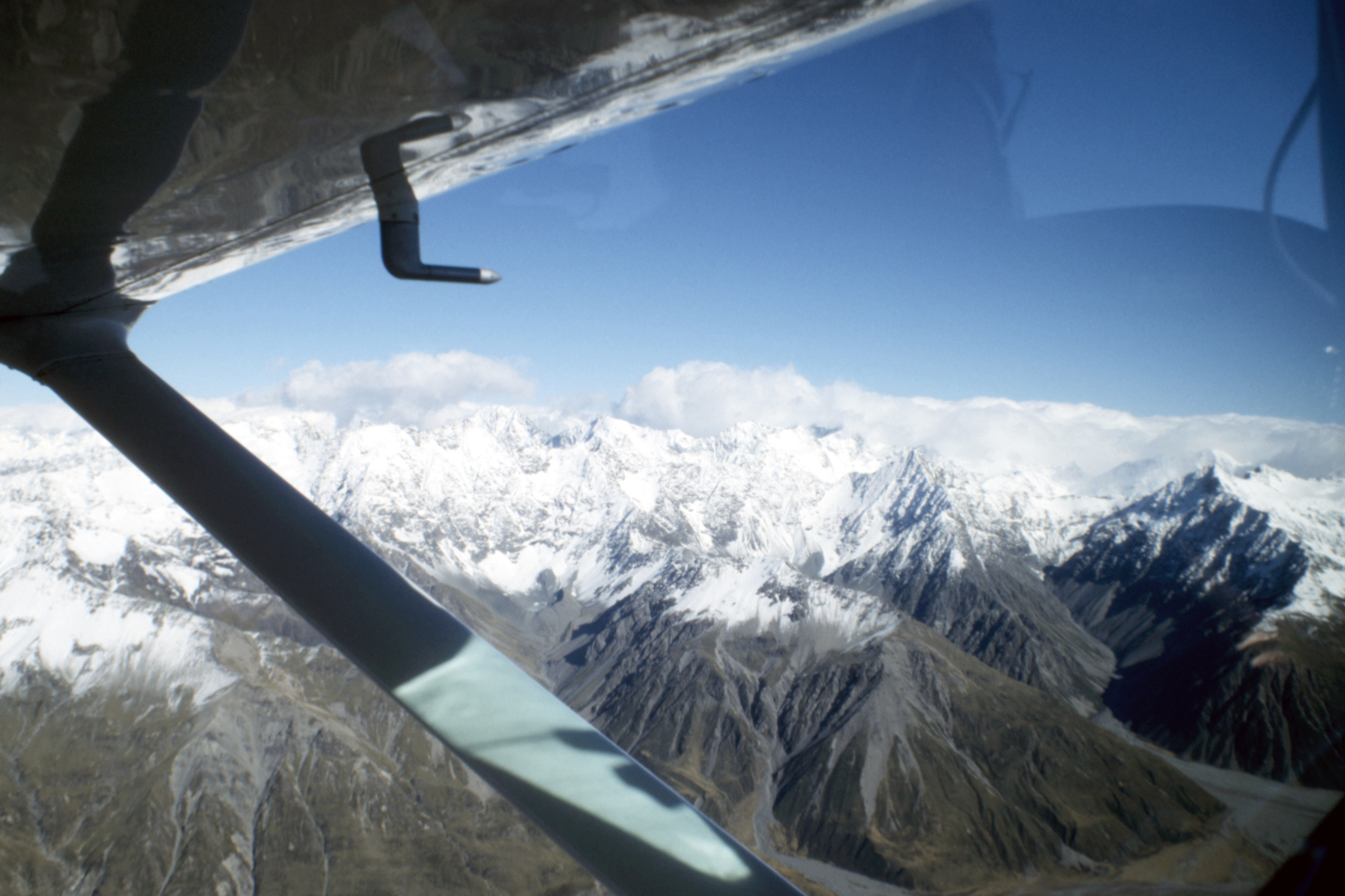We took off first and headed up over Lake Tekapo and the Godley River where streams of glacial meltwater have created a fantastic braided pattern through the millennia of deposited gravel which forms the flat bottom of a wide valley. There was a fair amount of turbulence when we turned into the mountains and the pilot decided to cut short the usual route and just flew through the fringes. Still a magnificent experience, the mountains and glaciers were very impressive.
