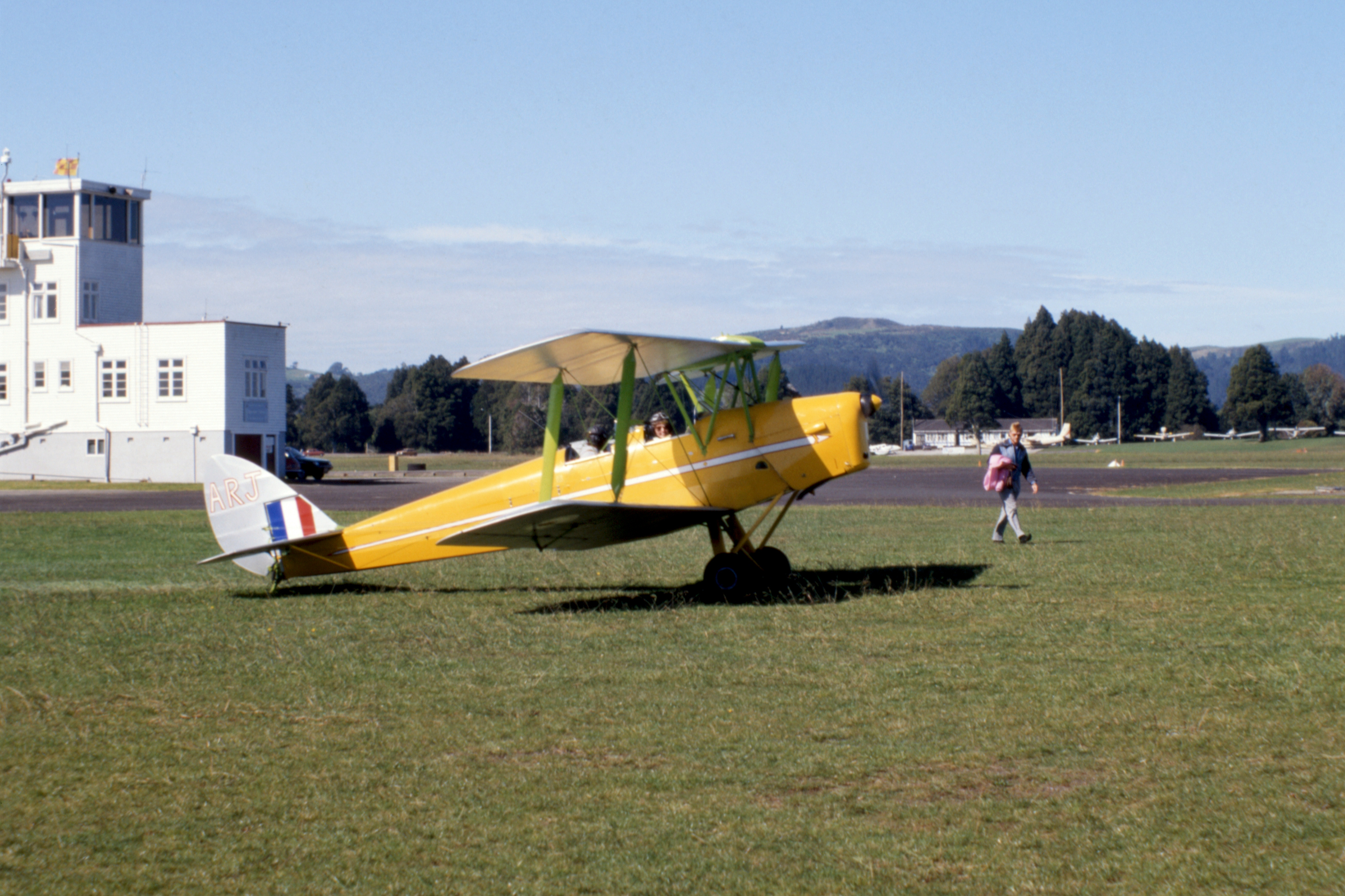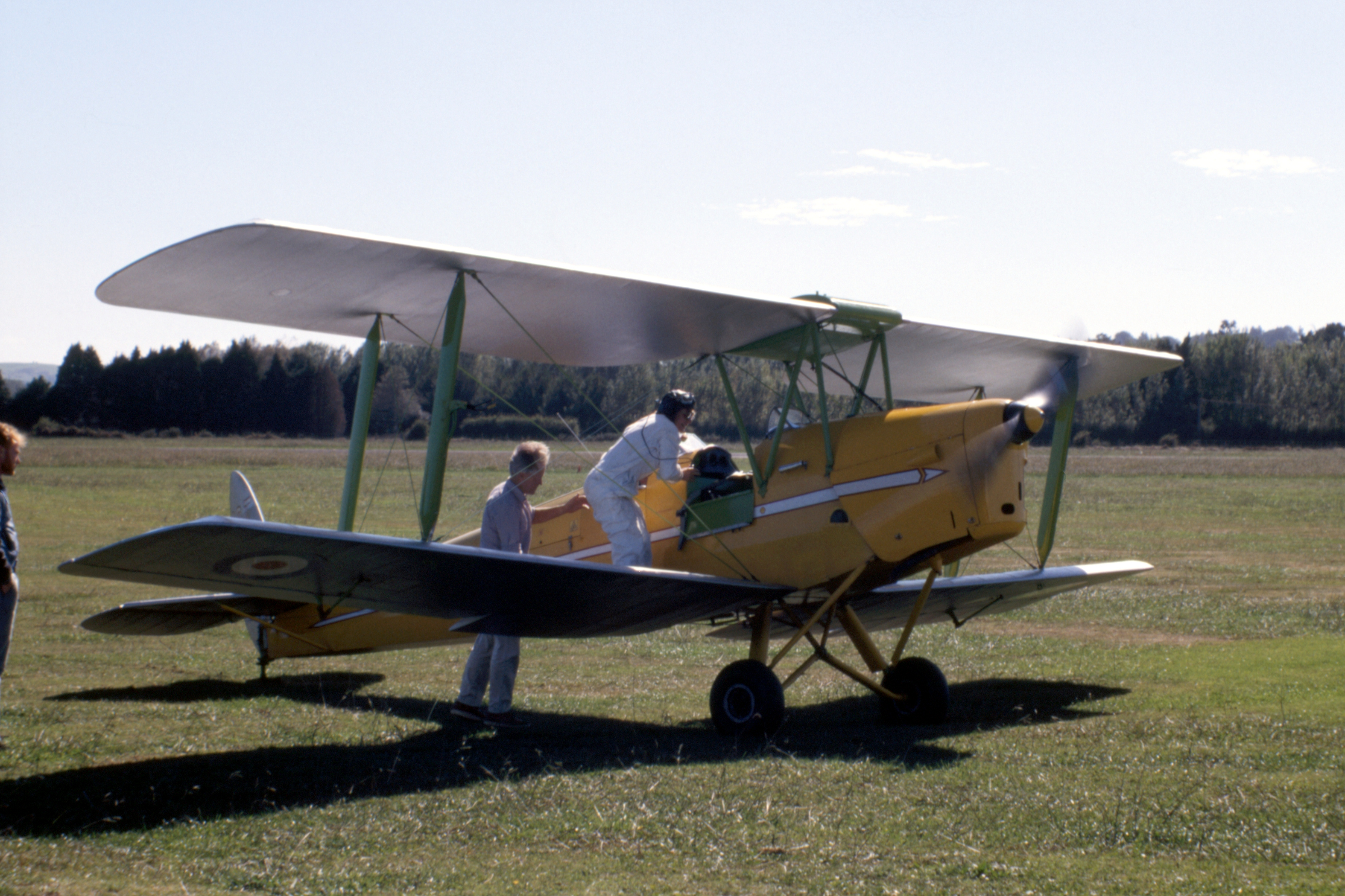 Al and Claudia had each booked a flight, one at a time, in a Tiger Moth flying from Ardmore in South Auckland, as their anniversary (11 April) present to each other. It had been scheduled for last weekend but was cancelled due to adverse weather conditions. Today was fine and sunny (what happened to the cyclone?) so out to the airfield. It costs $65 for about fifteen minutes flying time within the Ardmore training area. Apparently, the highlights are circling over the airfield and over the Country Club. Claudia was much impressed by the large houses and swimming pools over towards Clevedon.