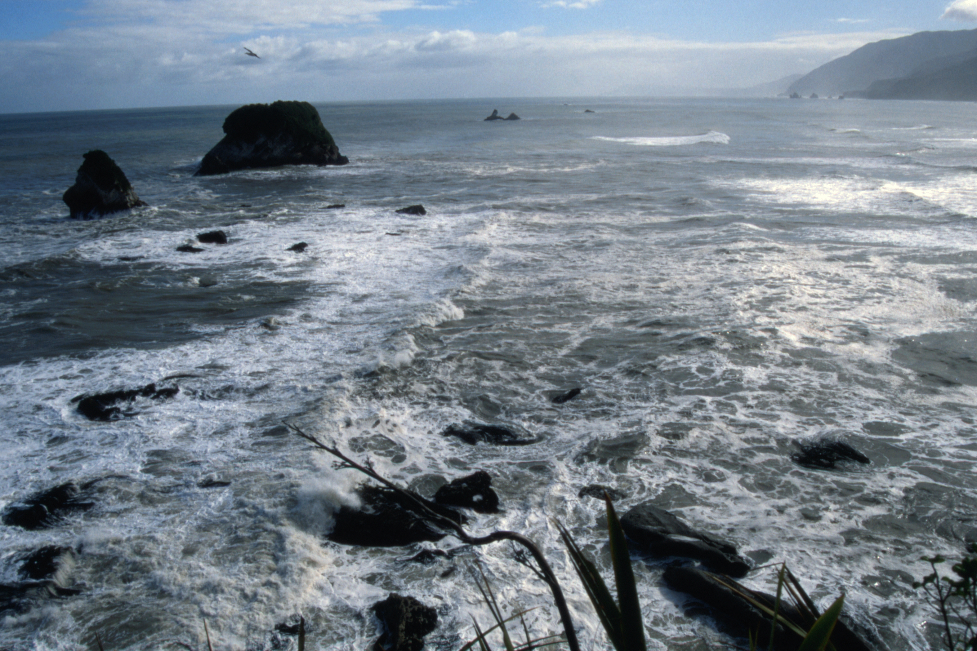 Our stop at Punakaiki was cut to twenty-five minutes, just time for a quick run round the Pancake Rocks without time to stop and stare. The blowholes were in better form than on my previous visits. Further north, I recognised a stretch of road where I’d taken a photograph ten years ago and could never remember the location. The answer is “Gentle Annie Rocks”.