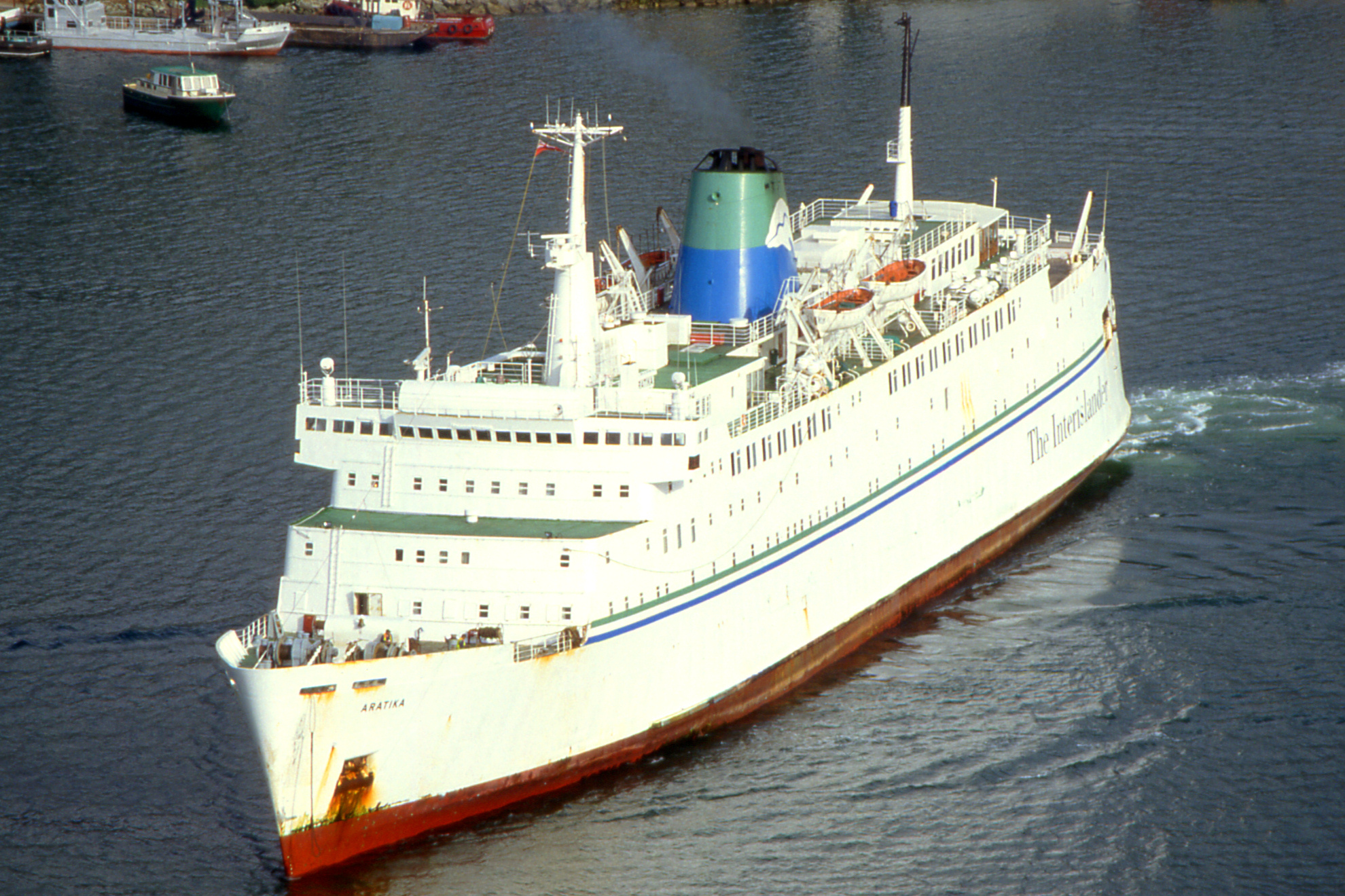 Then I walked out to The Snout at the end of the ridge, and back again, a little faster than was entirely comfortable in and hour and three quarters (against the advertised time of two and a half hours) as I wanted to watch the arrival of Arahura (7708 gross tonnes) followed by the former CalMac ferry Suilven (pronounced Sullivan here), now owned by Straits Shipping and registered in Wellington. She was in her day the largest CalMac boat, sailing across the Minch from Ullapool to Stornoway but she is only half the size of Arahura.