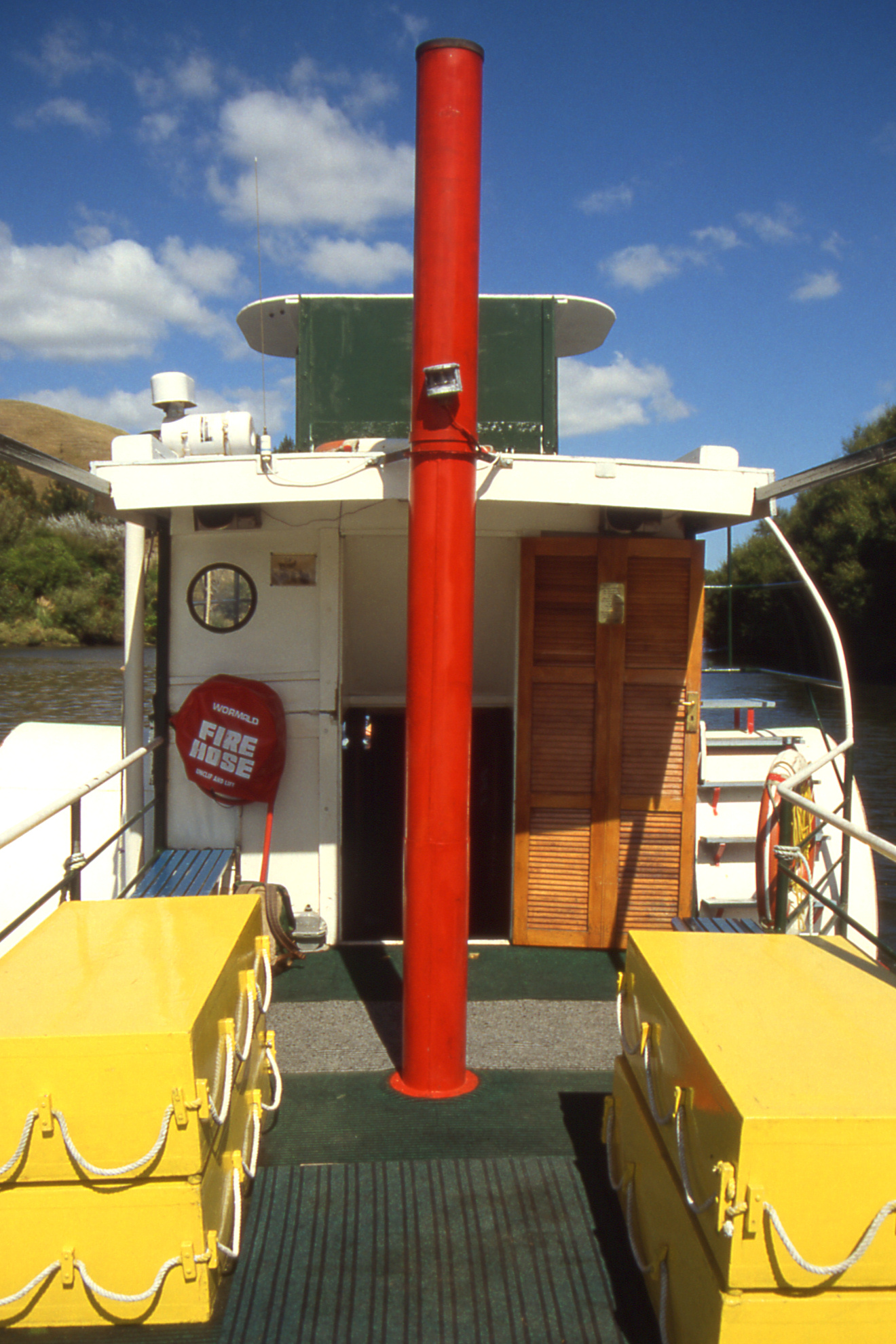The Paddle Wheeler Otunui turned up on time at the quay beside City Bridge just before eleven and there was indeed plenty of room, with only myself, another bloke and an elderly couple aboard. A nice little boat built in 1907, she was the first kerosene engined vessel bought by Hatricks (all their previous vessels had steam engines). We made steady progress up the river, though slow past the power boat racing between Dixon and the railway bridges, generally holding close to the inside bank on bends as the boat has a very shallow draught (being flat bottomed). The engine is fairly high revving (compared to a steam engine) and the paddles turn quickly but as the blades are quite small, speed is relatively slow.