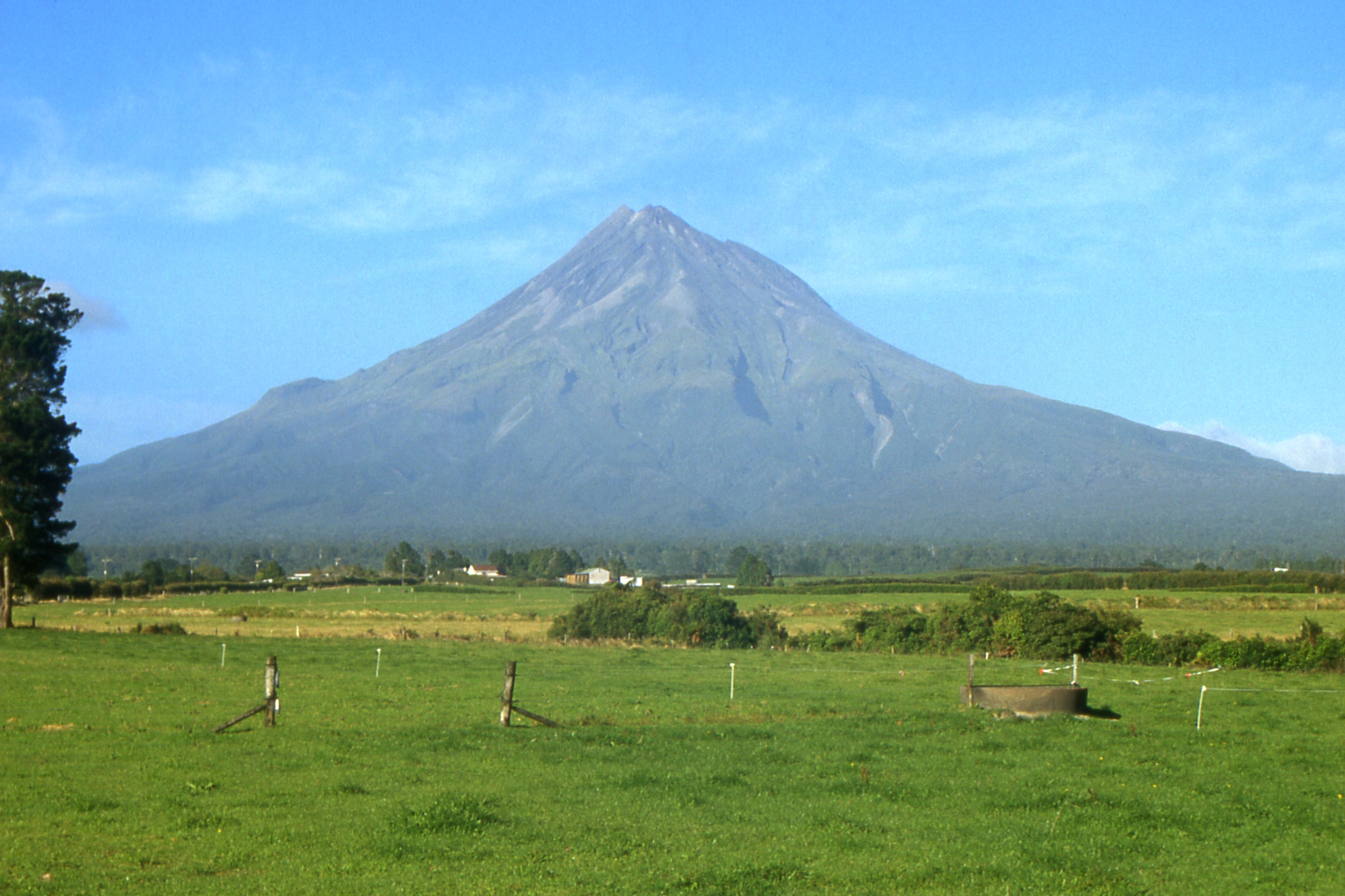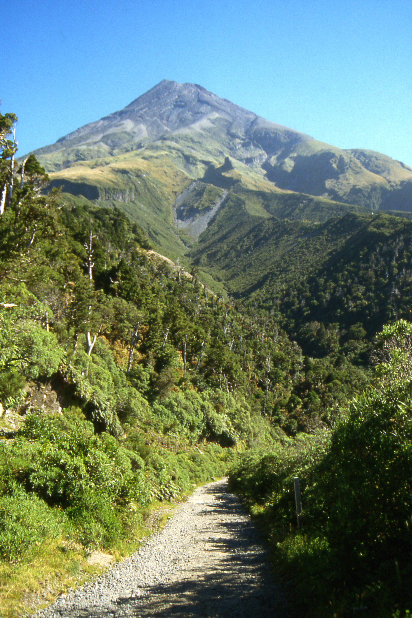 It was a cloudy morning. I tried to phone home but the phone demanded money when Daddy answered, despite my having inserted a phone card. On my way out of town, I stopped for a quick scramble up Paritutu (the name means “rising precipice” and it is), a small hillock behind the power station but the day was not clear and the views were disappointing; the power station and town were mirky and there was no sign of Taranaki at all.