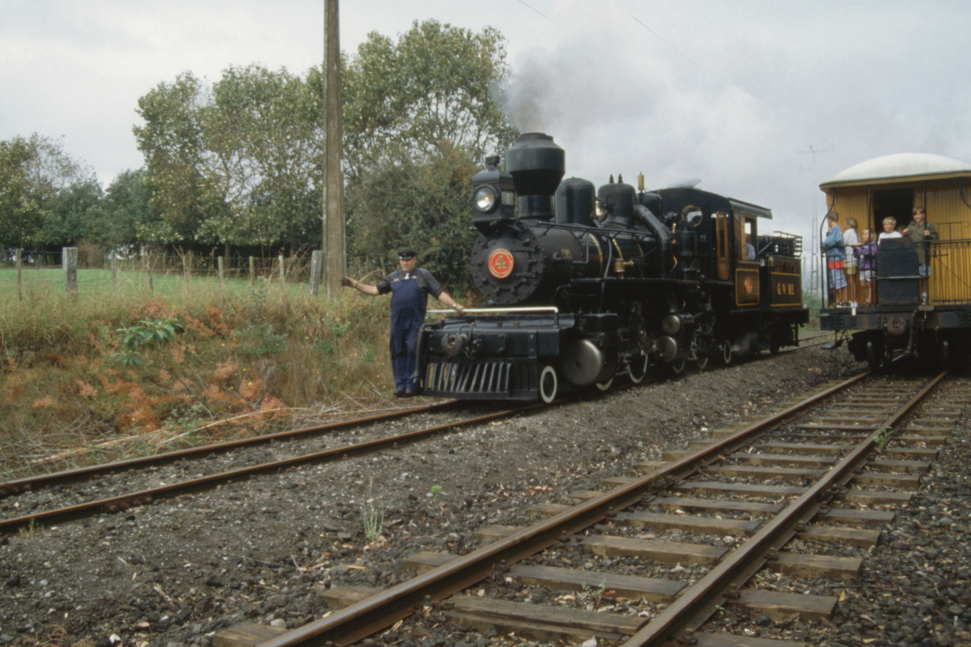 I turned off at the top for Pukekohe, straight through there and out the other side on to the Waiuku road. All clearly signposted as was the turning for Glenbrook. It was still raining when I got there at twenty past ten but a slight lull gave me the chance to make a dash for the (covered) platform. No.4 (the Mallet) is running today hauling one open wagon, one with side benches and a conventional coach. By the time the train left, the rain was off but I still decided to go in the conventional coach; the folk on the open wagon were black by the time we got to Fernleigh where I forgot to look for the new extension into Waiuku.
