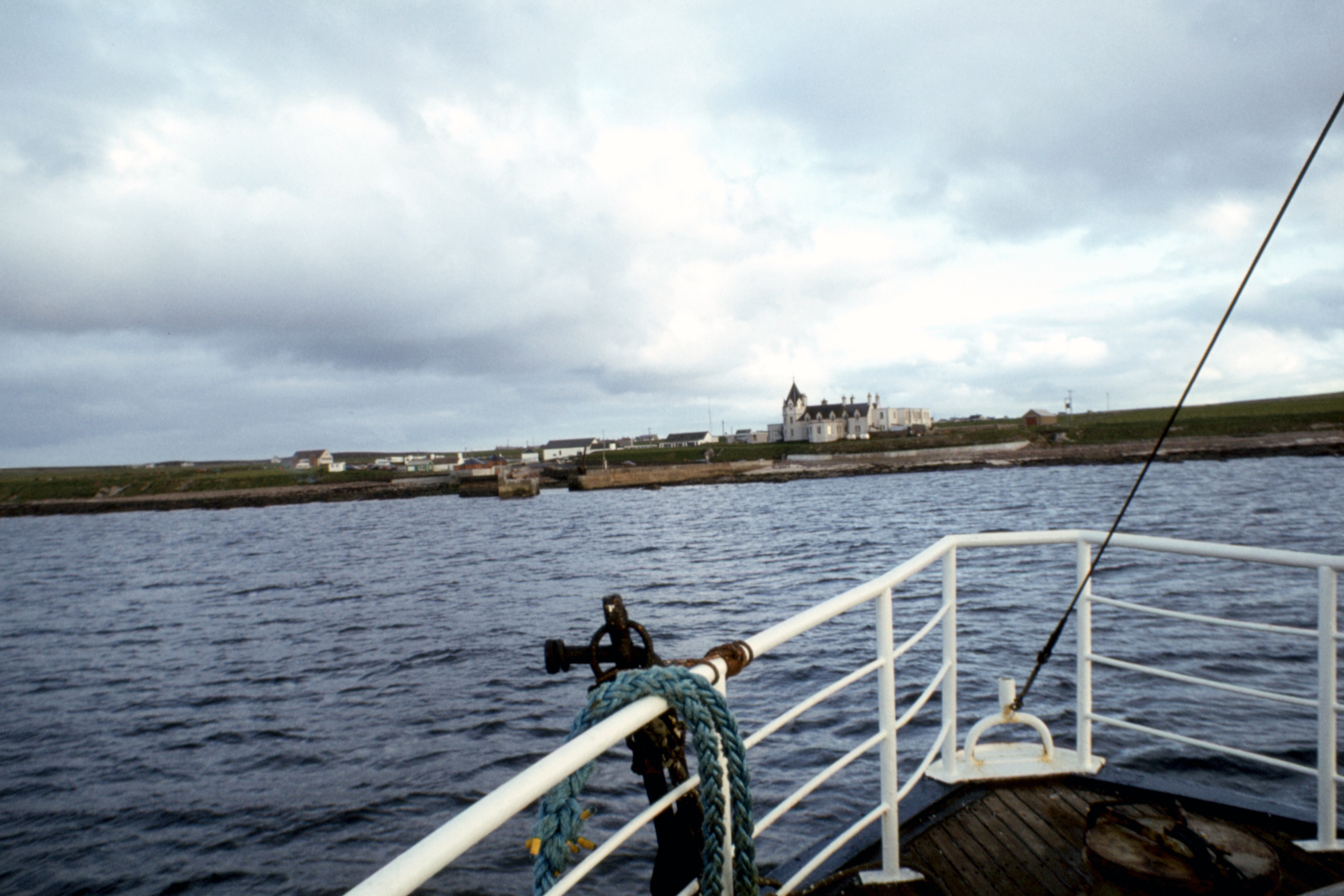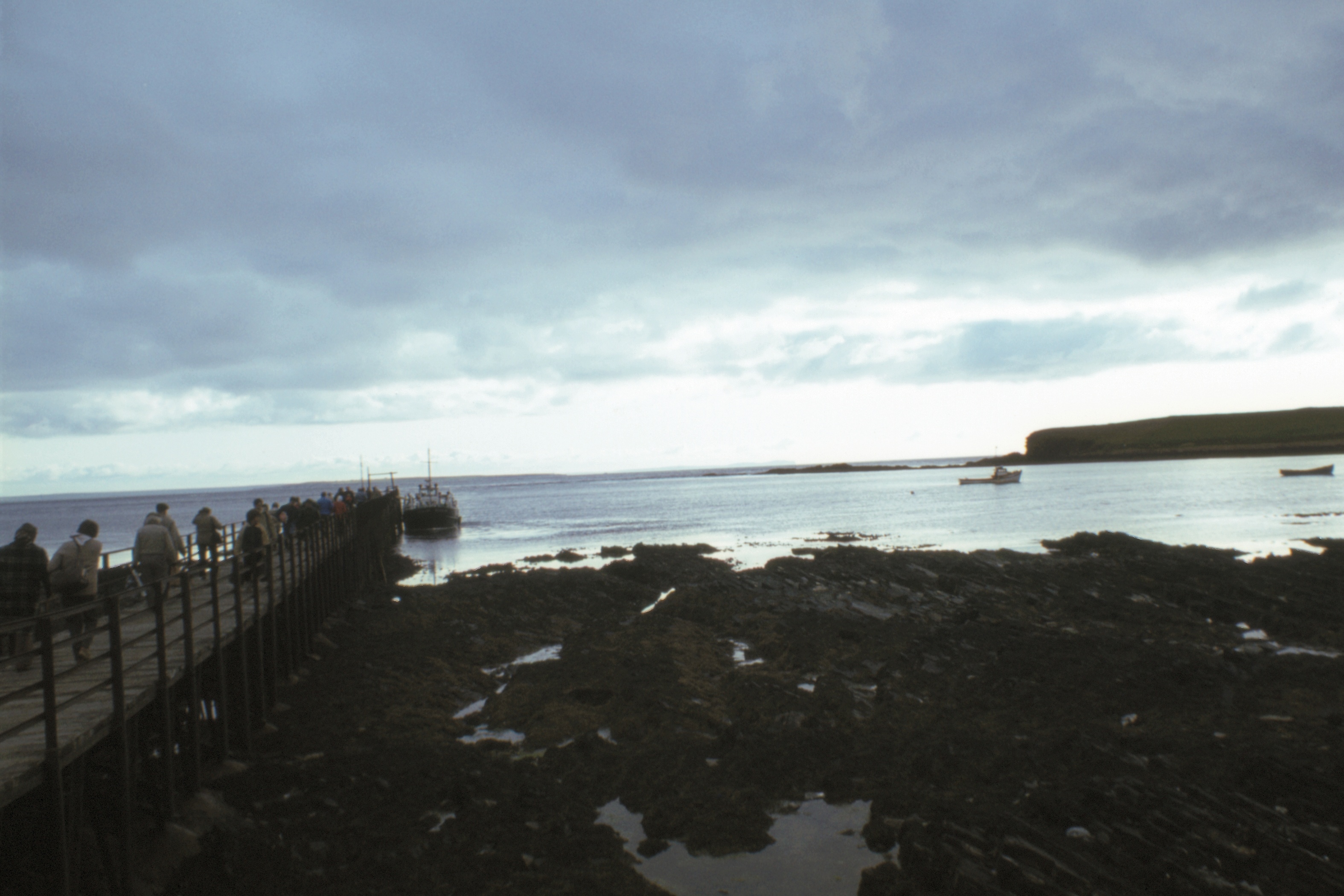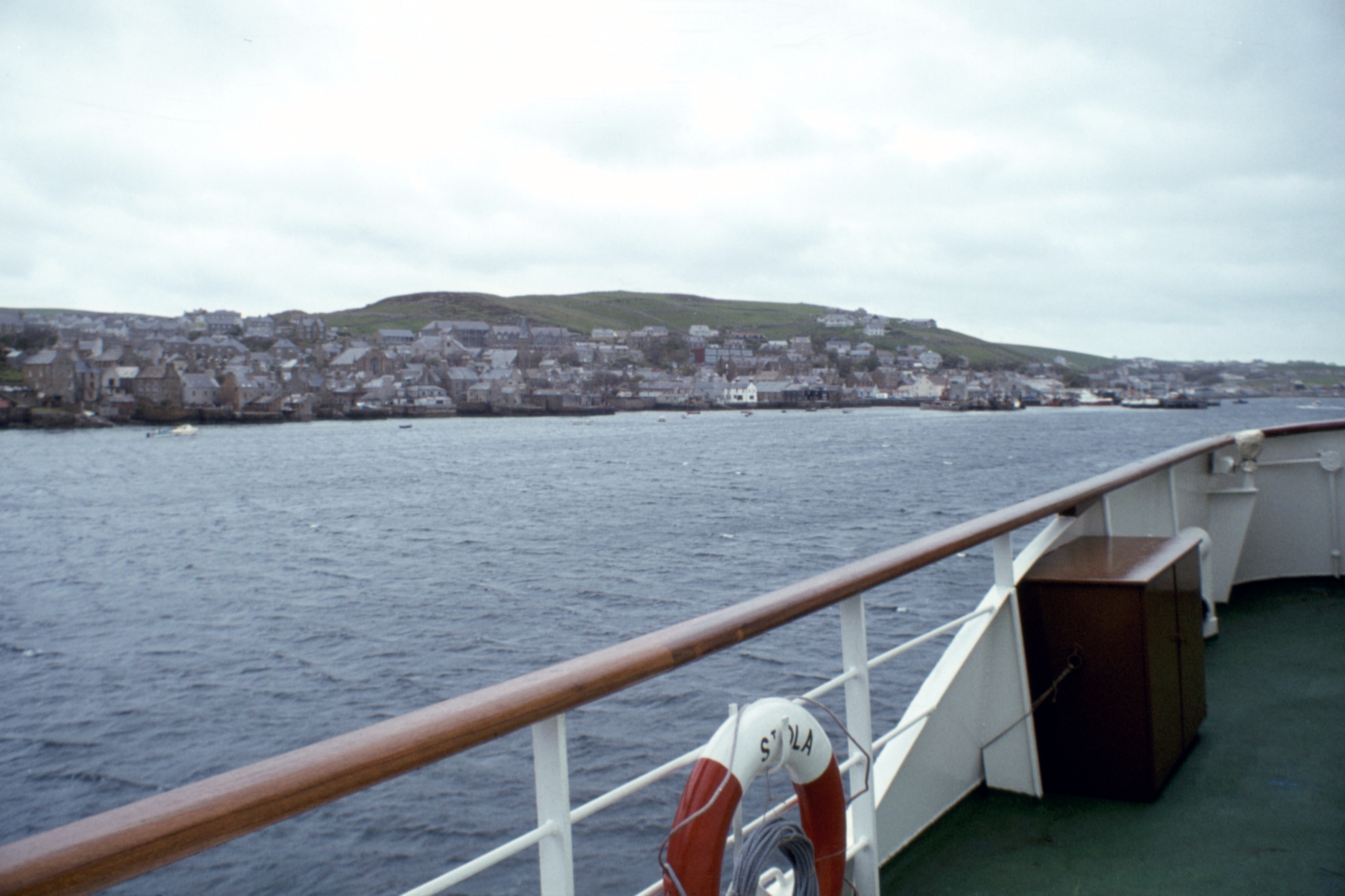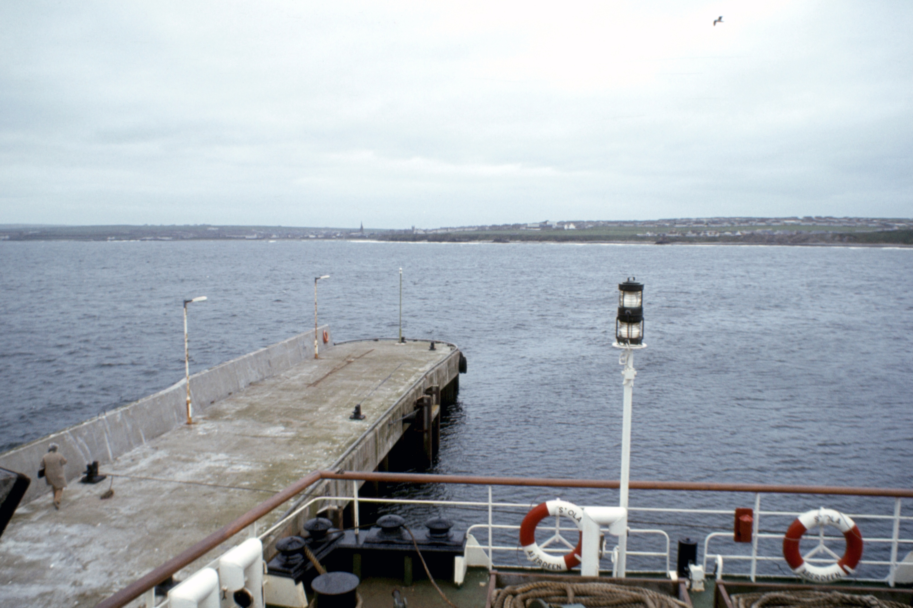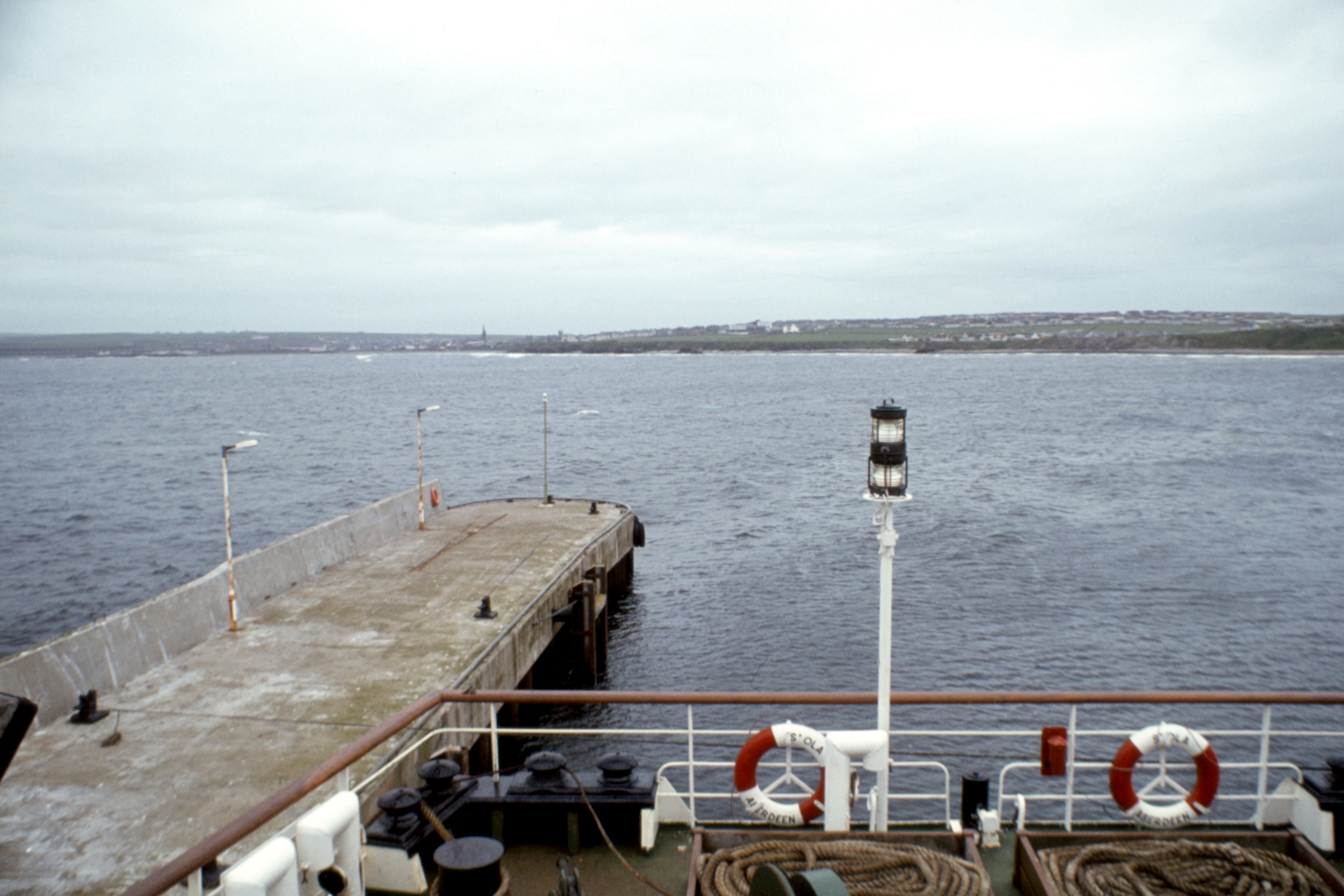 The train to Thurso was 23 minutes late at 09:32. I was in the wrong half of the train at Georgemass Junction (where it splits for Wick) and had to sprint along the platform. Luckily, the guard saw me and waited. Arrived at Thurso at 11:00 where the connecting bus to Scrabster left at 11:15 and reached the ferry at 11:30. The St Ola sailed at 12:00 and arrived at Stromness at 14:00. The Youth Hostel was over-full (I didn't know it was the weekend of the Orkney Folk Festival) but I found a bed at Brown's Hostel (�2.00).