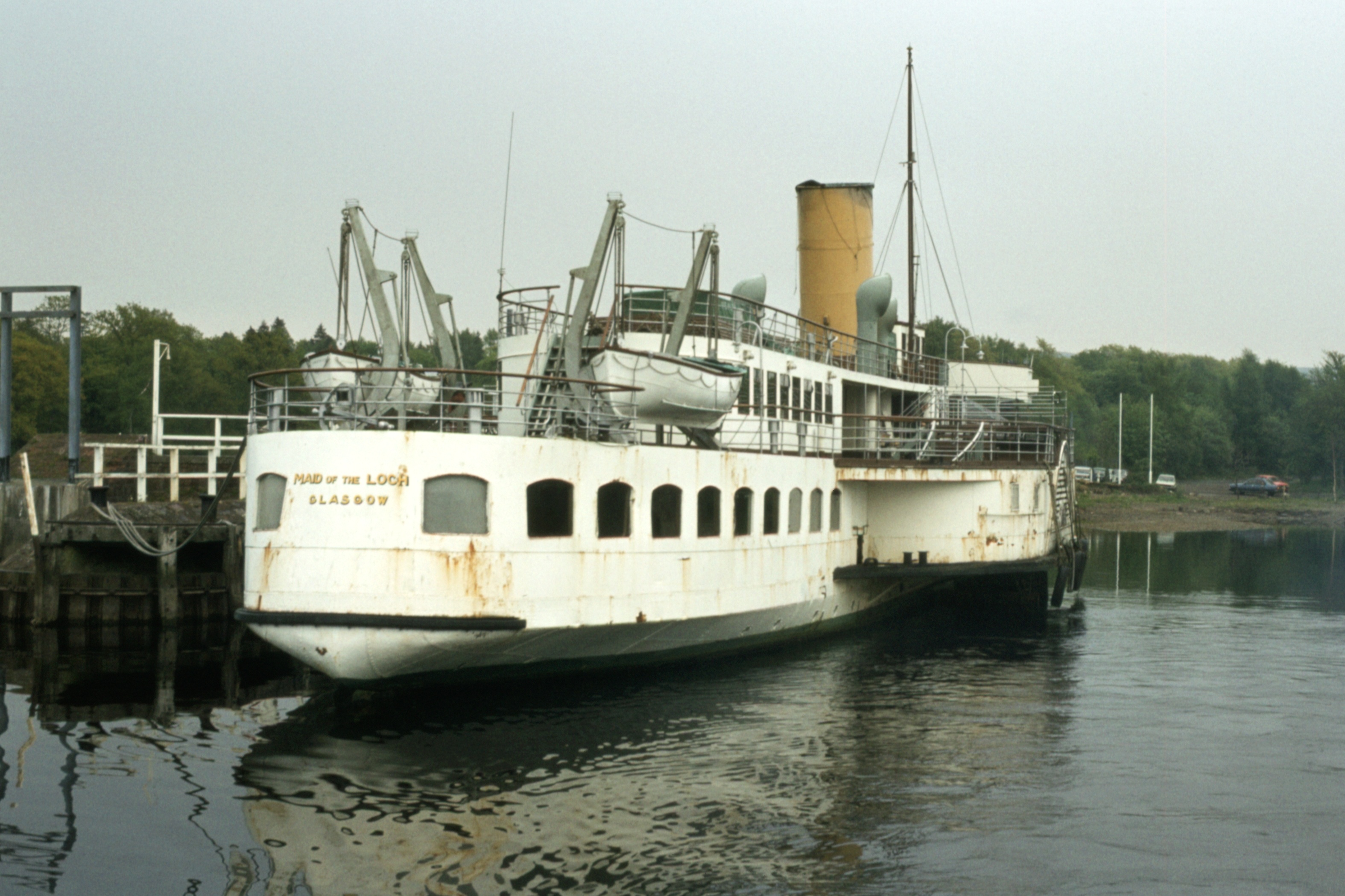Stern view of a dilapidated "Maid of the Loch" at Balloch Pier