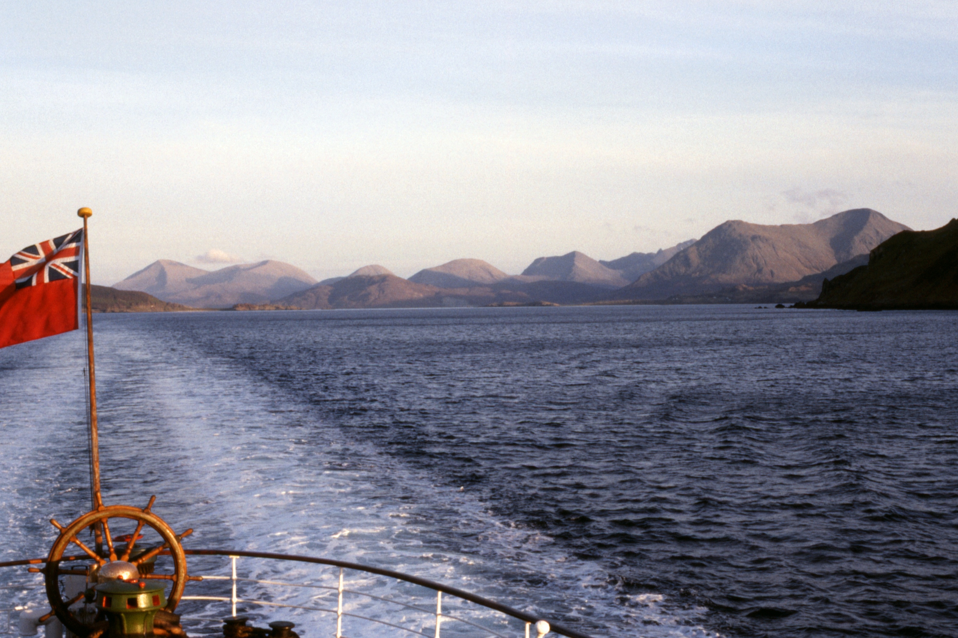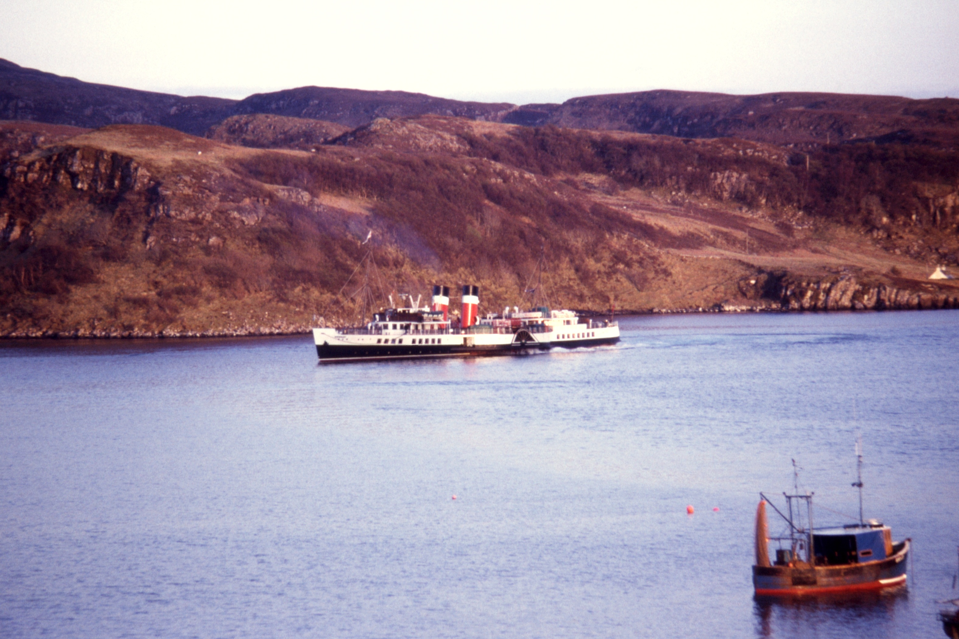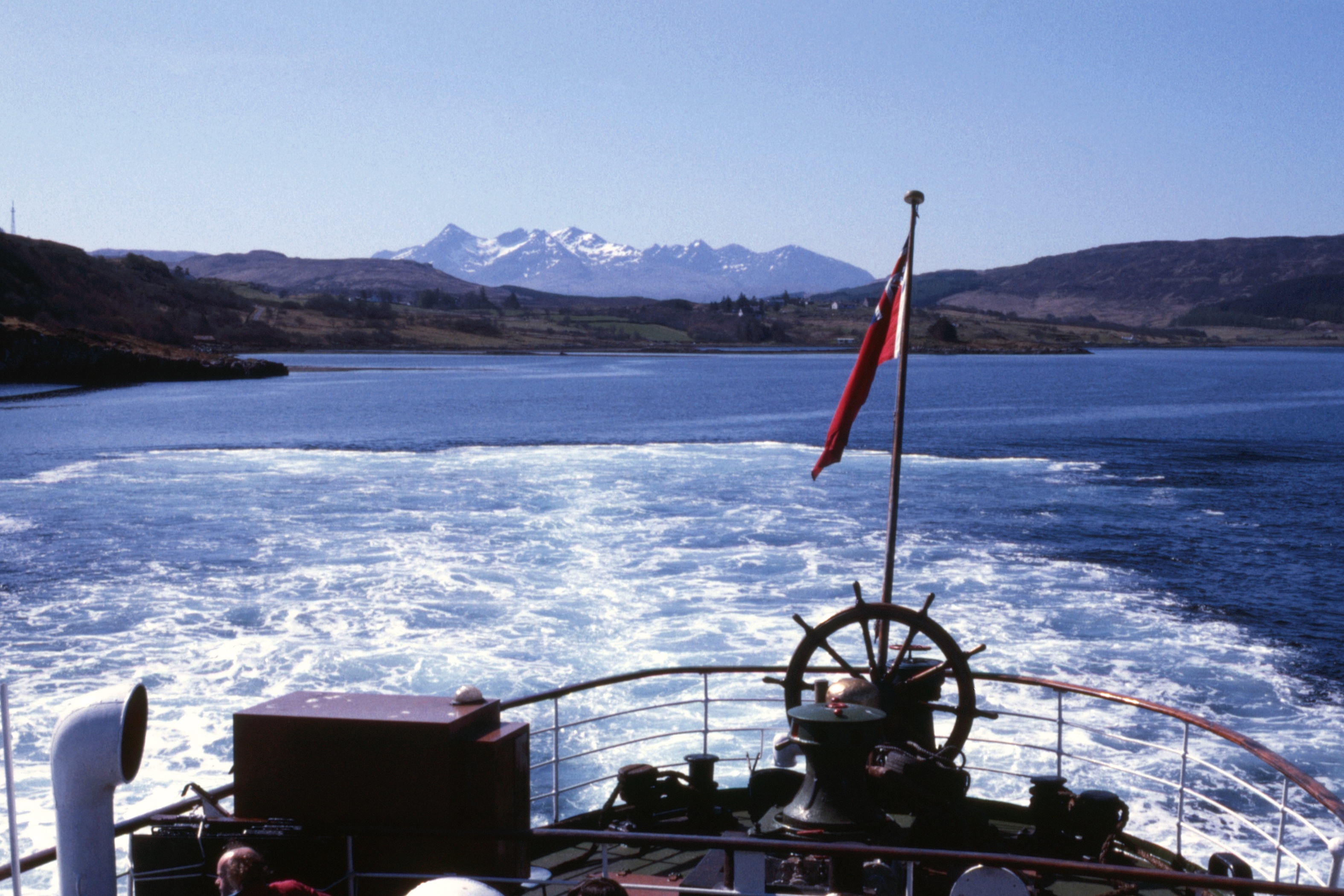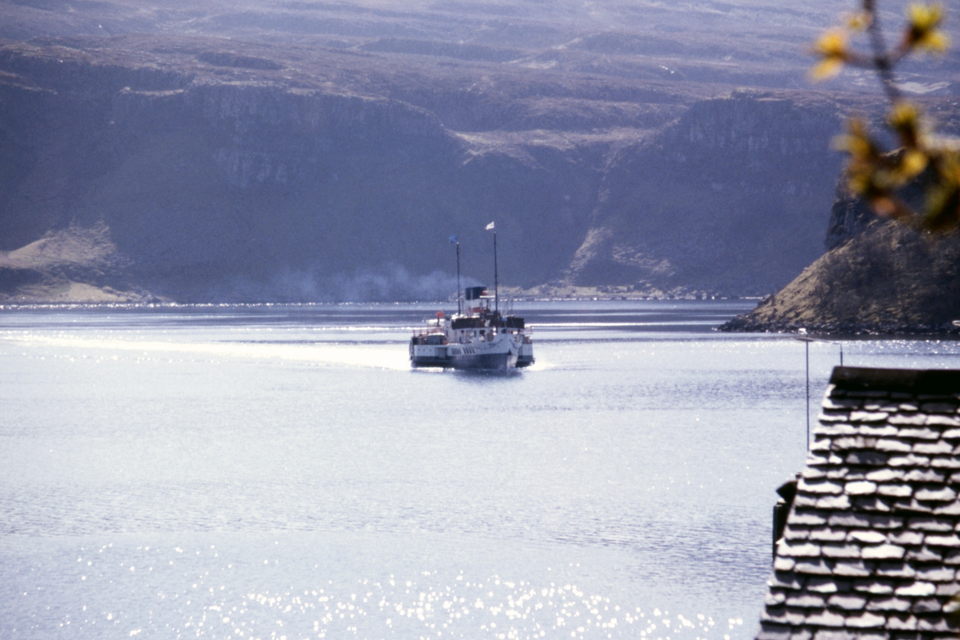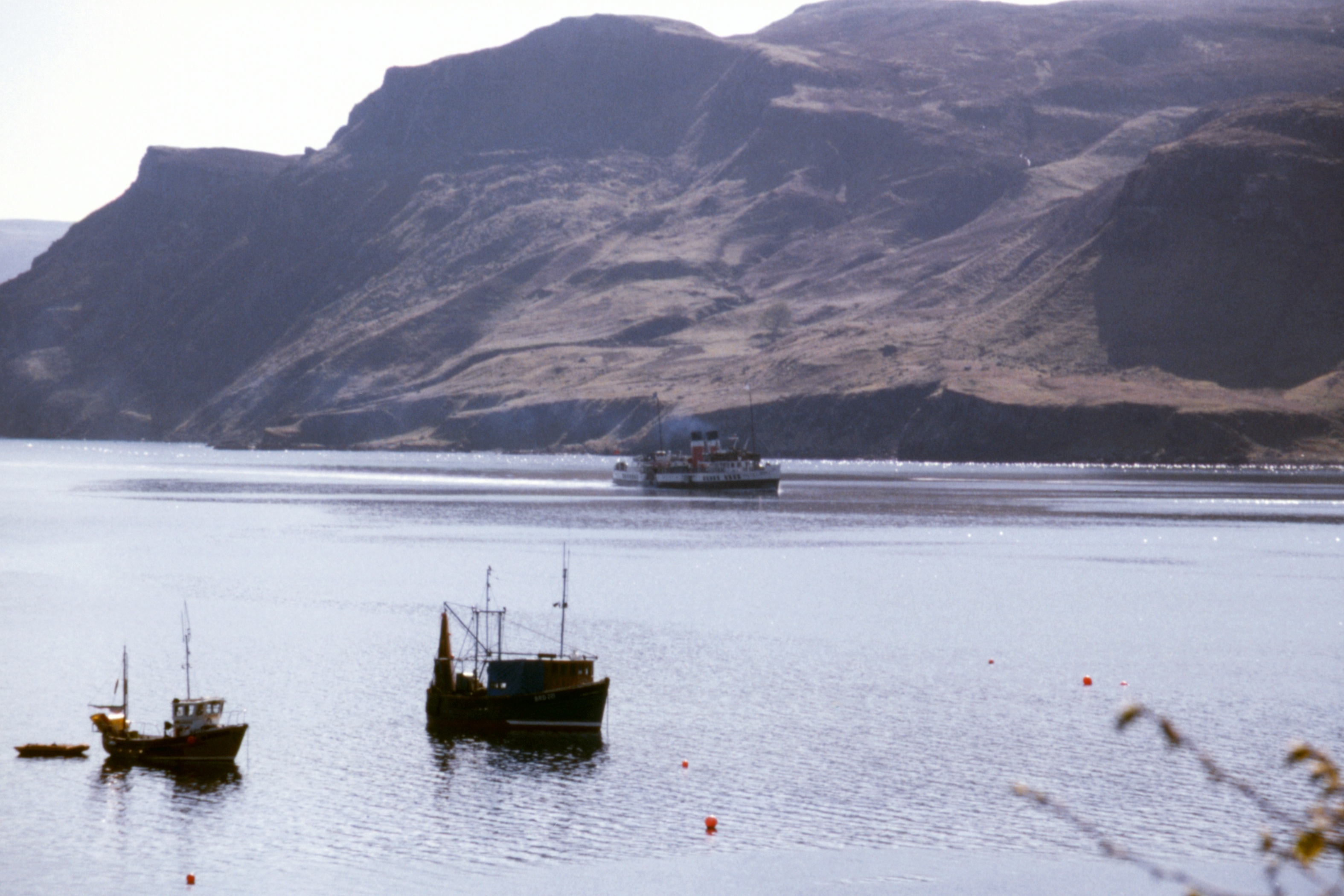Day 9 - Saturday, May 6 - We sailed south from Stornoway along the east coast of Lewis and Harris, had a rendezvous en route with the Stornoway Coastguard helicopter which practised putting a man on the aft deck (and took off the purser temporarily) before calling at Tarbert. Then it was across the Minch and round the north of Skye to Portree. Then a cruise south past Raasay and on as far as Kylerhea before returning to Portree. Waverley then sailed light to Kyle for the night to refuel.
