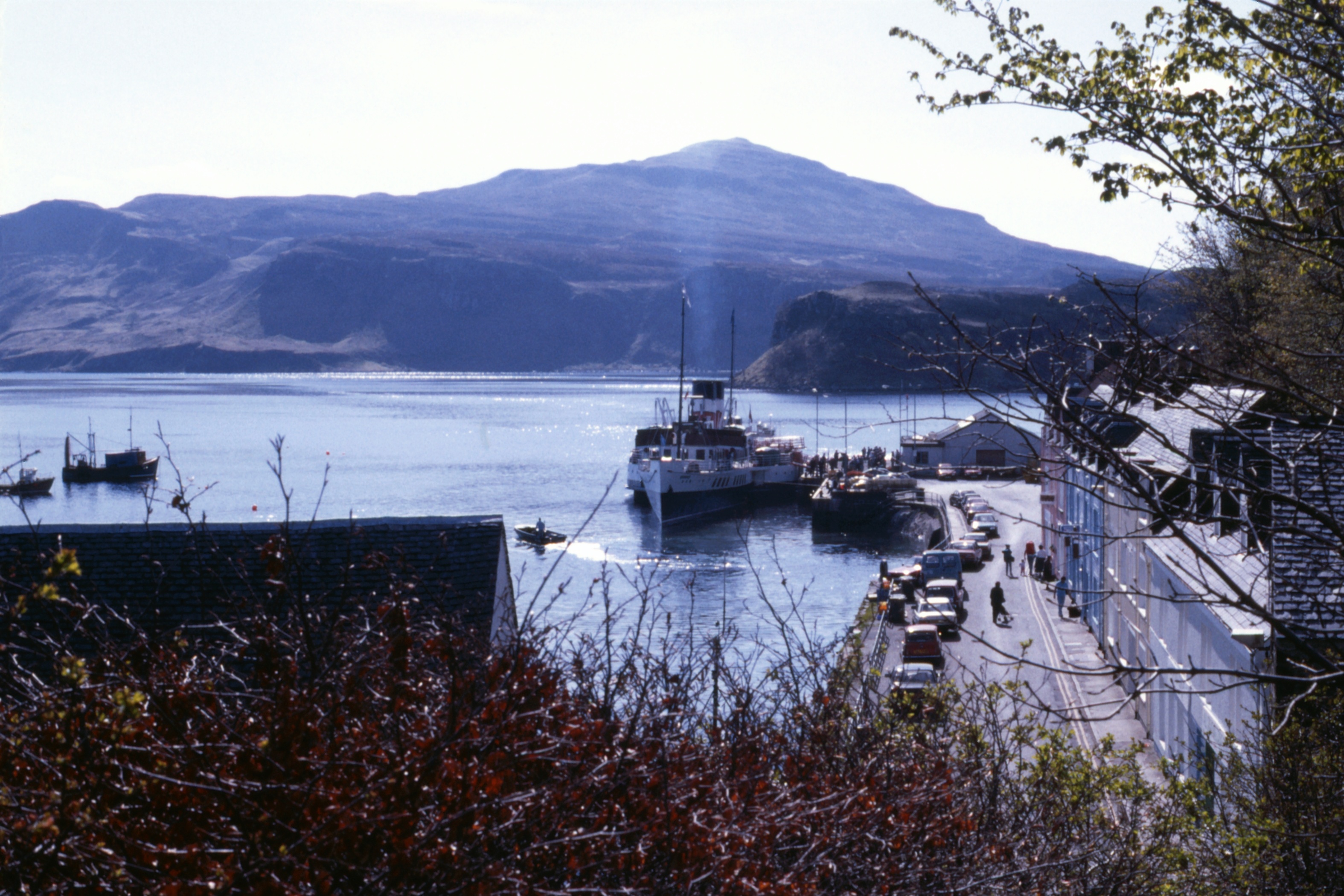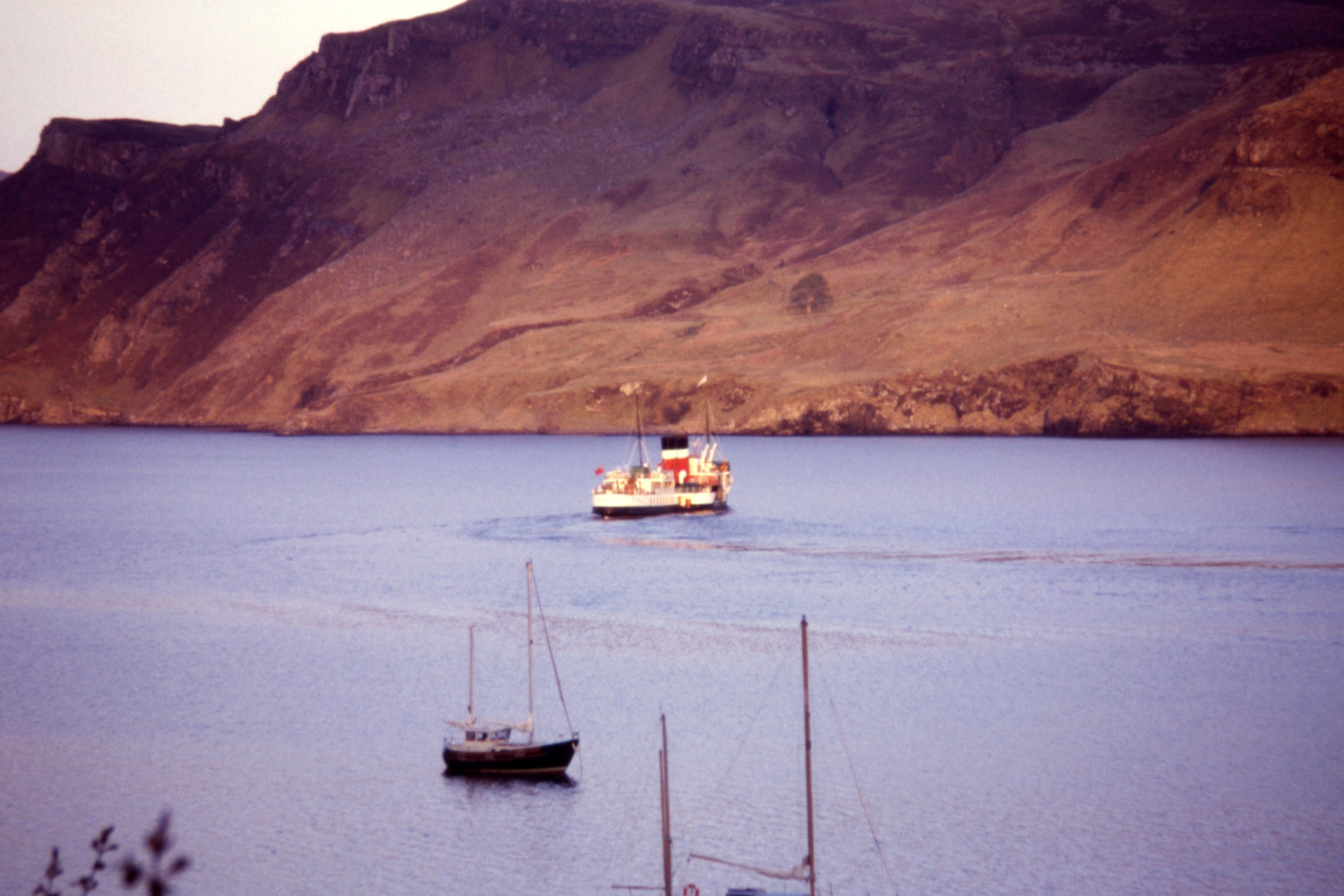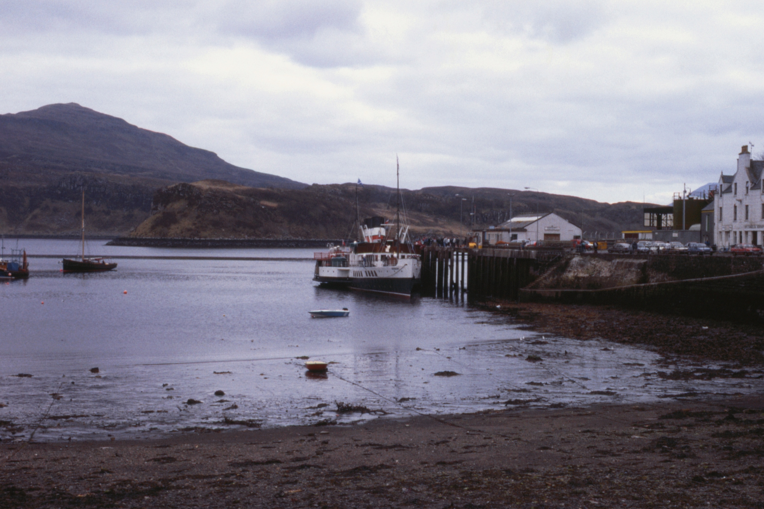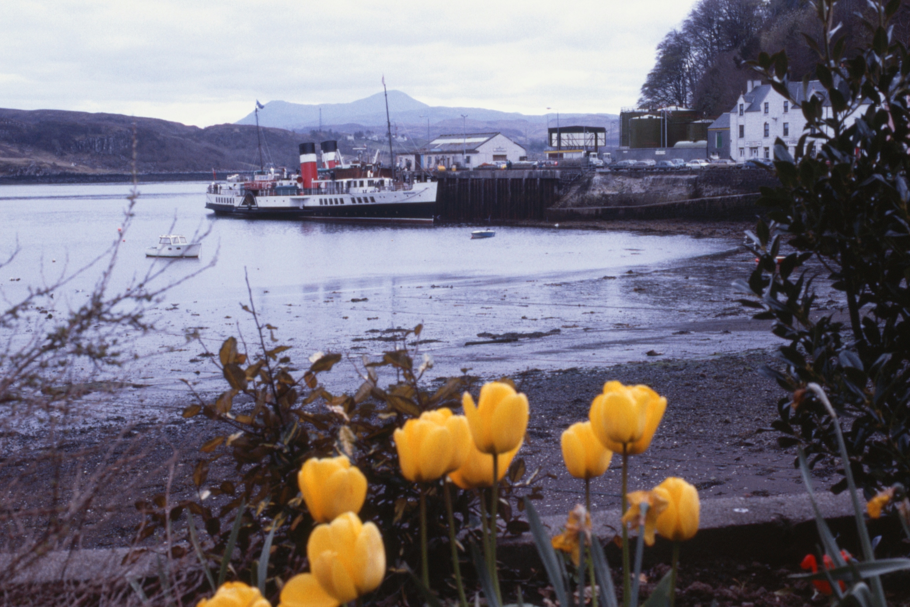 Day 9 - Saturday, May 6 - We sailed south from Stornoway along the east coast of Lewis and Harris, had a rendezvous en route with the Stornoway Coastguard helicopter which practised putting a man on the aft deck (and took off the purser temporarily) before calling at Tarbert. Then it was across the Minch and round the north of Skye to Portree. Then a cruise south past Raasay and on as far as Kylerhea before returning to Portree. Waverley then sailed light to Kyle for the night to refuel.
