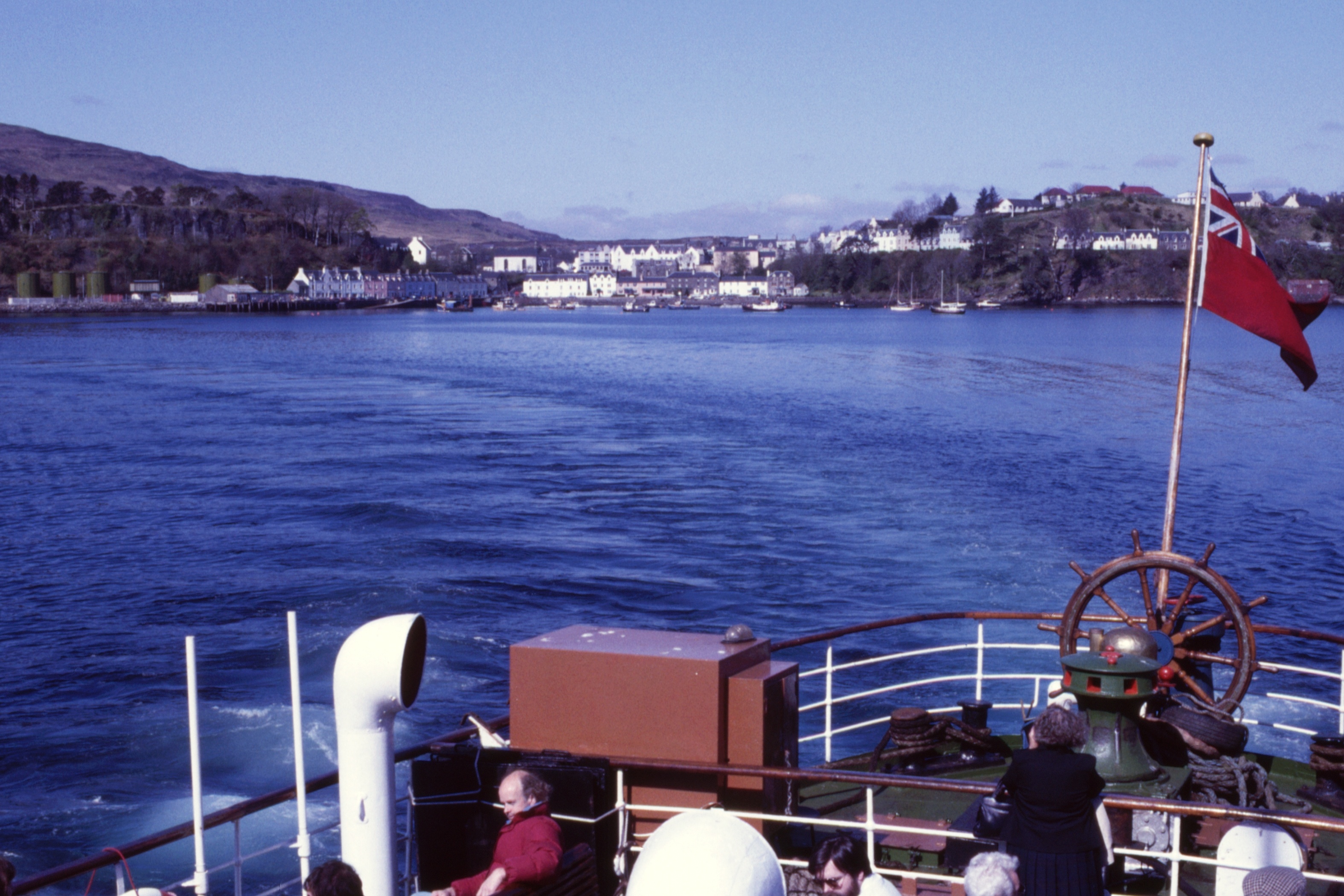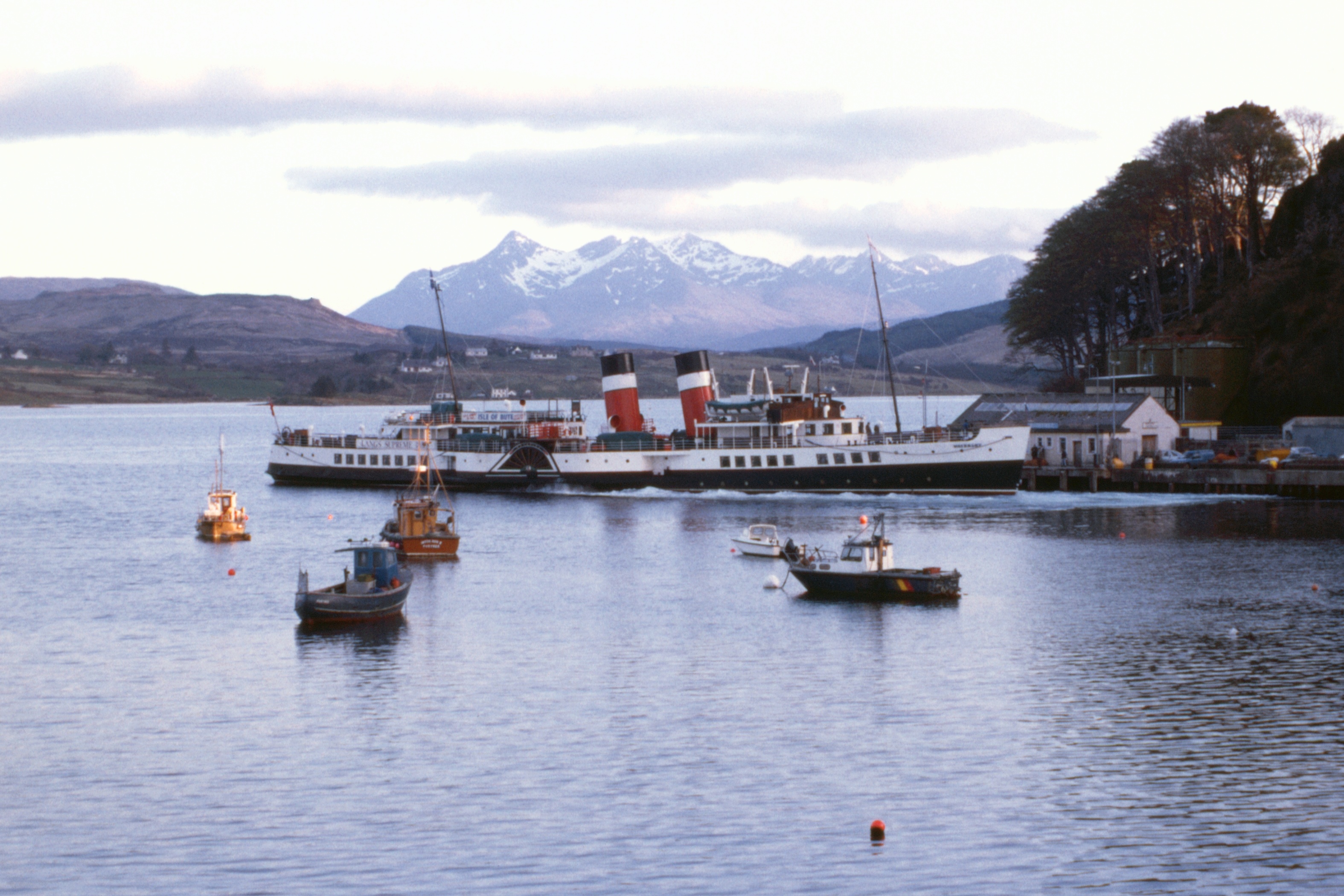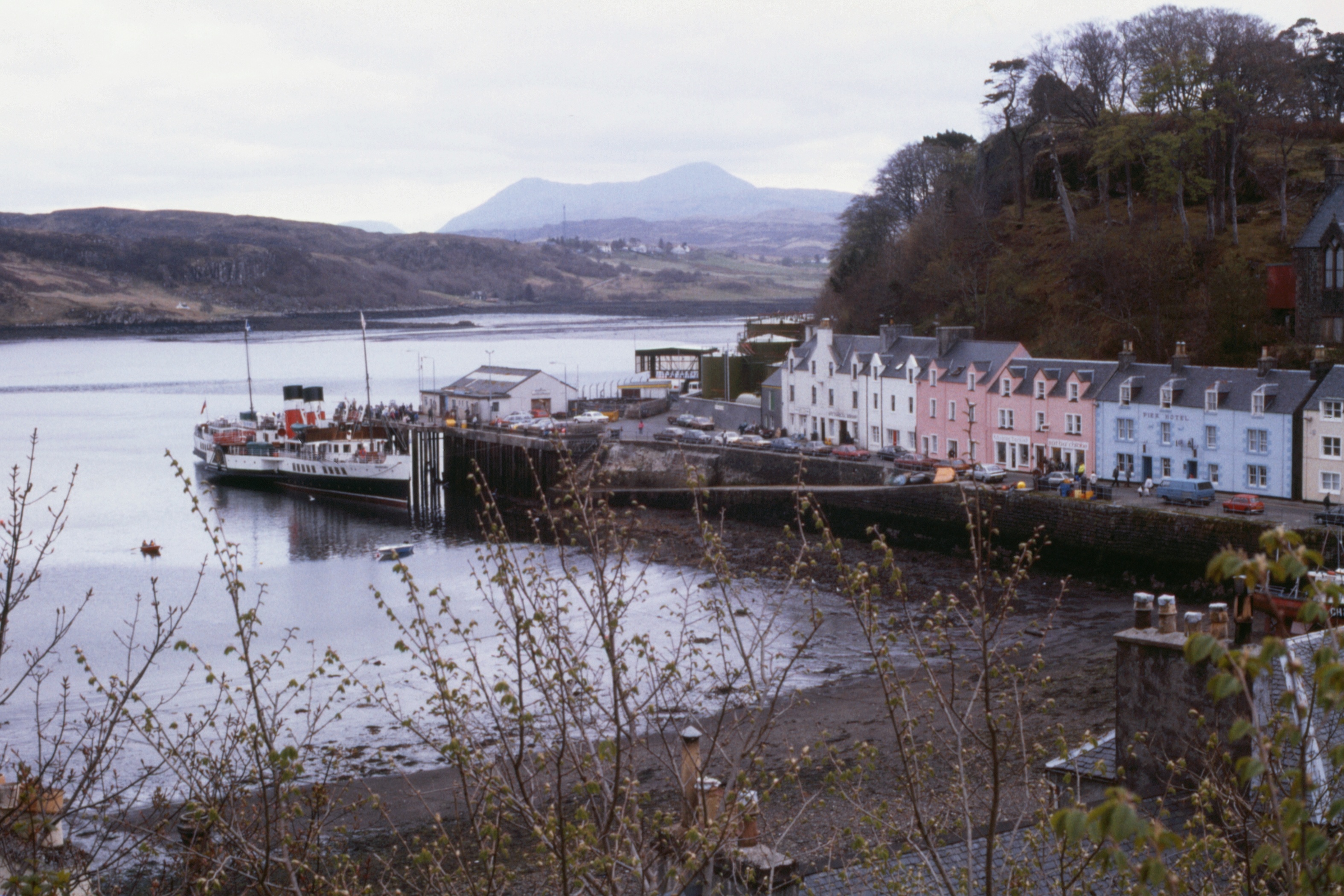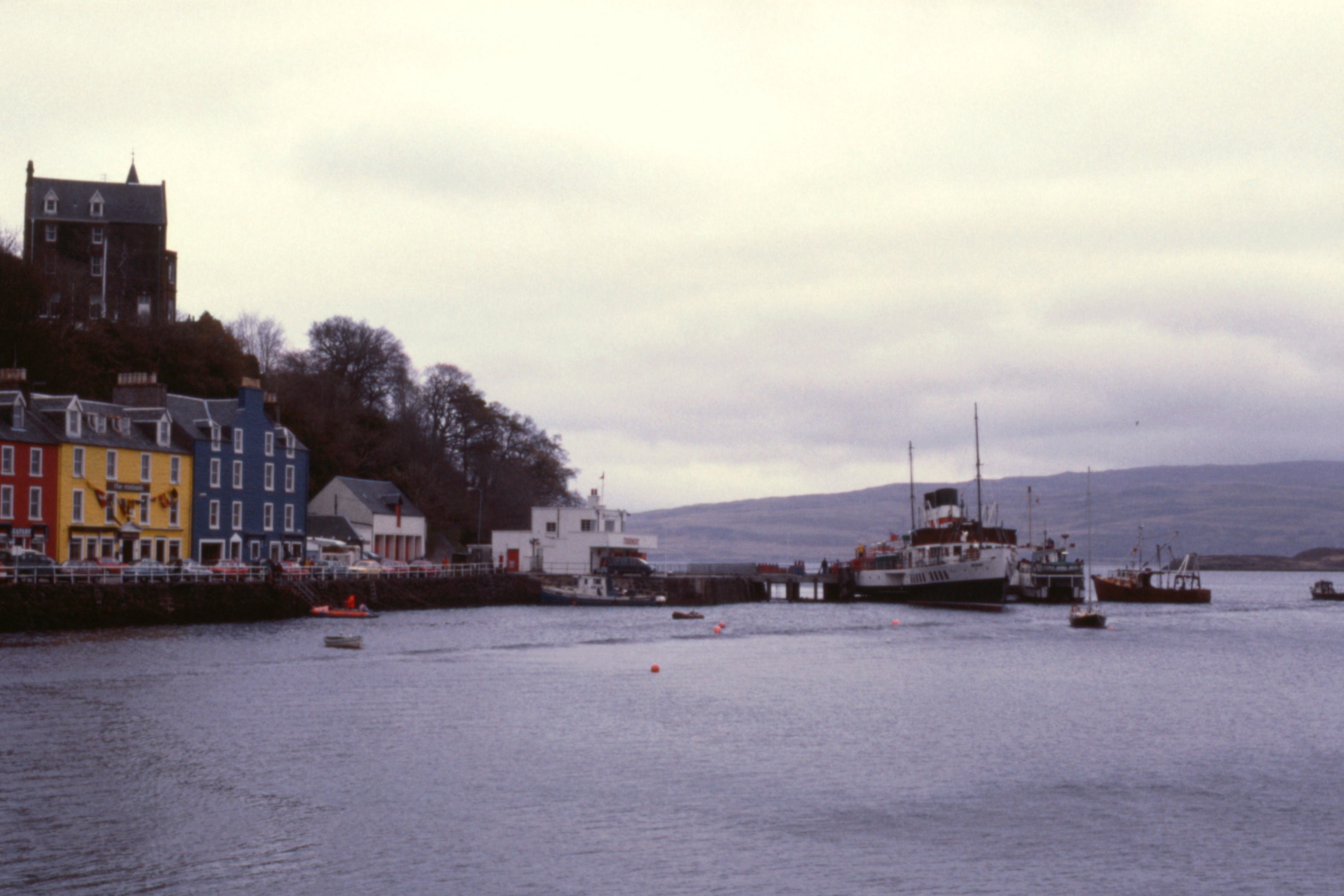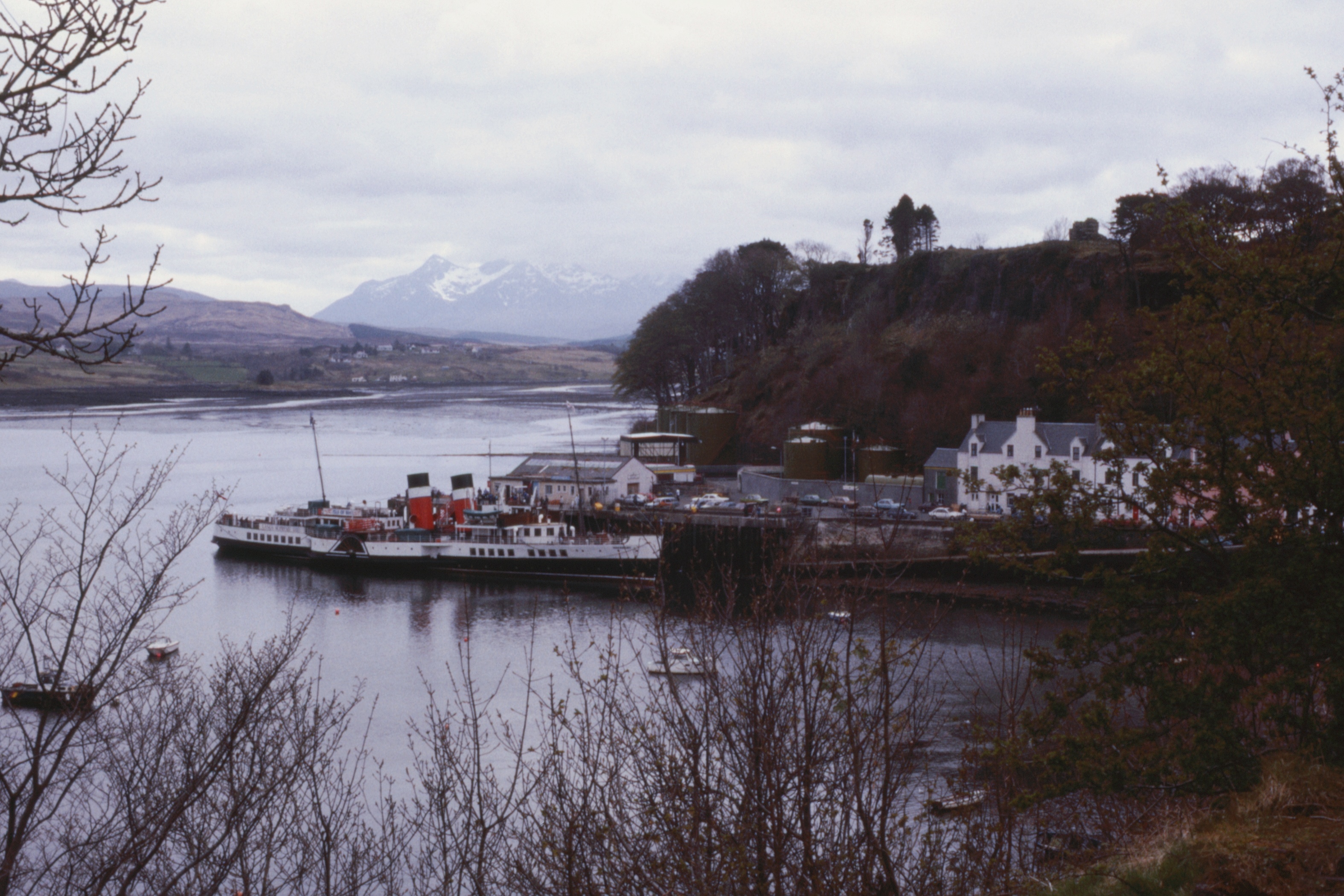 Day 9 - Saturday, May 6 - We sailed south from Stornoway along the east coast of Lewis and Harris, had a rendezvous en route with the Stornoway Coastguard helicopter which practised putting a man on the aft deck (and took off the purser temporarily) before calling at Tarbert. Then it was across the Minch and round the north of Skye to Portree. Then a cruise south past Raasay and on as far as Kylerhea before returning to Portree. Waverley then sailed light to Kyle for the night to refuel.