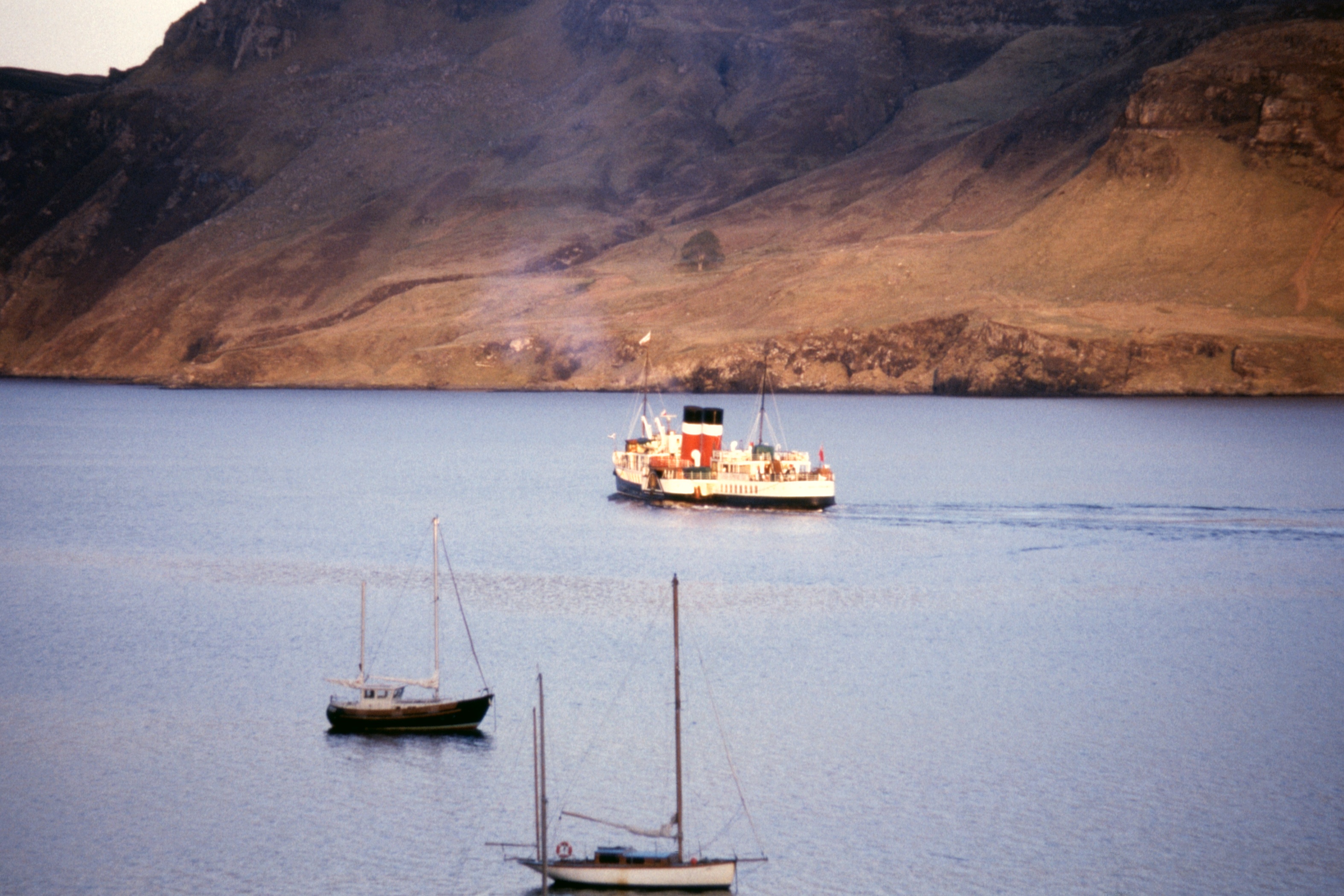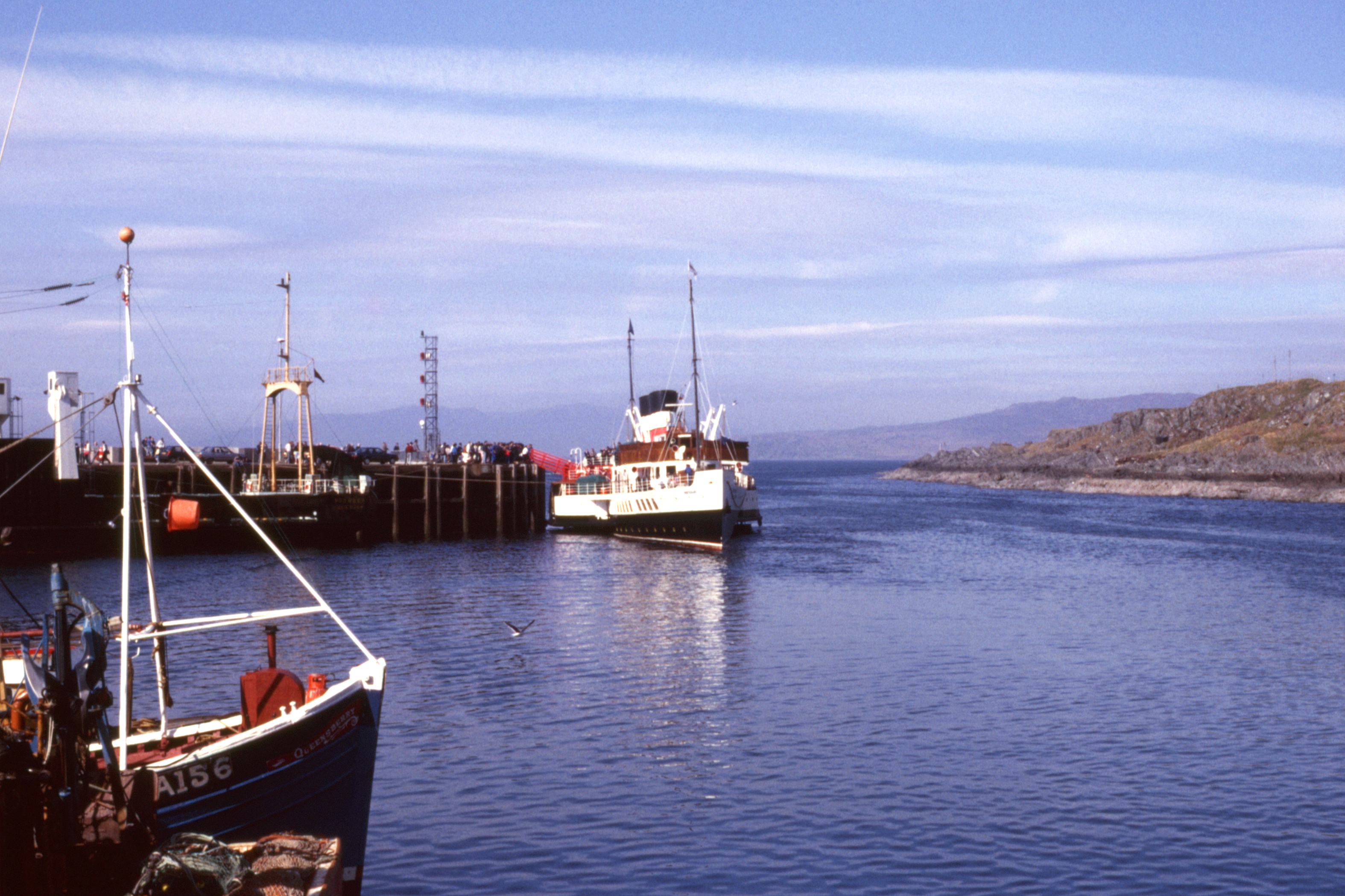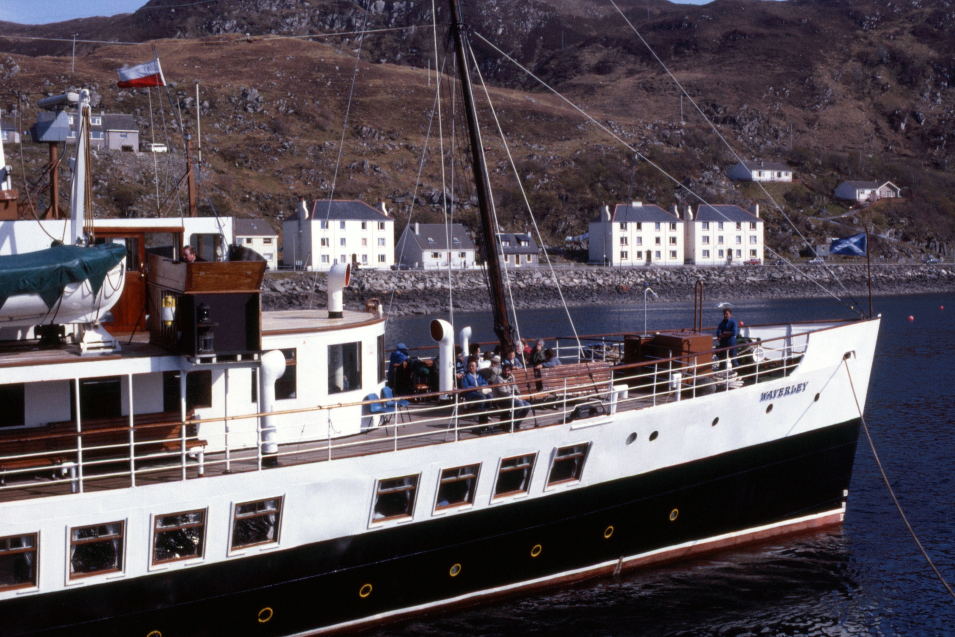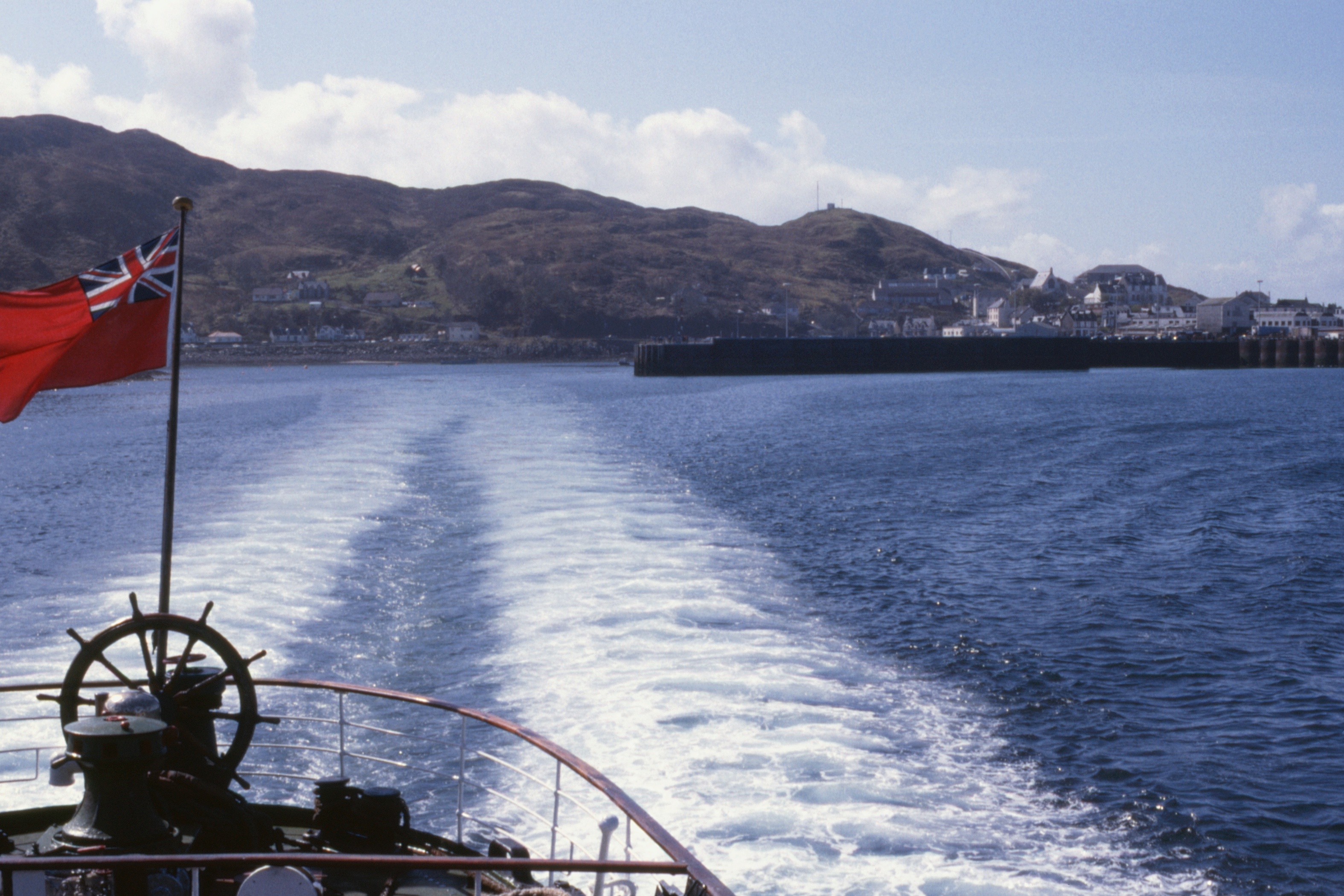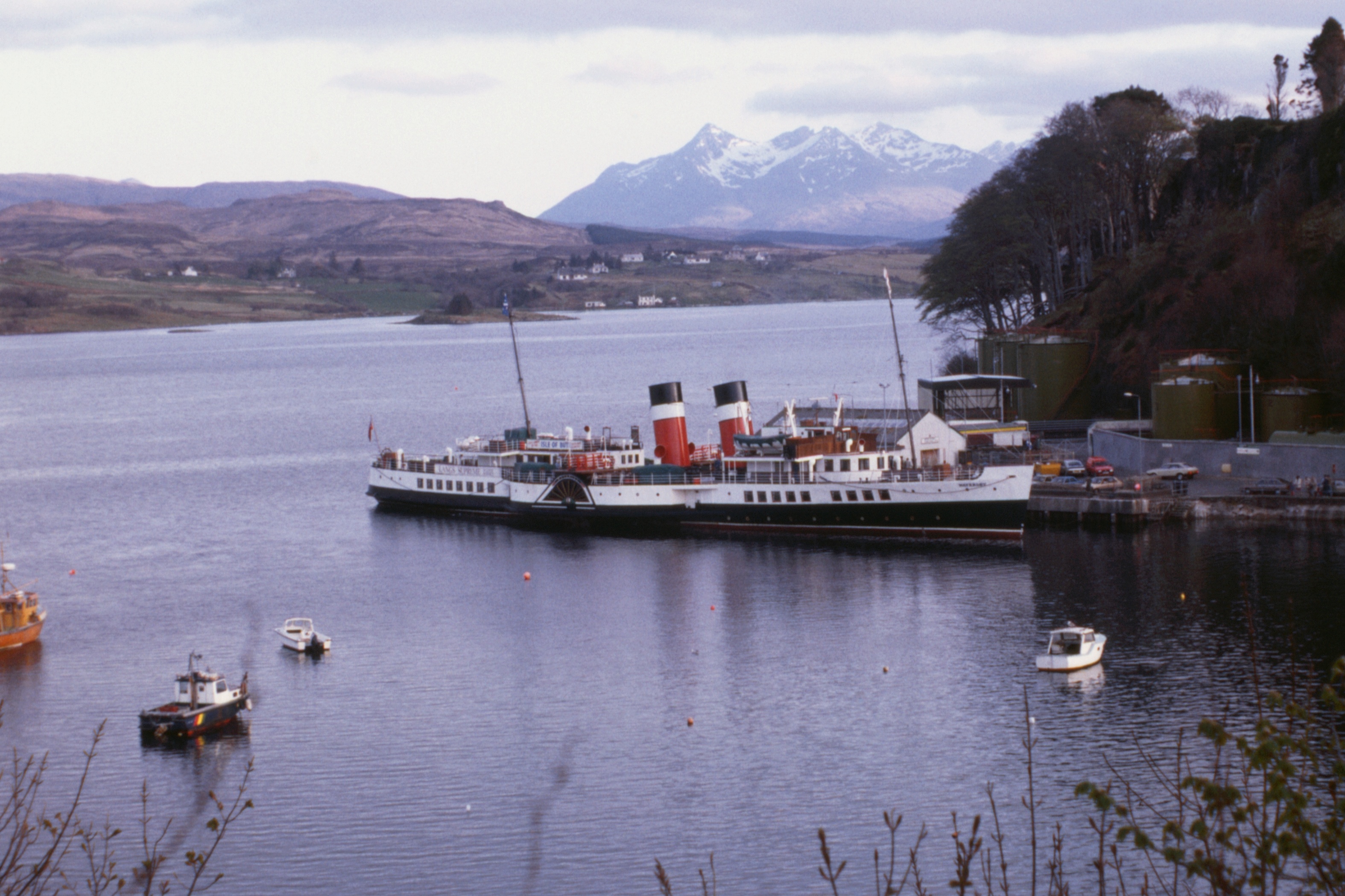 Day 9 - Saturday, May 6 - We sailed south from Stornoway along the east coast of Lewis and Harris, had a rendezvous en route with the Stornoway Coastguard helicopter which practised putting a man on the aft deck (and took off the purser temporarily) before calling at Tarbert. Then it was across the Minch and round the north of Skye to Portree. Then a cruise south past Raasay and on as far as Kylerhea before returning to Portree. Waverley then sailed light to Kyle for the night to refuel.