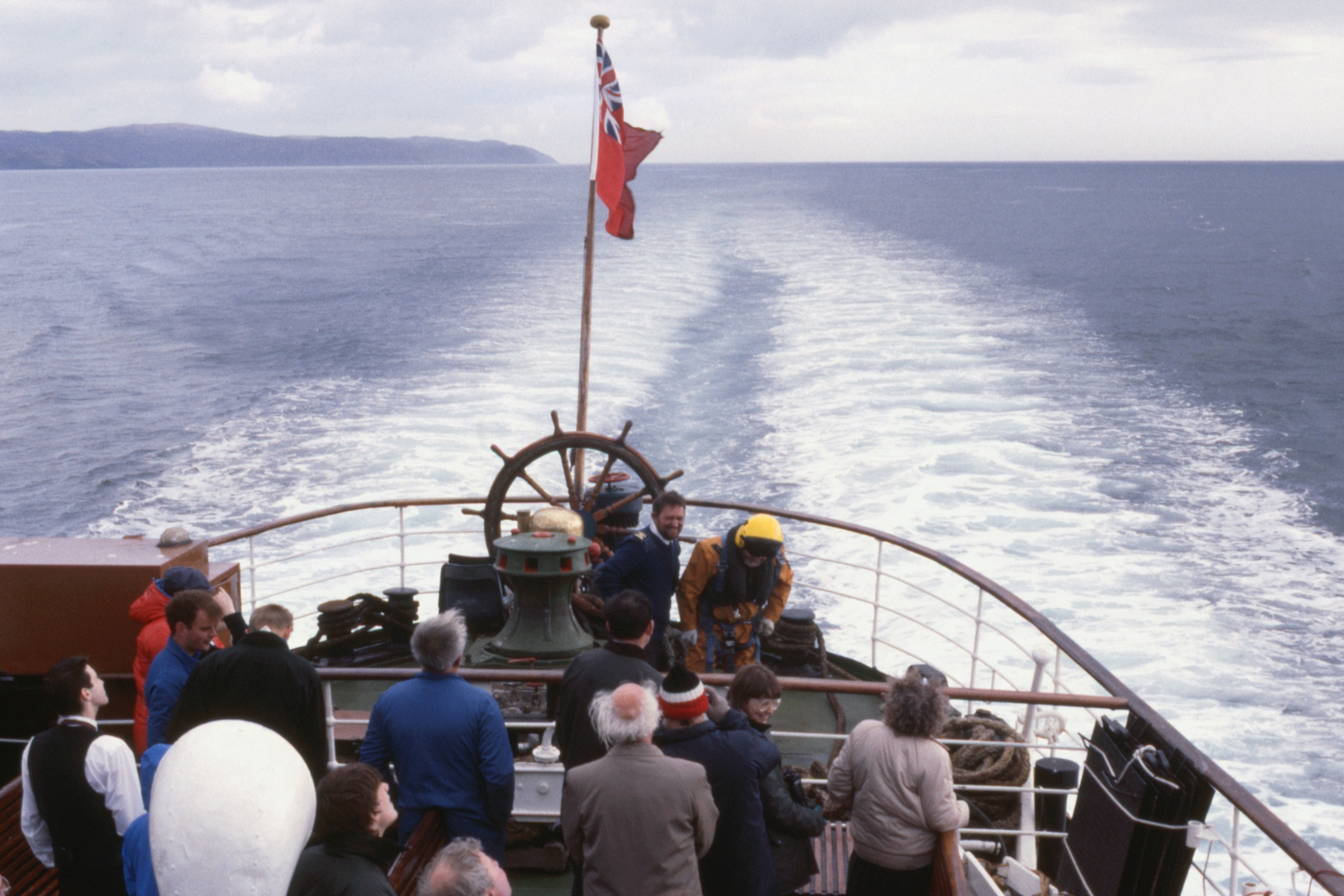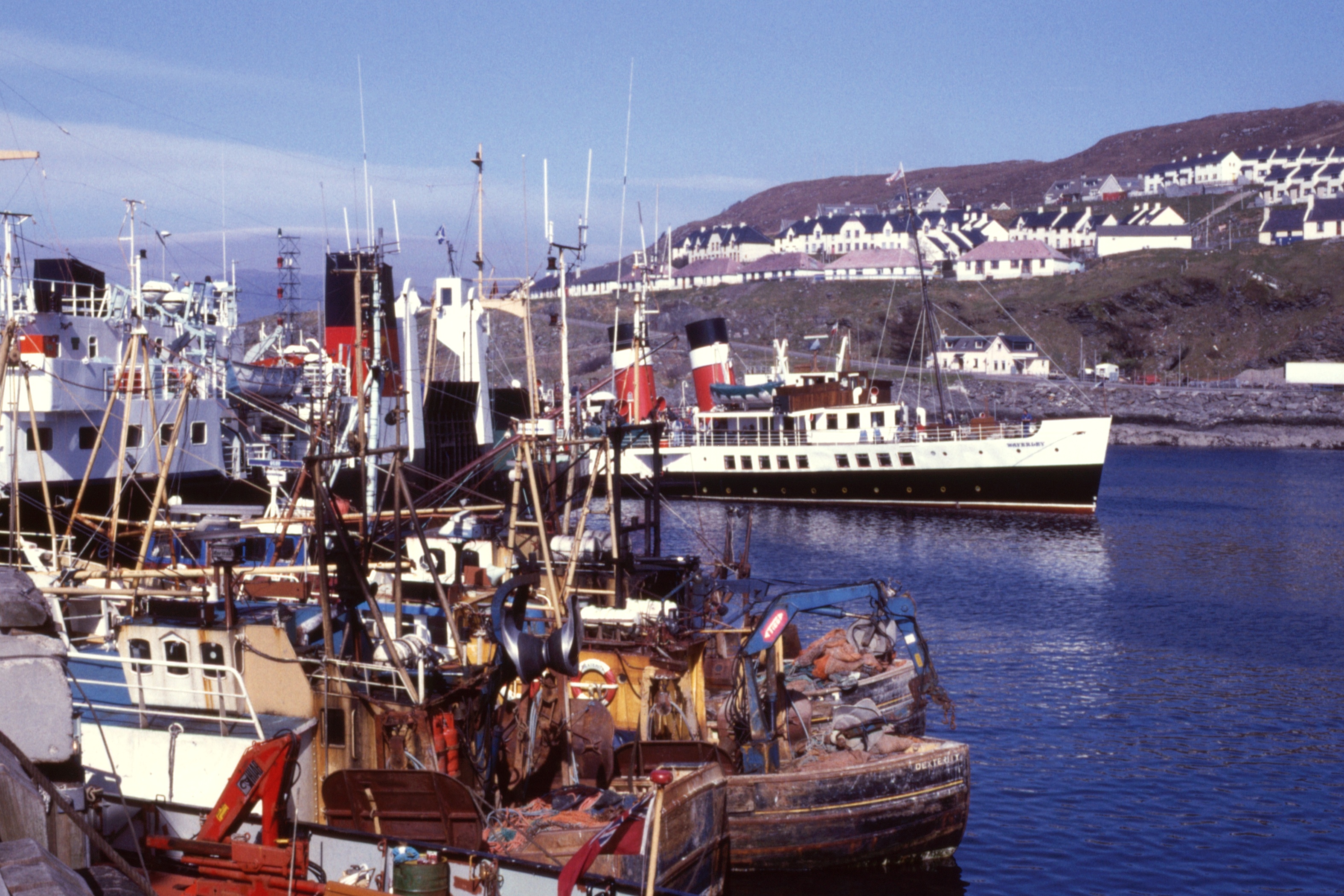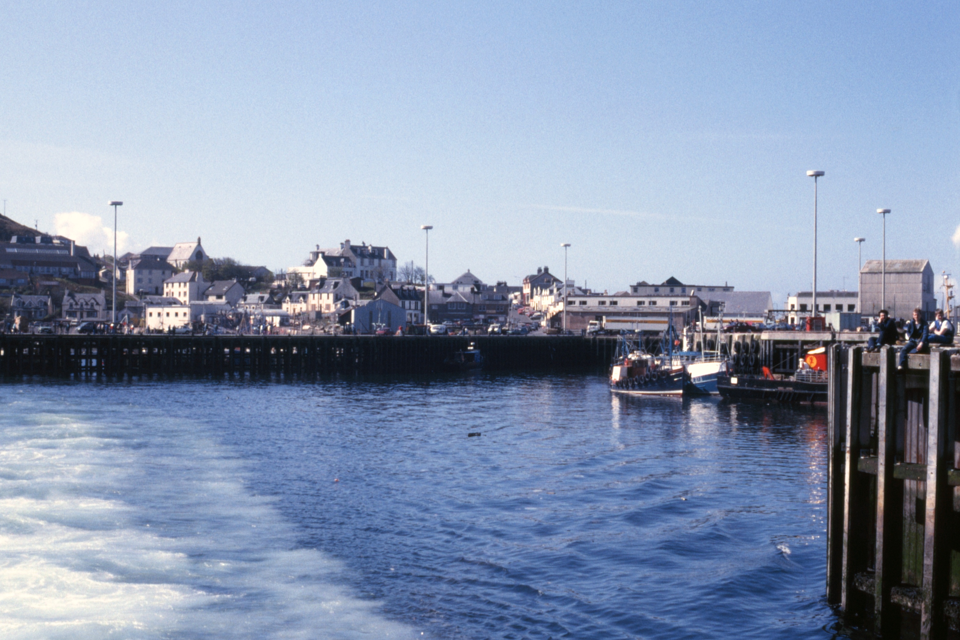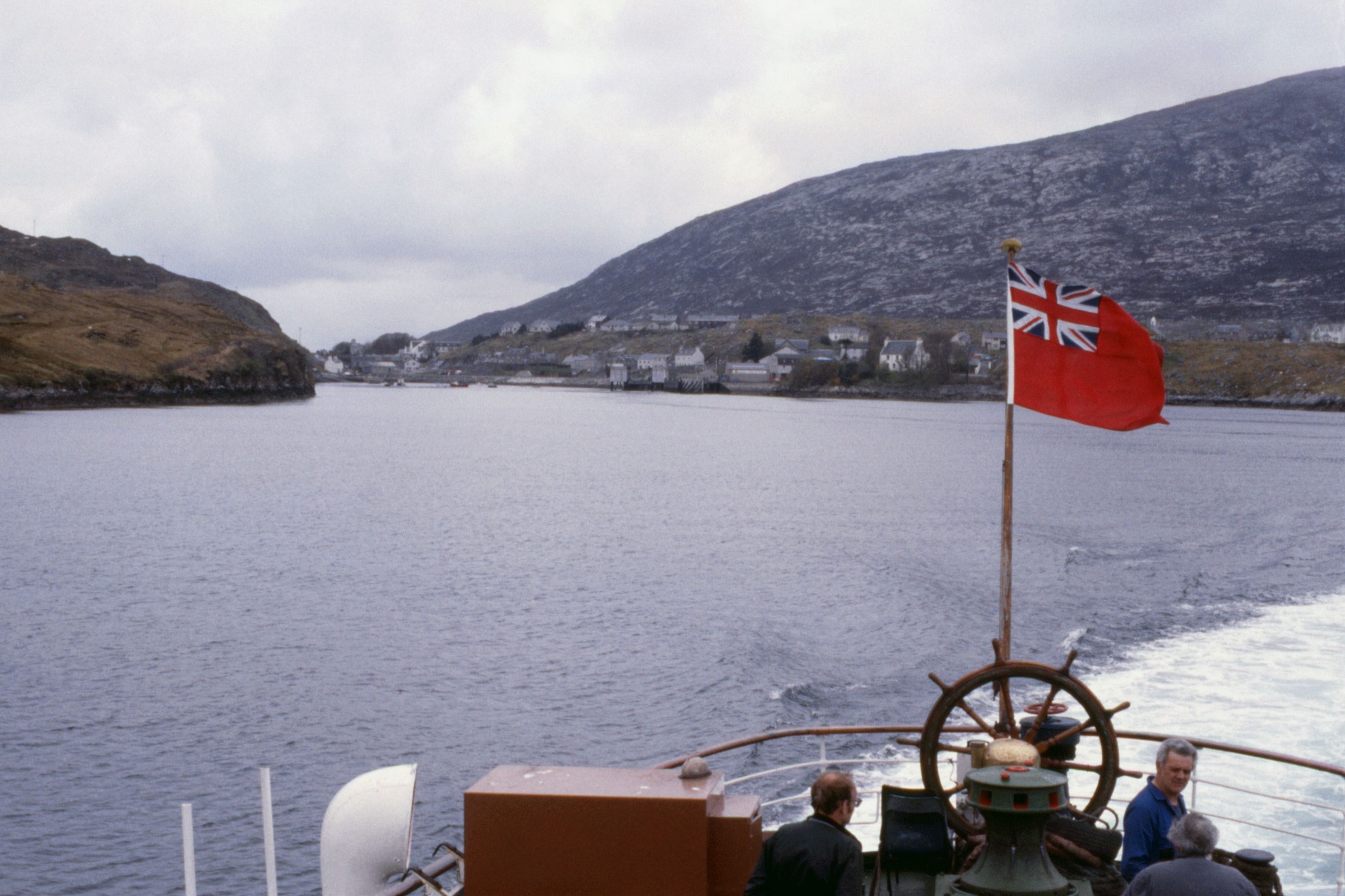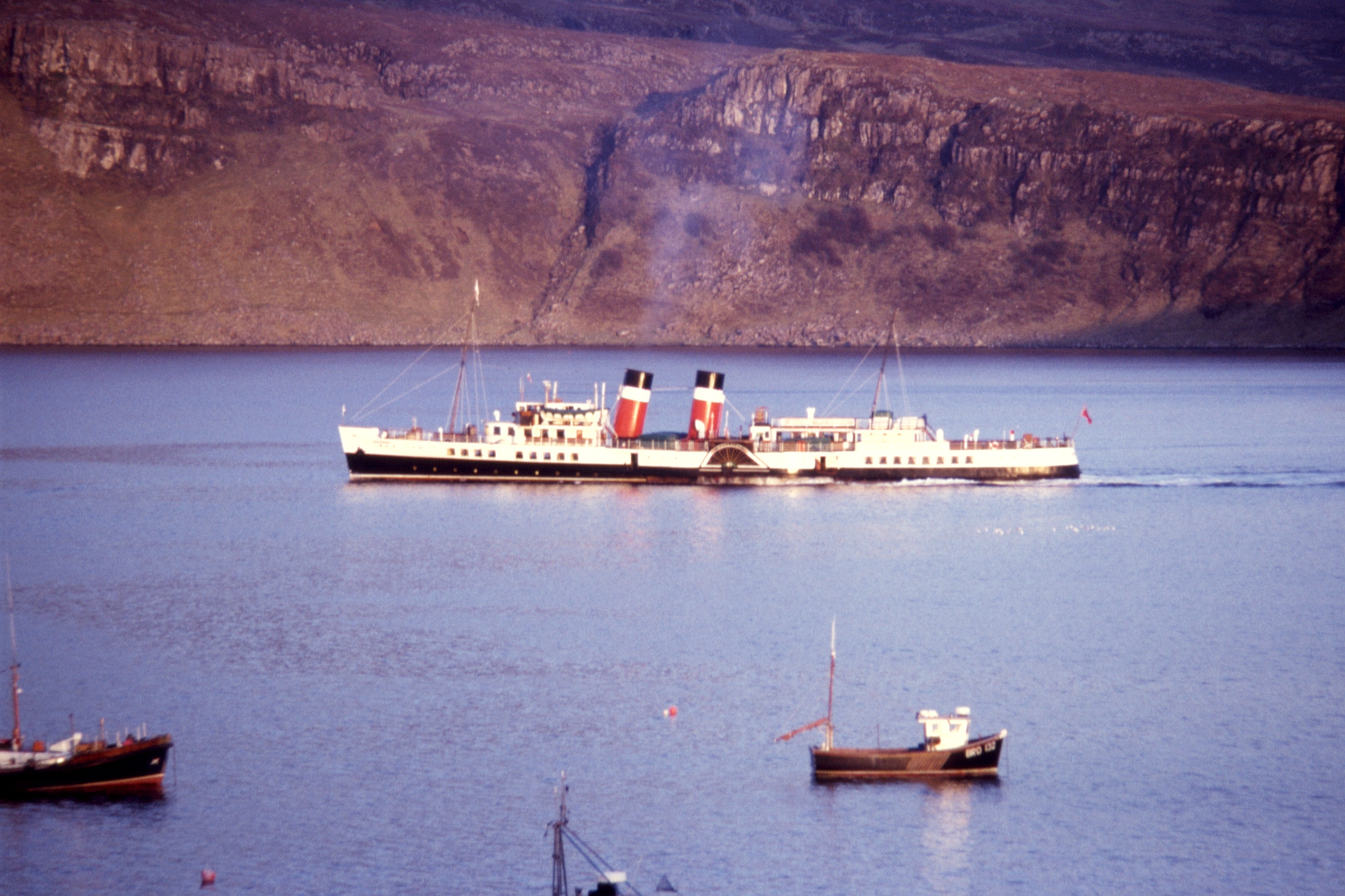 Day 9 - Saturday, May 6 - We sailed south from Stornoway along the east coast of Lewis and Harris, had a rendezvous en route with the Stornoway Coastguard helicopter which practised putting a man on the aft deck (and took off the purser temporarily) before calling at Tarbert. Then it was across the Minch and round the north of Skye to Portree. Then a cruise south past Raasay and on as far as Kylerhea before returning to Portree. Waverley then sailed light to Kyle for the night to refuel.