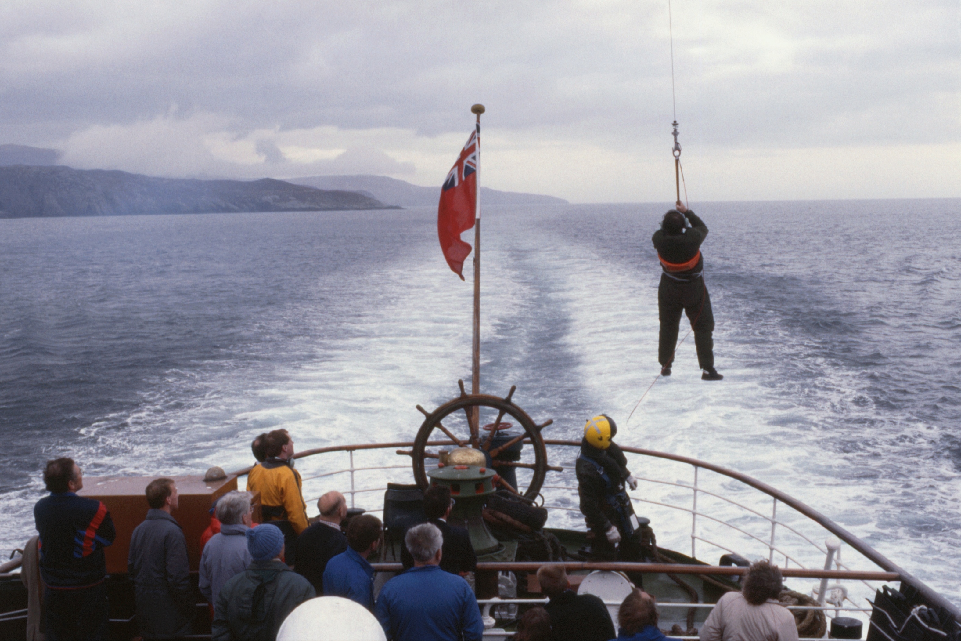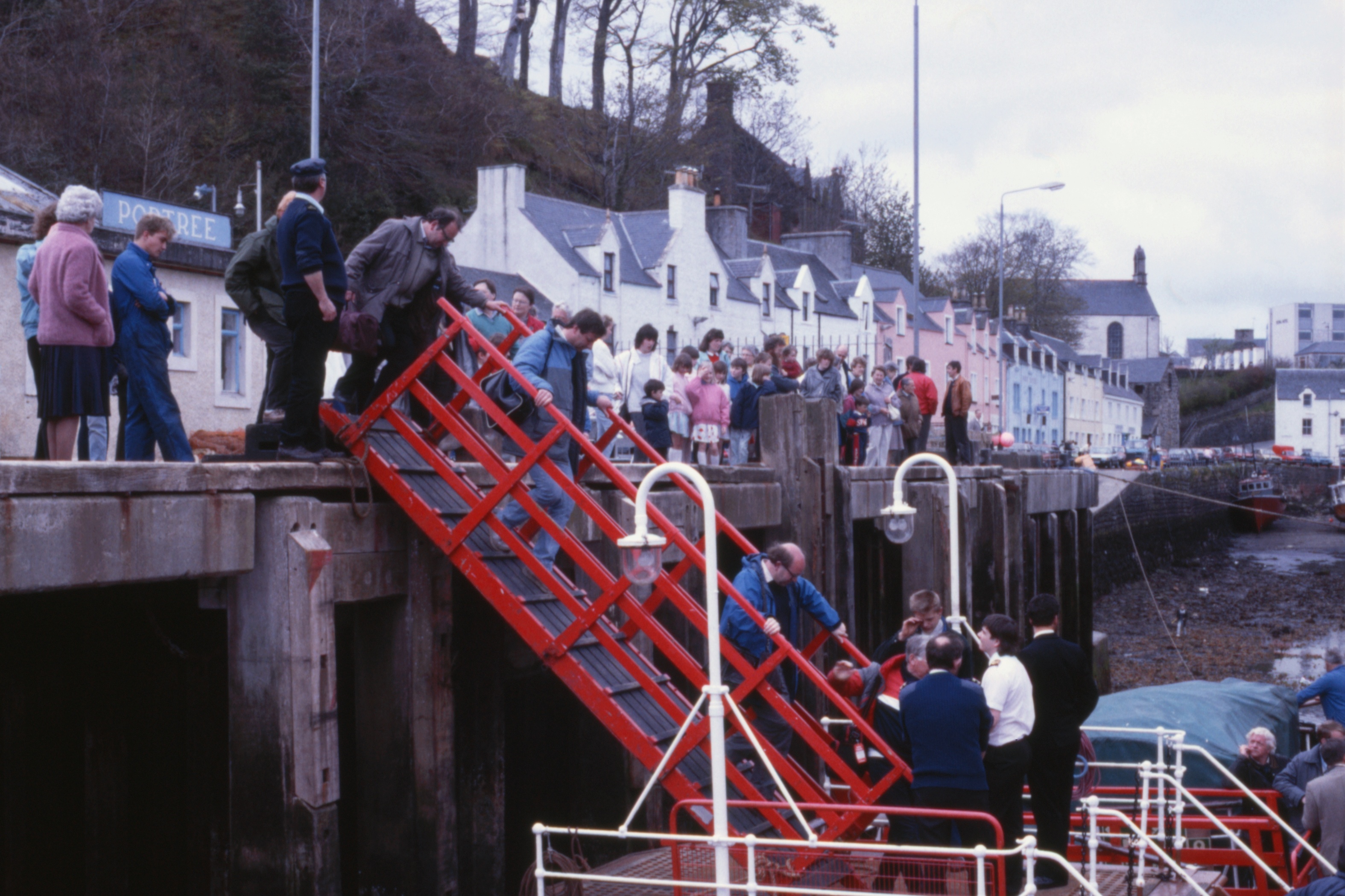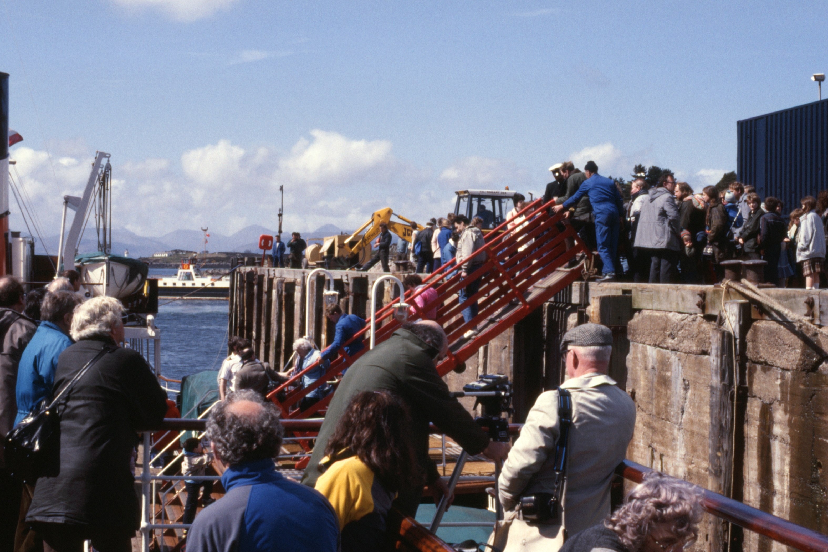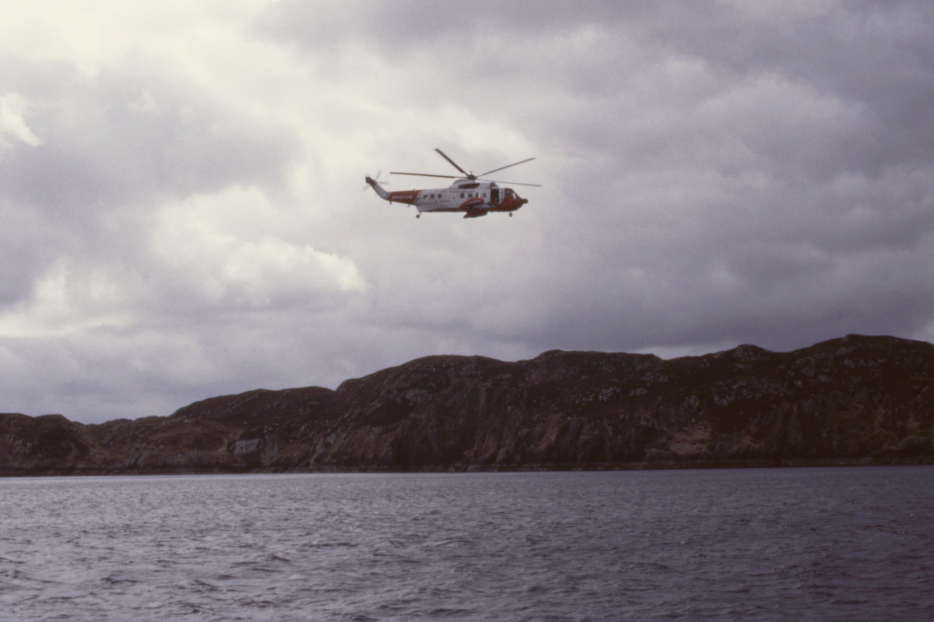 Day 9 - Saturday, May 6 - We sailed south from Stornoway along the east coast of Lewis and Harris, had a rendezvous en route with the Stornoway Coastguard helicopter which practised putting a man on the aft deck (and took off the purser temporarily) before calling at Tarbert. Then it was across the Minch and round the north of Skye to Portree. Then a cruise south past Raasay and on as far as Kylerhea before returning to Portree. Waverley then sailed light to Kyle for the night to refuel.