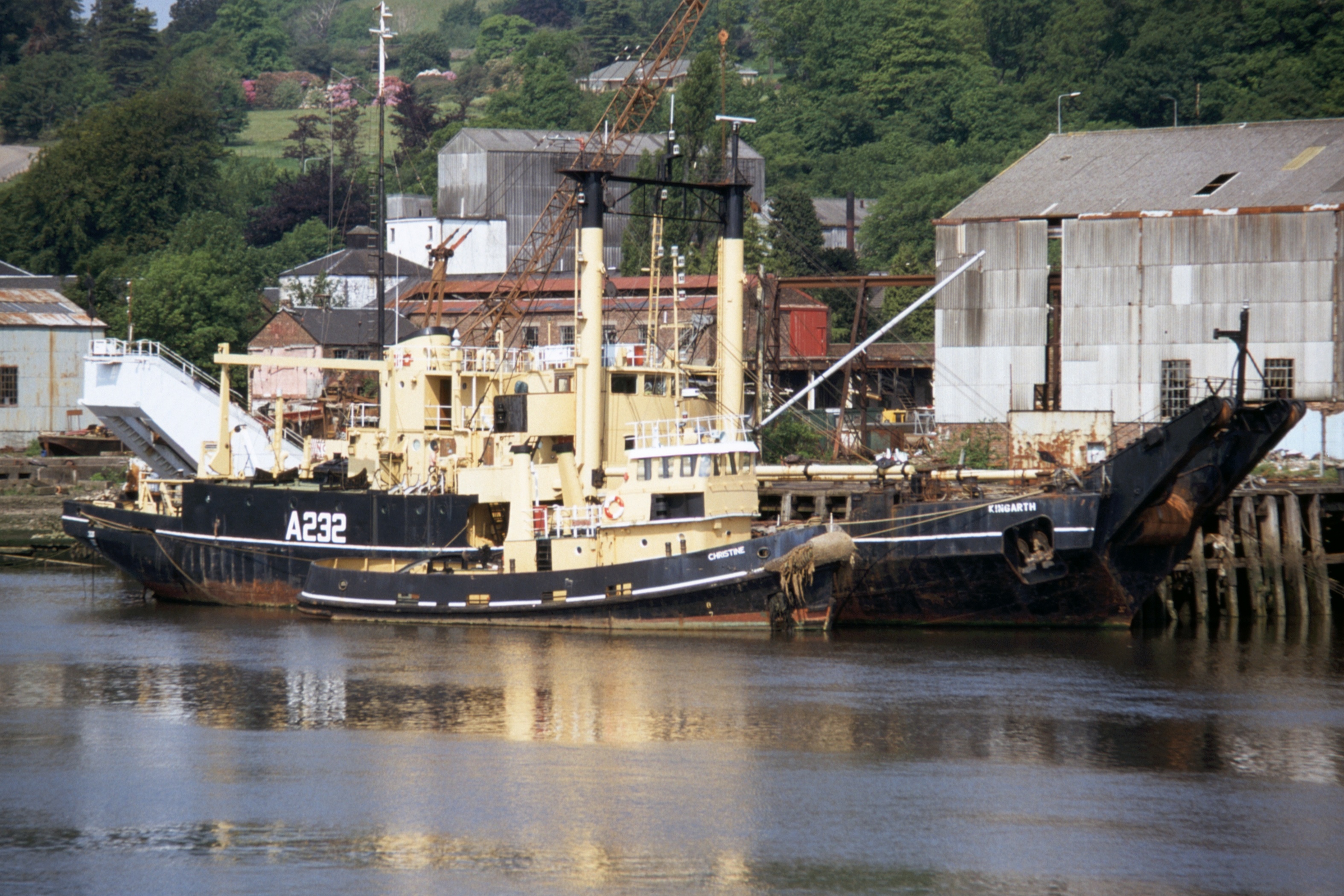 "Kingarth" (probably a mooring tender) and the tug Christine berthed at Bowling (probably for breaking) |