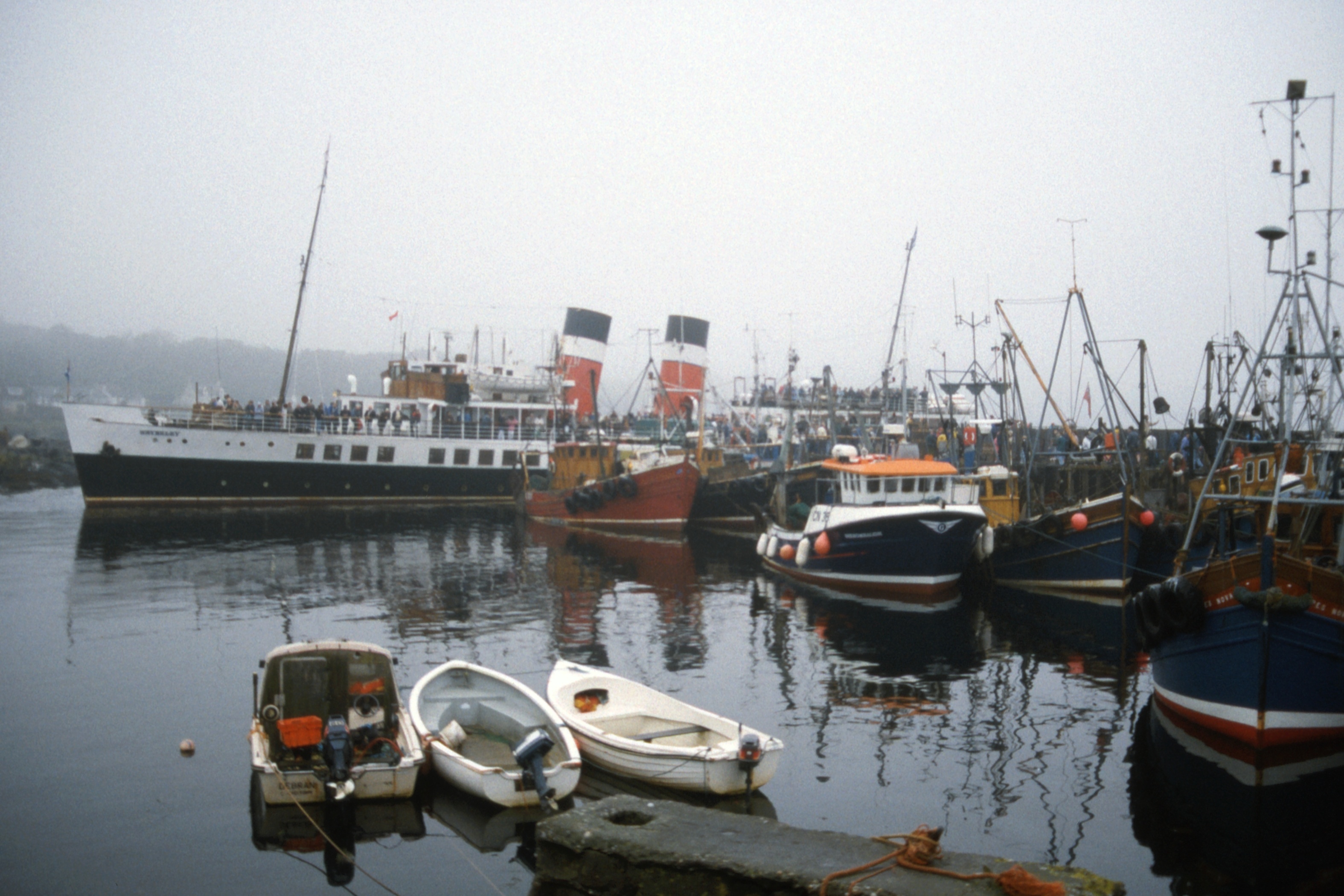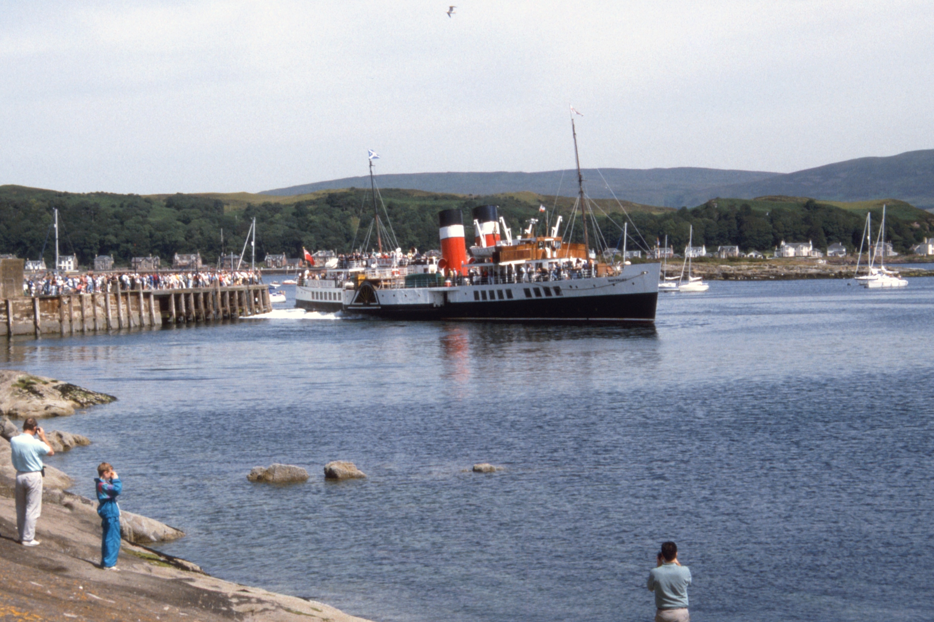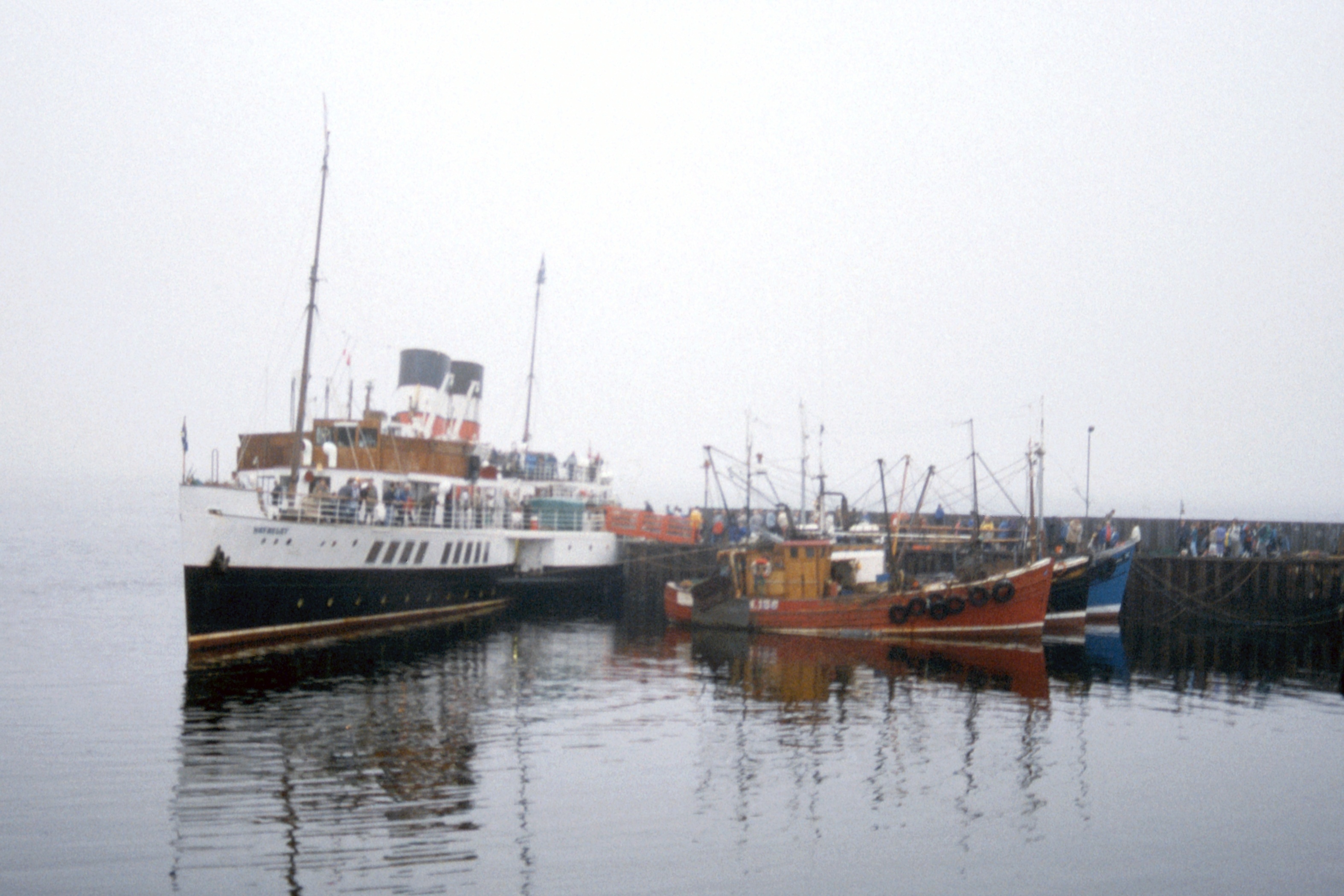 Waverley approaching the North Pier | Eigg heading for the slip for a run to Lismore |