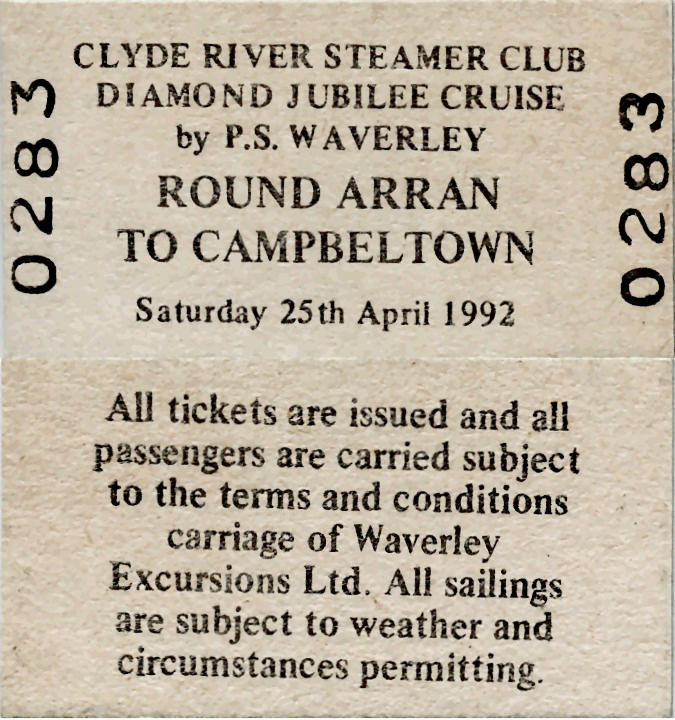 I took no photos but it appears that I sailed on the Clyde River Steamer Club Diamond Jubilee Cruise on Saturday, April 25 at a cost of �15.95 (since, being a charter sailing, it was not covered by my Commodore ticket). I caught a train at 06:46 from Shettleston to Helensburgh arriving at 07:46. The published timetable was from Helensburgh at 08:50 to Gourock (09:30), Dunoon (09:55)and Largs (10:45) to Campbeltown (13:50 - 15:30) and Millport (18:10 - 18:40) returning to Largs (19:10), Dunoon (20:00), Gourock (20:20) and Helensburgh (20:50). Since I have no record of going ashore anywhere, I assume that we didn't reach Campbeltown, possibly due to the weather.
