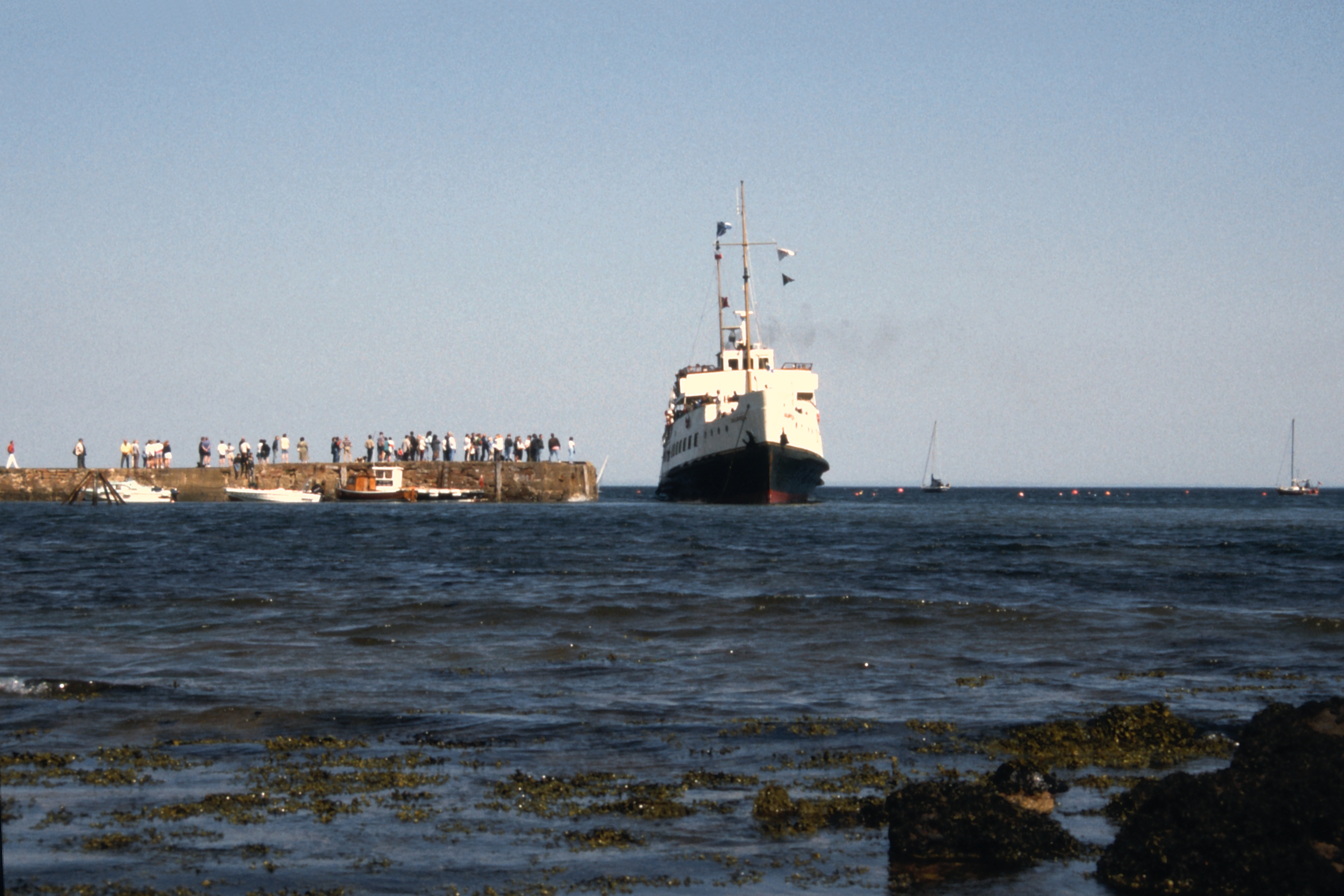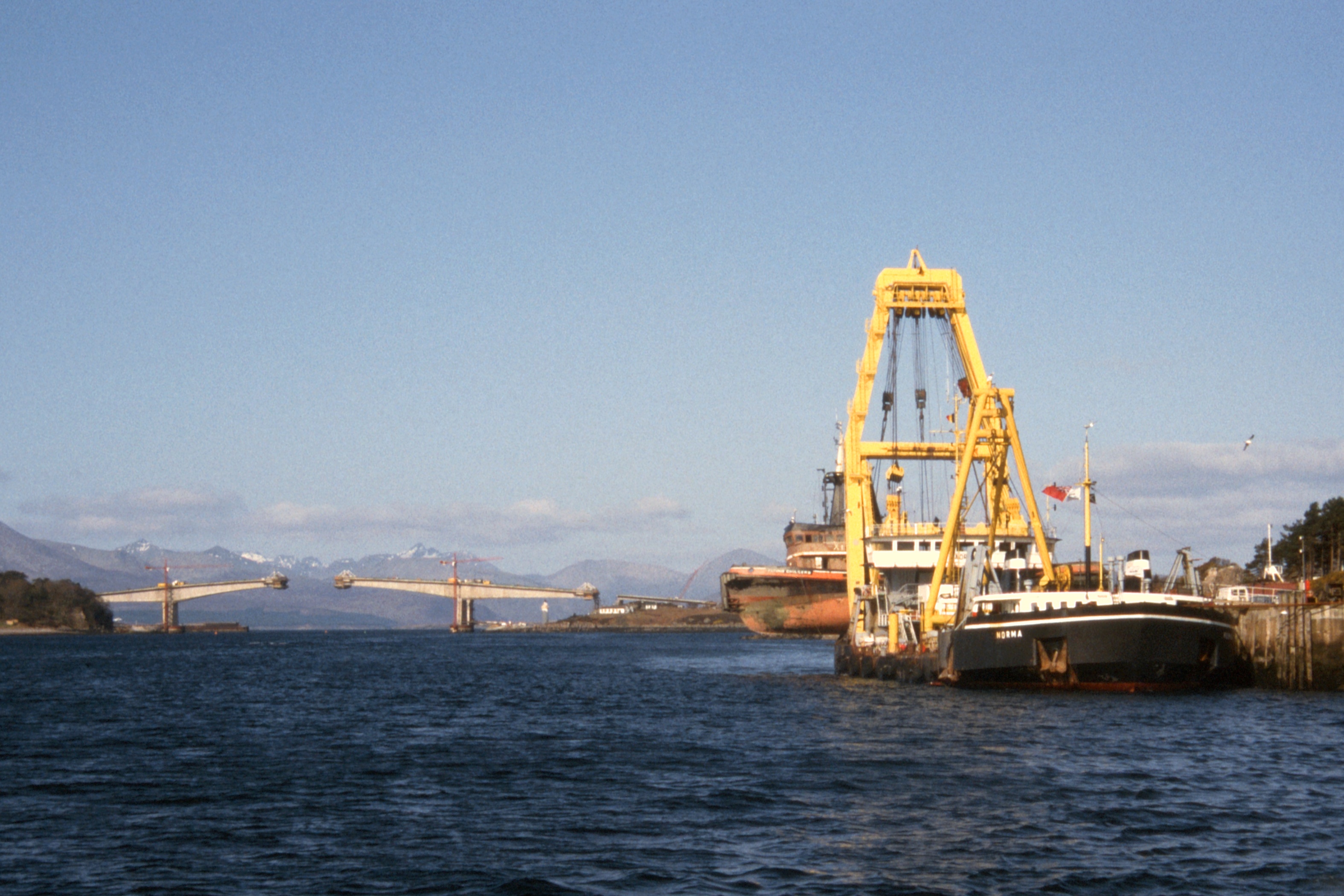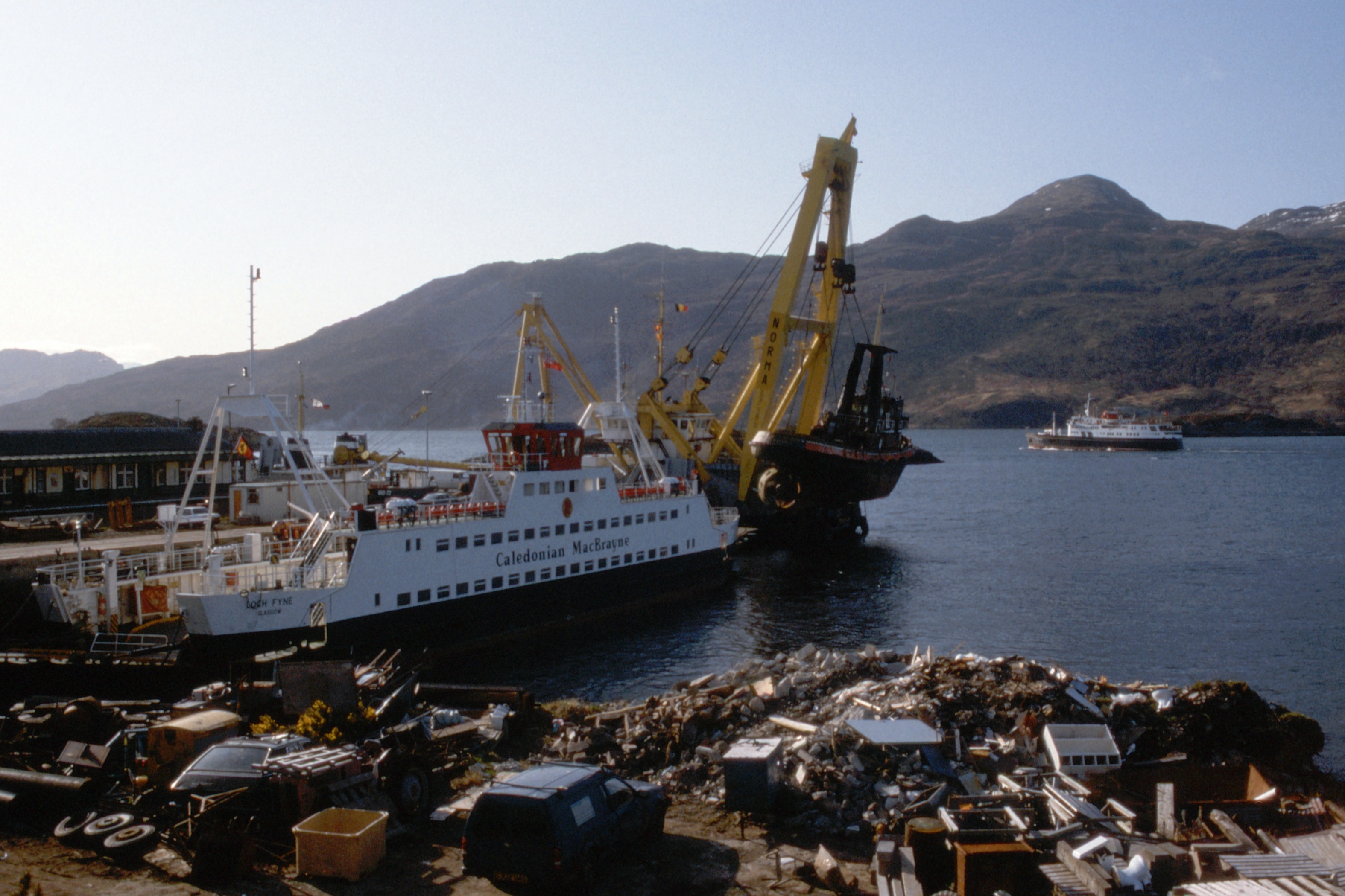 The tug Flying Childers sank off Kyle about three weeks earlier and had just been recovered by the heavy lift barge Norma hence these photos of them blocking the Railway Pier.