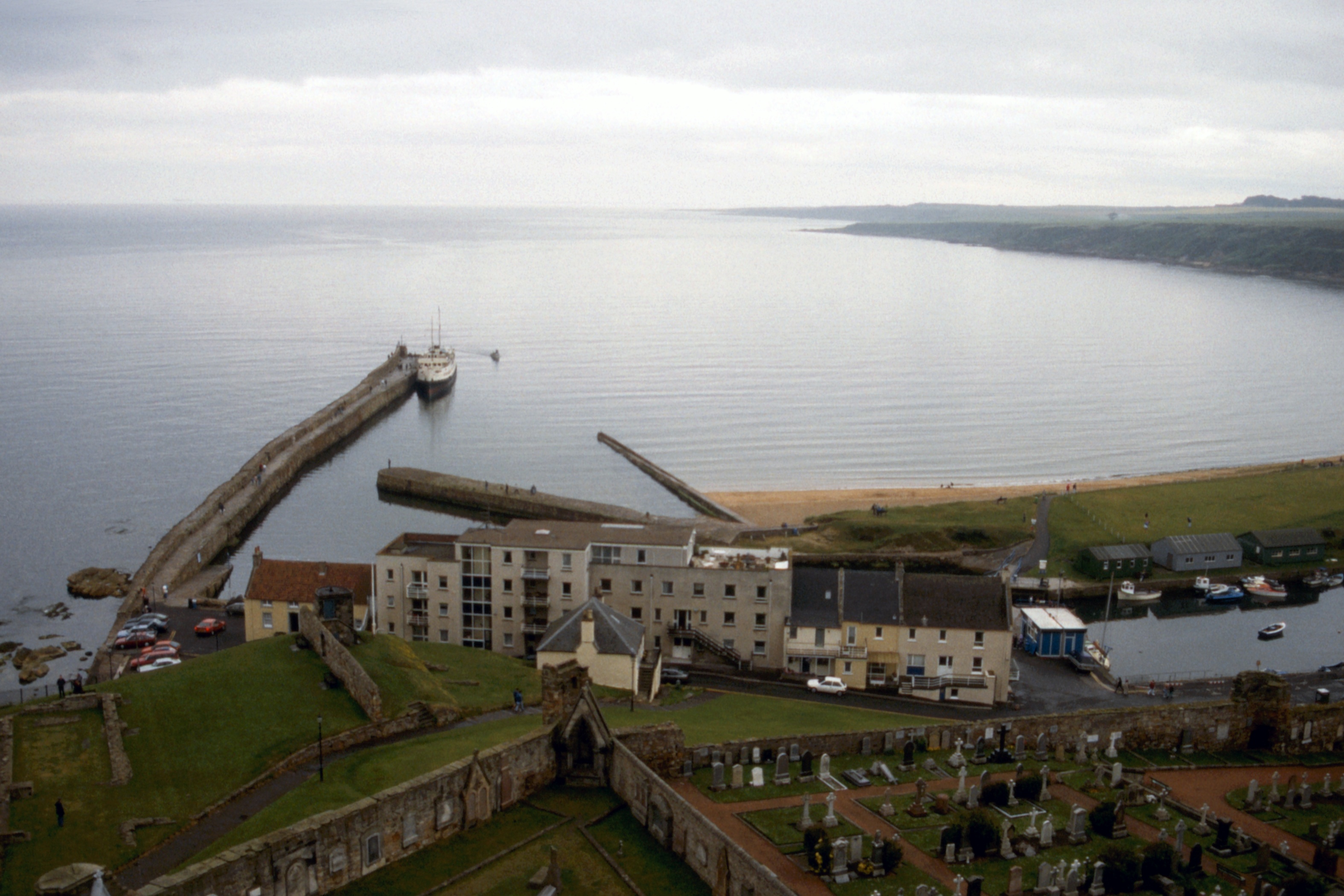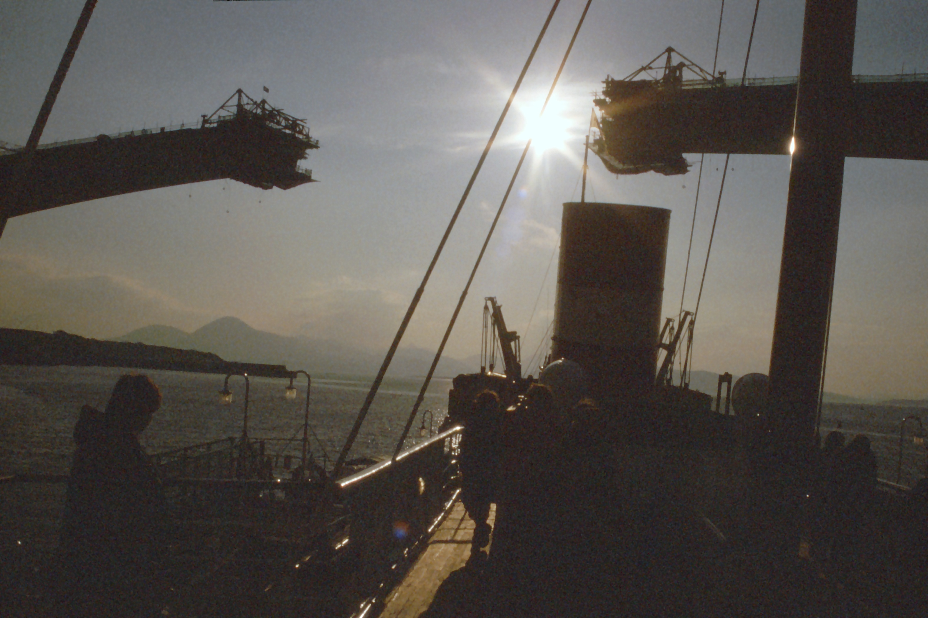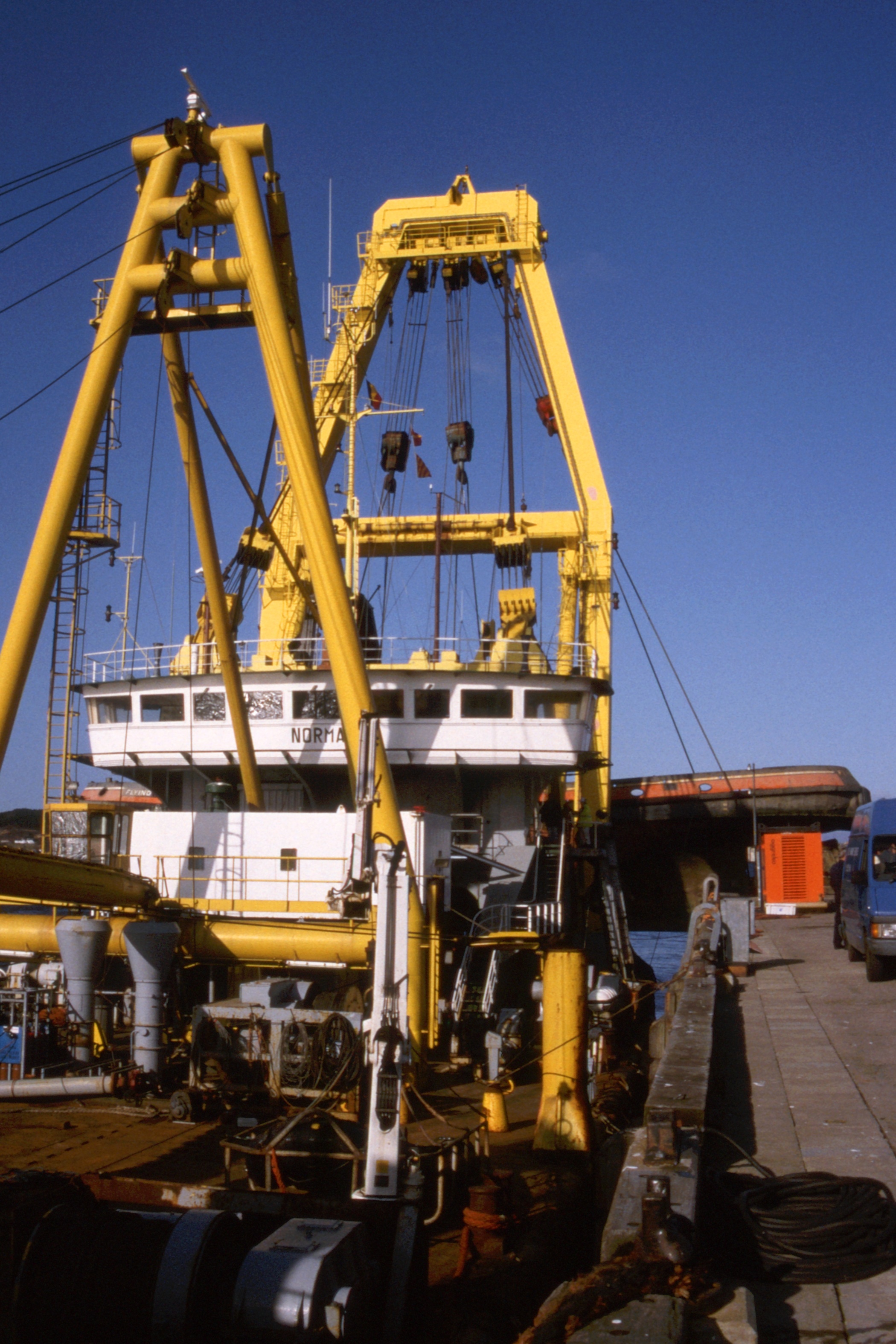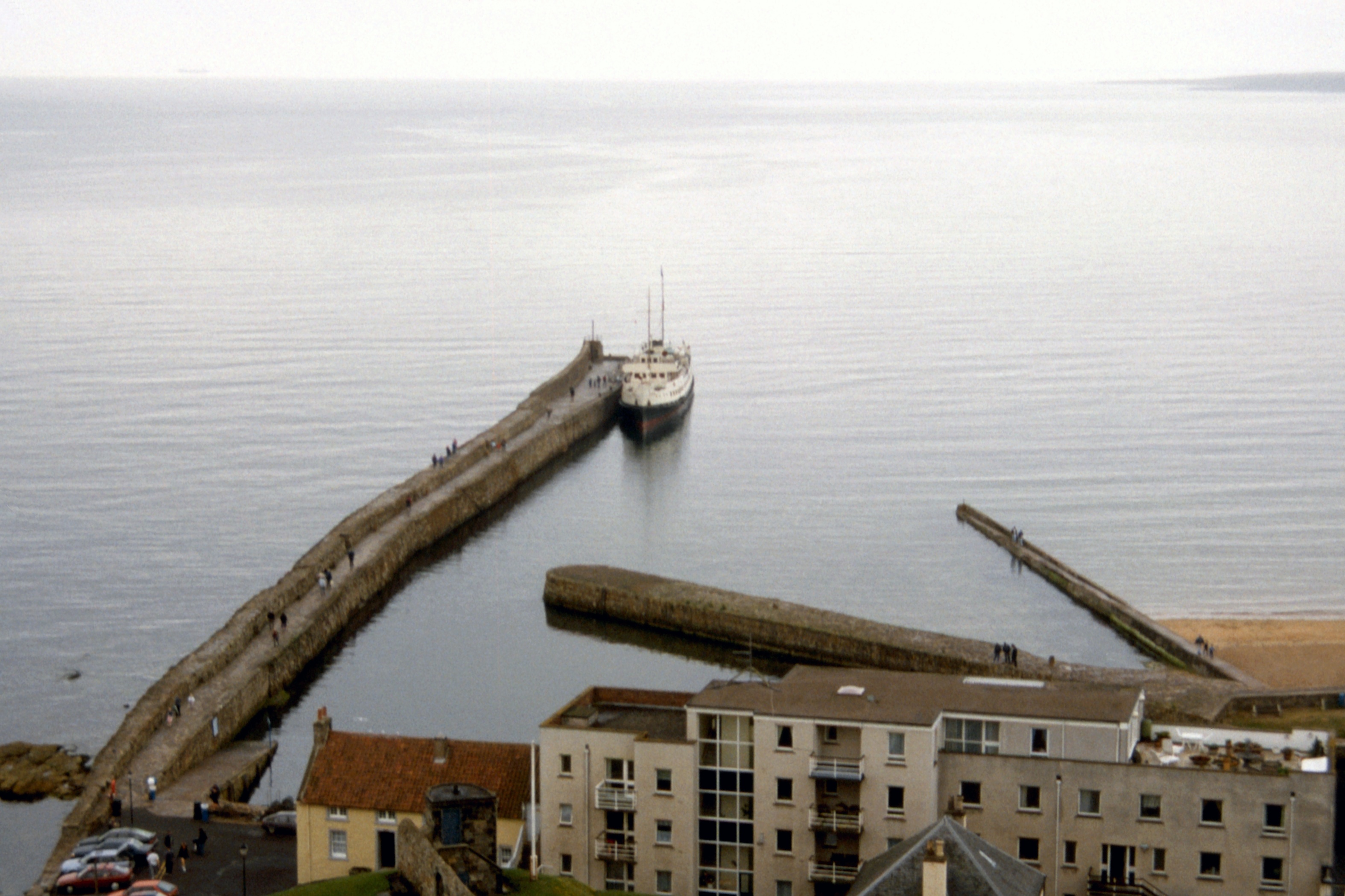 The tug Flying Childers sank off Kyle about three weeks earlier and had just been recovered by the heavy lift barge Norma hence these photos of them blocking the Railway Pier.