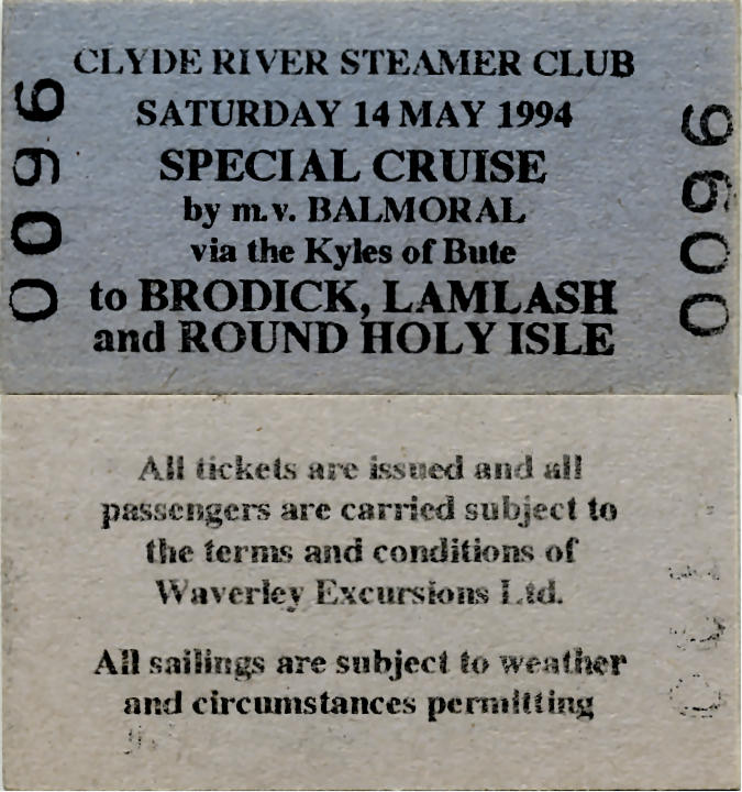 This was the fourth year that I purchased a Scottish Commodore ticket allowing unlimited sails on Waverley and Balmoral in all Scottish waters. Since Waverley was spending May in the more lucrative waters of the South Coast of England, the price was reduced to �295. In order to get value for money I enjoyed as many sails as I could manage (40) over the year, saving �679.15 in unpaid fares. We won't mention the approximately �820 I spent onboard and getting to and from all those sailings.