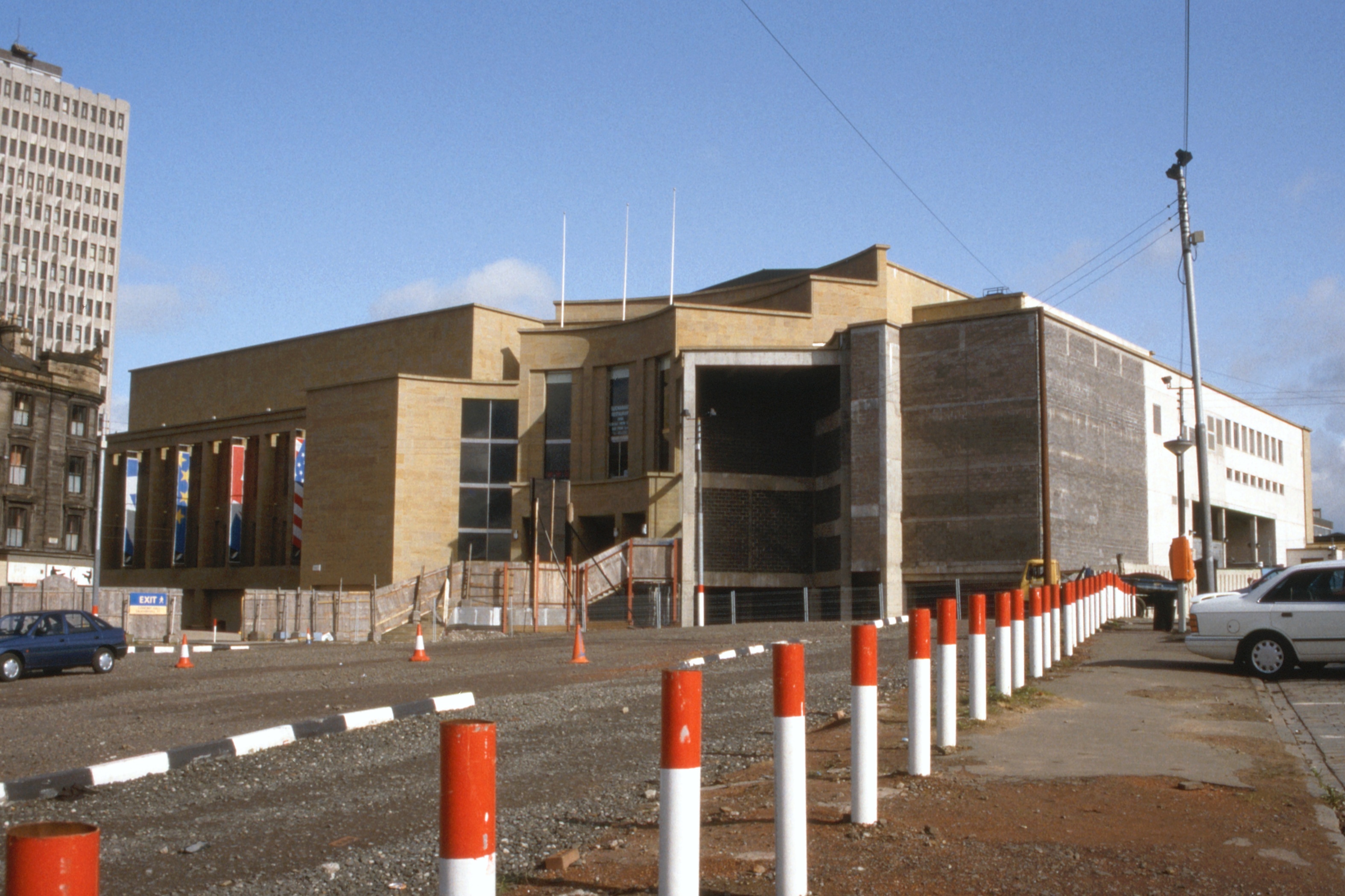 Unflattering view of the Glasgow Concert Hall across a car park |