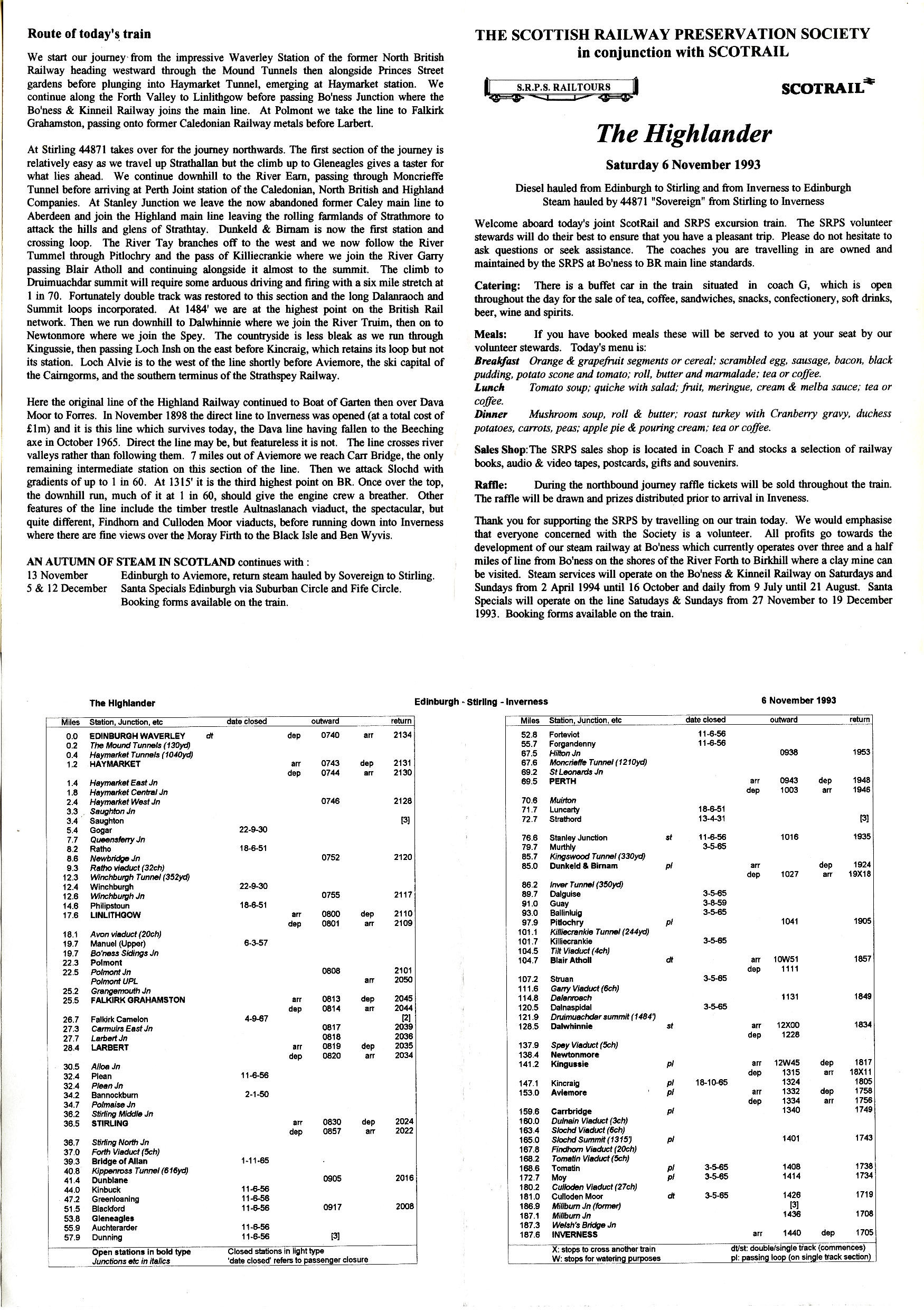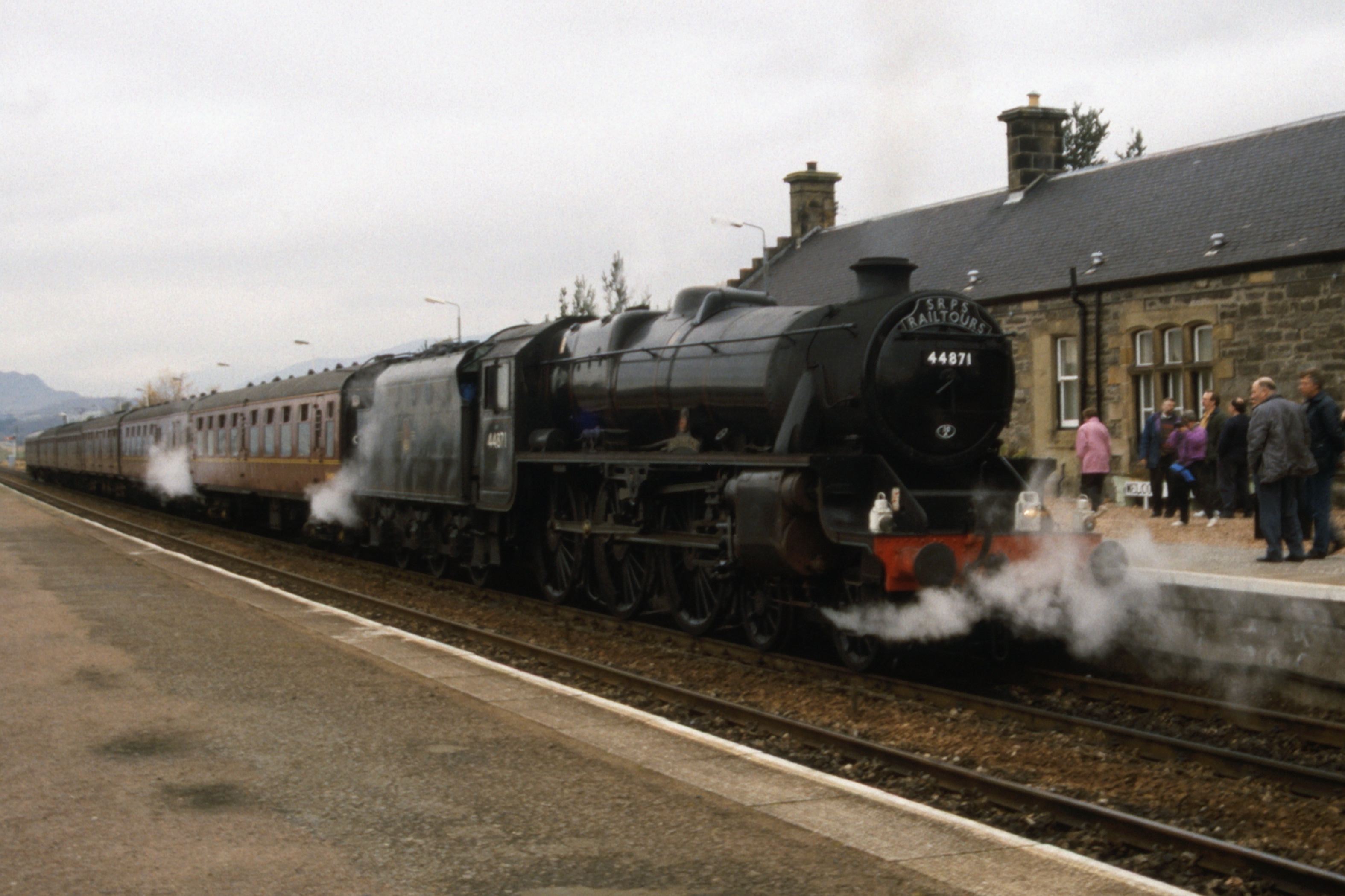 An SRPS Railtours trip to Inverness for a mere �36. I started early on the 06:22 train to Edinburgh (�7.00 cheap day return) arriving there at 07:16 for the 07:40 departure behind 37404 arriving at Stirling at 08:31. There, the loco was replaced by 45871 "Sovereign" and we continued at 09:11. After stops at Perth (10:07 - 10:22), Blair Atholl (11:11 - 11:28) and Dalwhinnie (12:27 - 12:58) we reached Kingussie at 13:14, where I took a couple of photos. We continued at 13:34, passing Aviemore at 13:50 and reached Inverness at 14:40. The return journey left Inverness at 17:08 behind 37404 (did it follow us up to Inverness or precede us?) and we were back in Edinburgh at 21:38 where I caught a train at 21:53 to reach Glasgow at 22:52.
