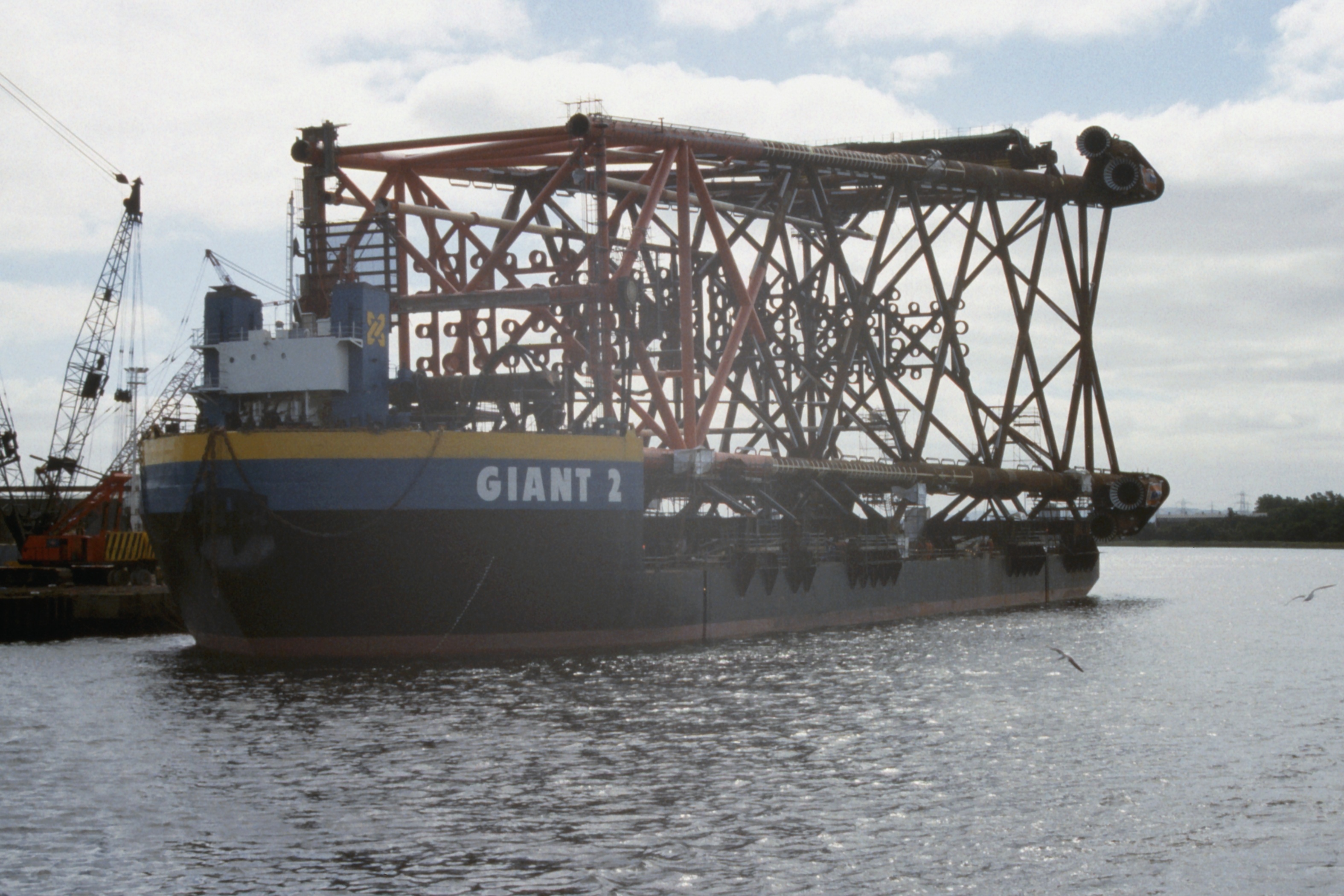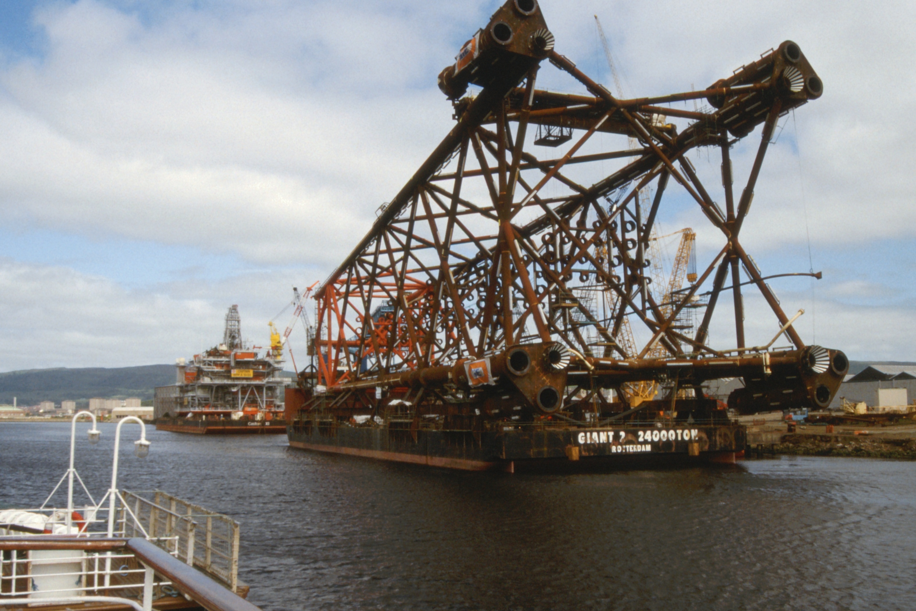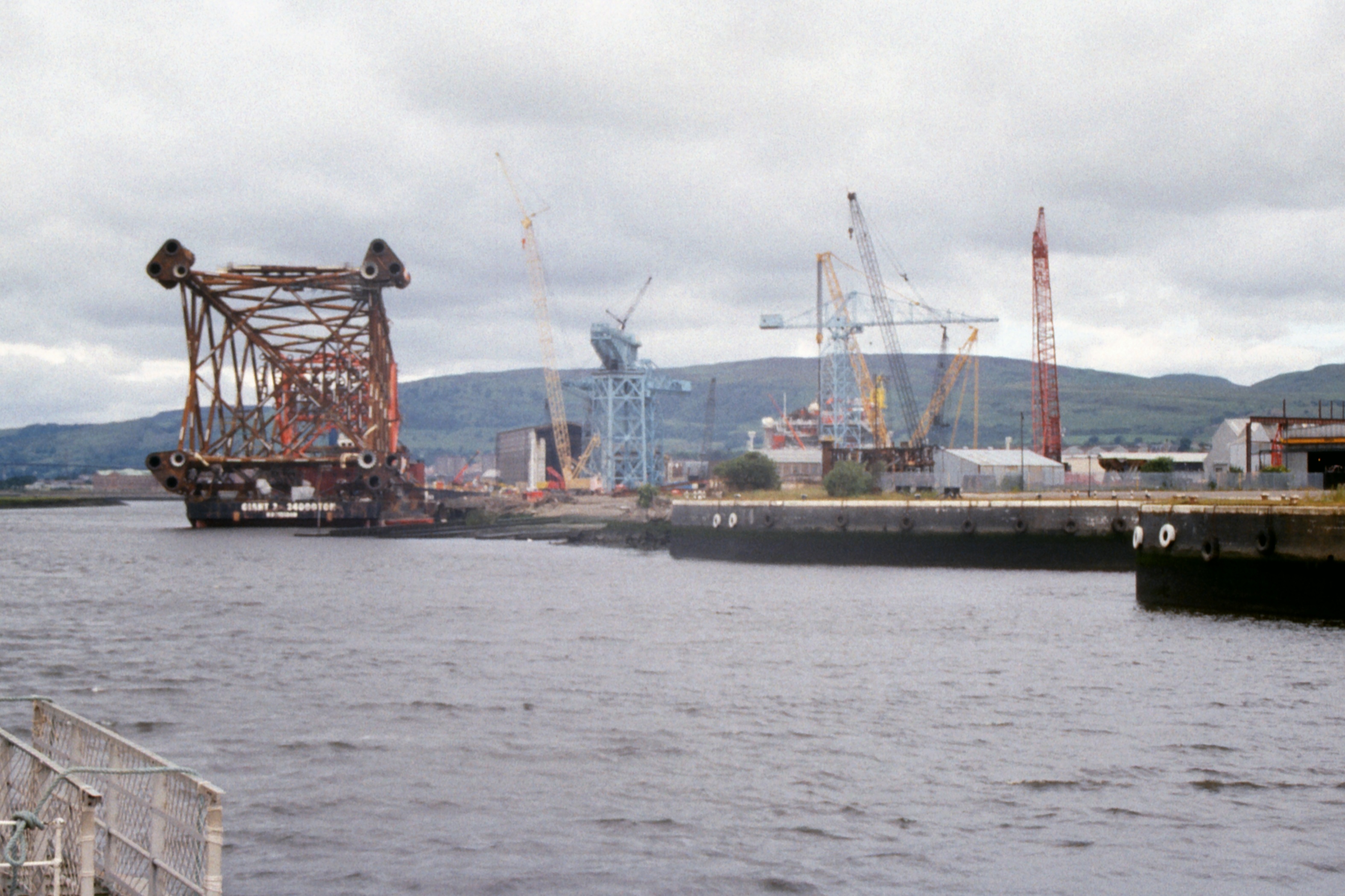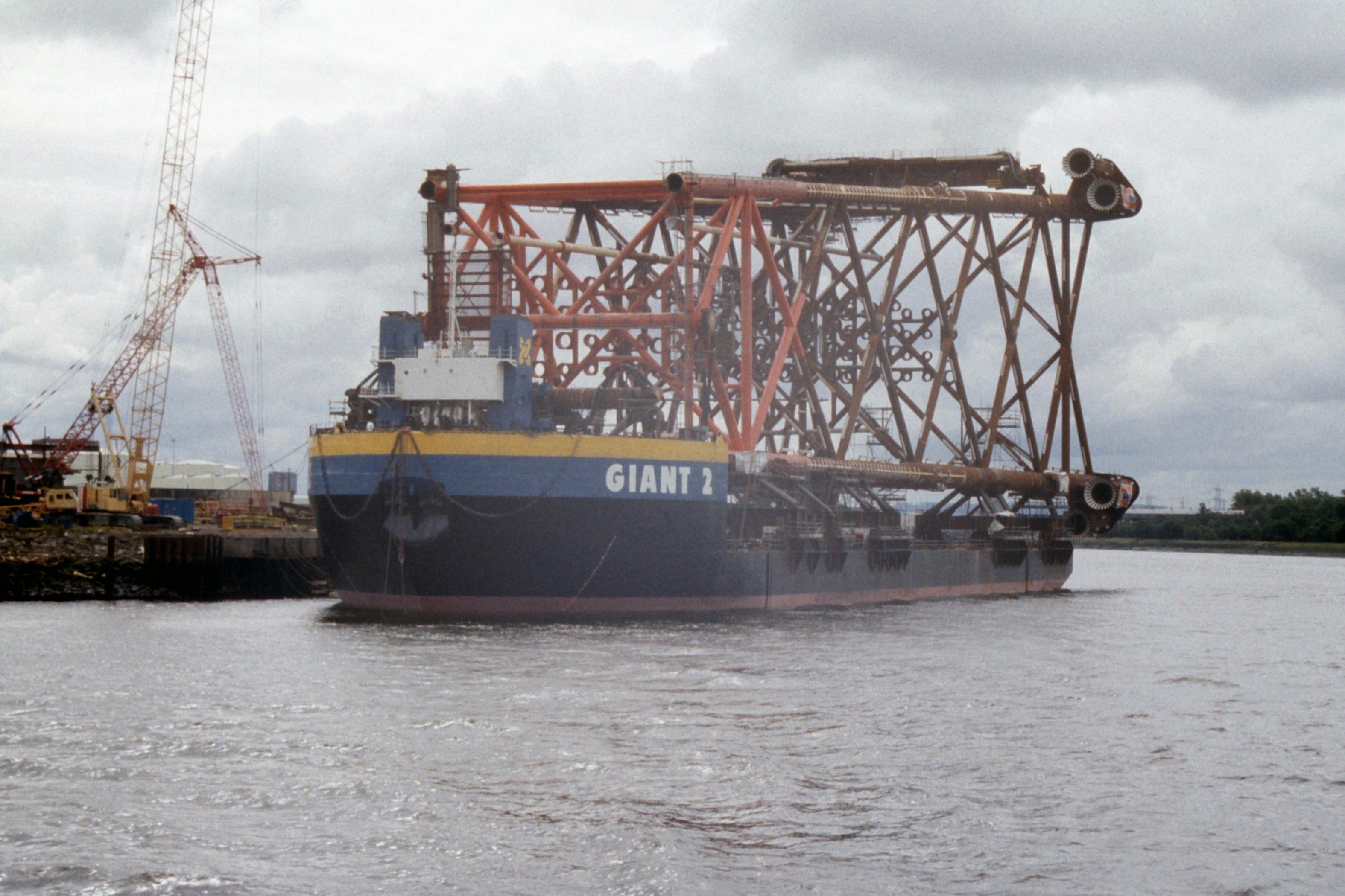 Oil rig legs on the barge "Giant 2" at U.I.E., Clydebank |