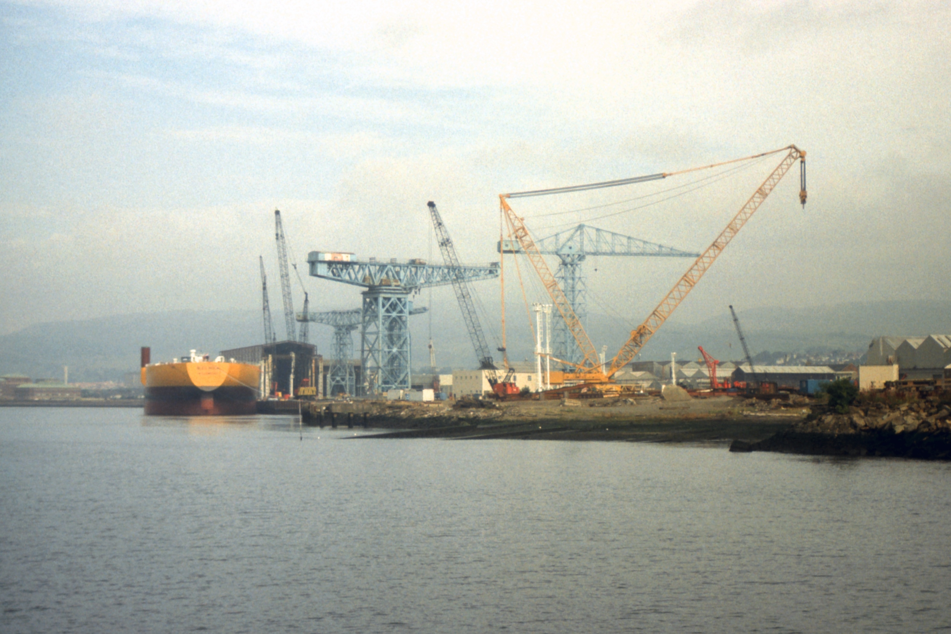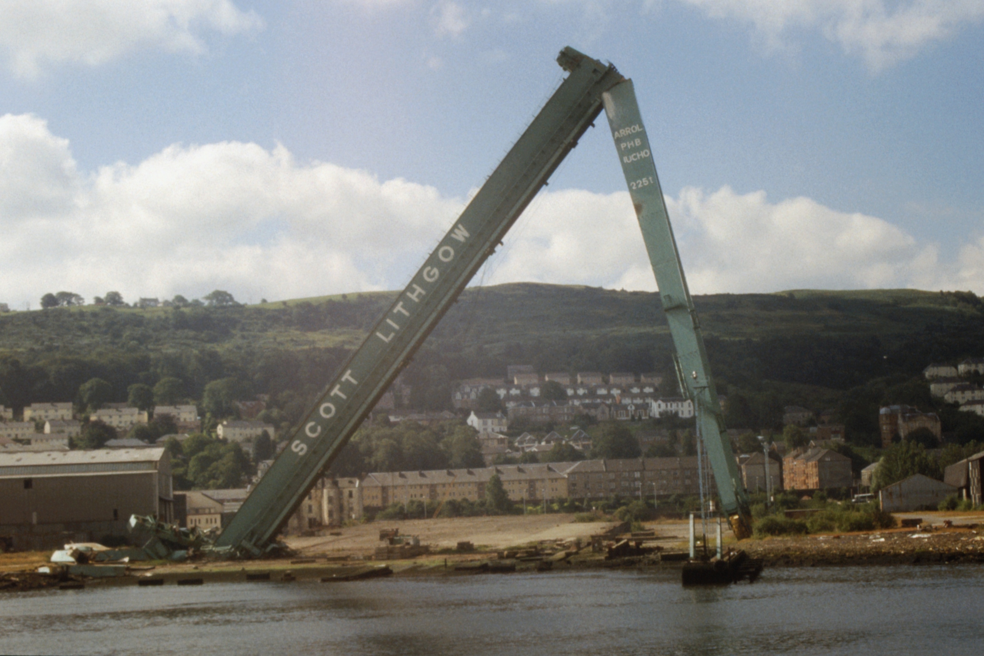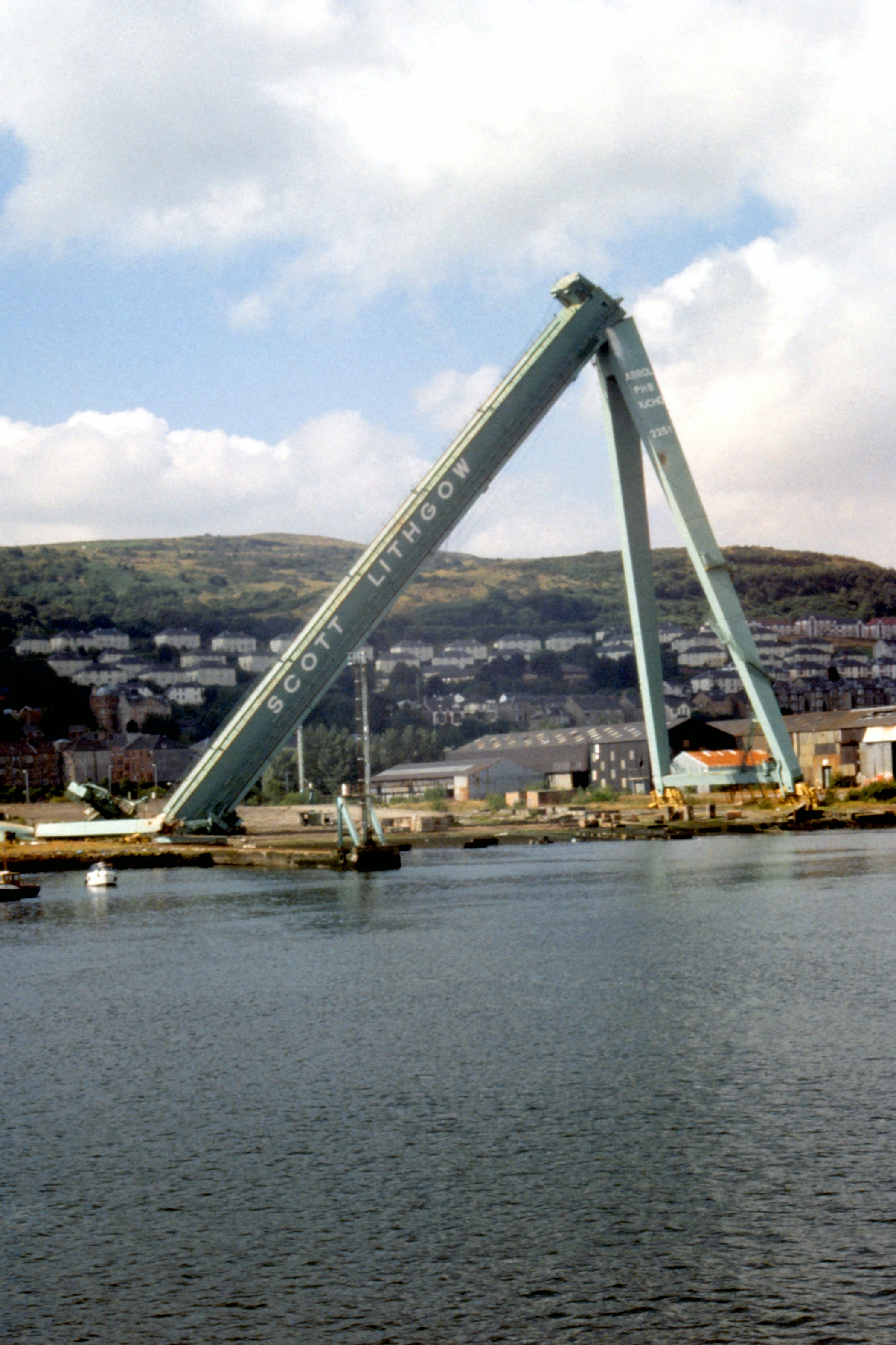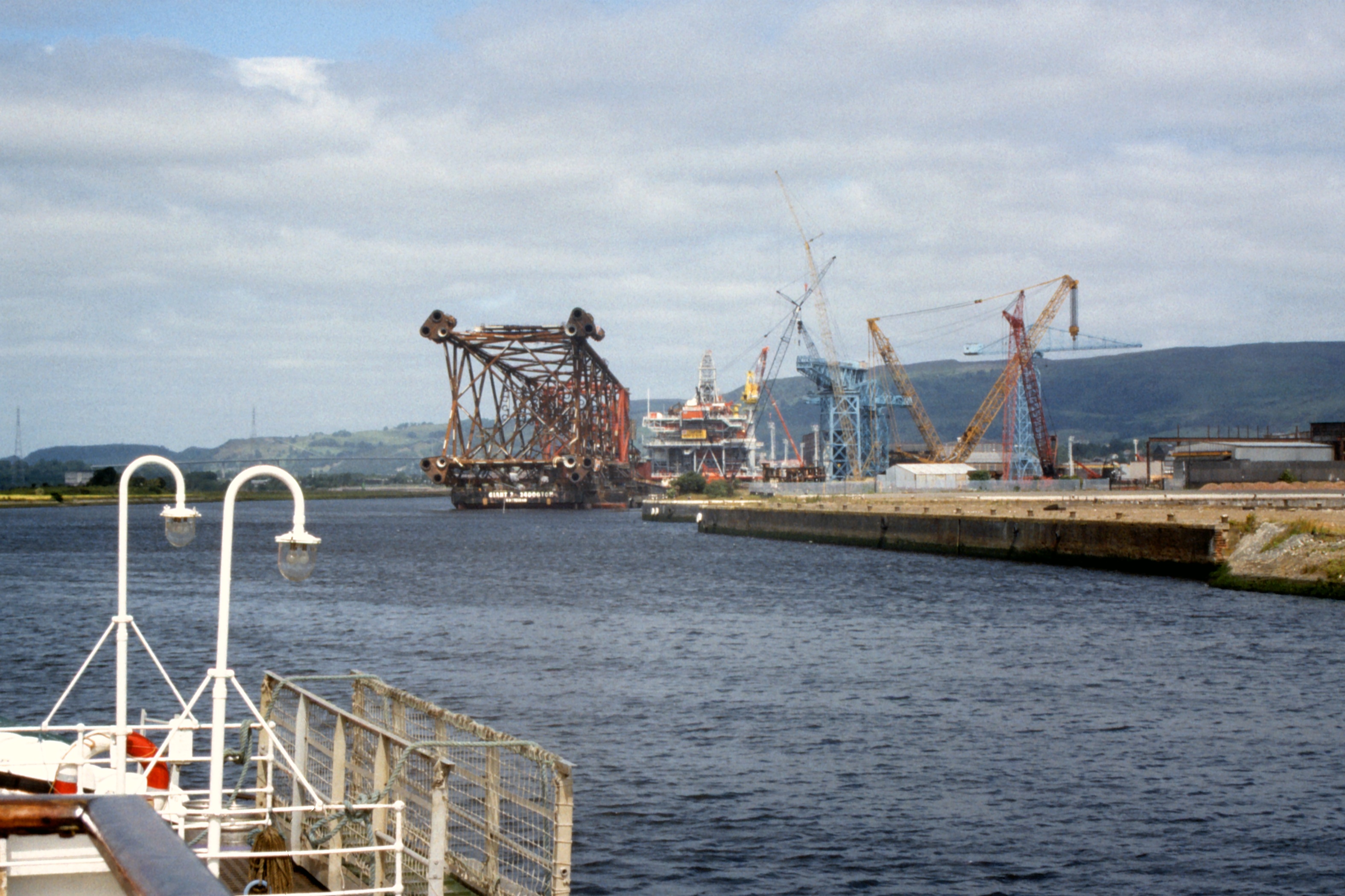 Oil rig legs on the barge "Giant 2" at U.I.E., Clydebank |