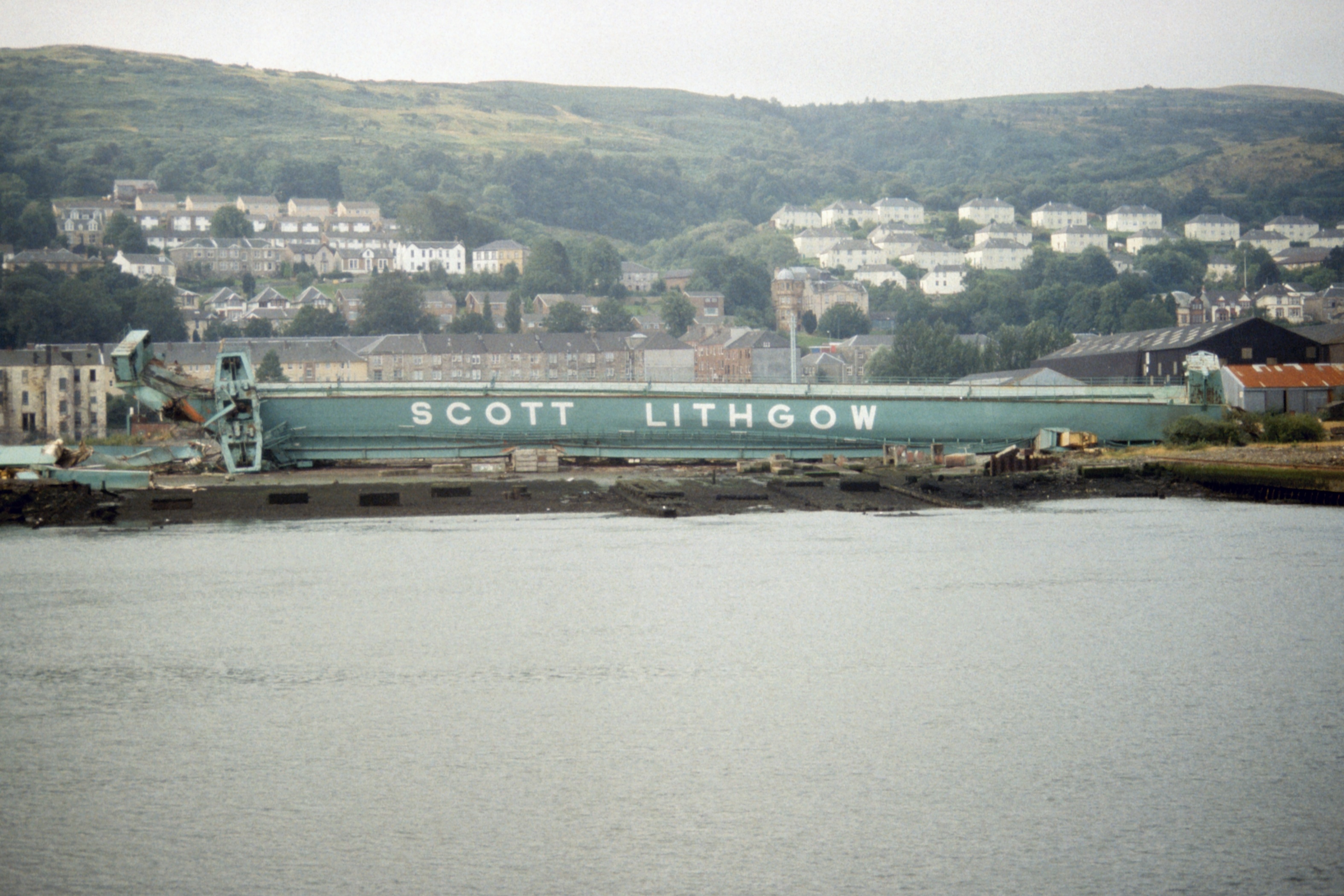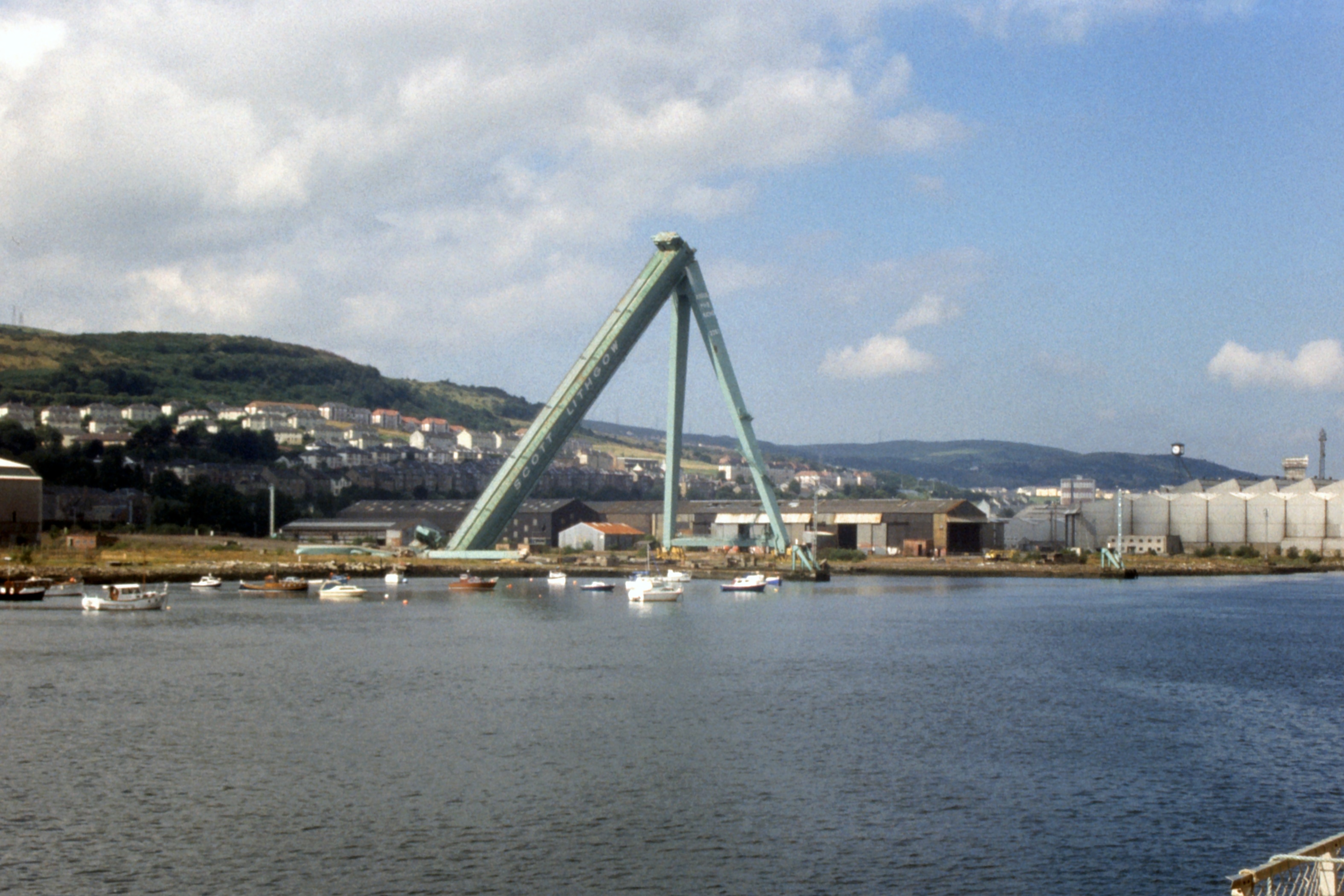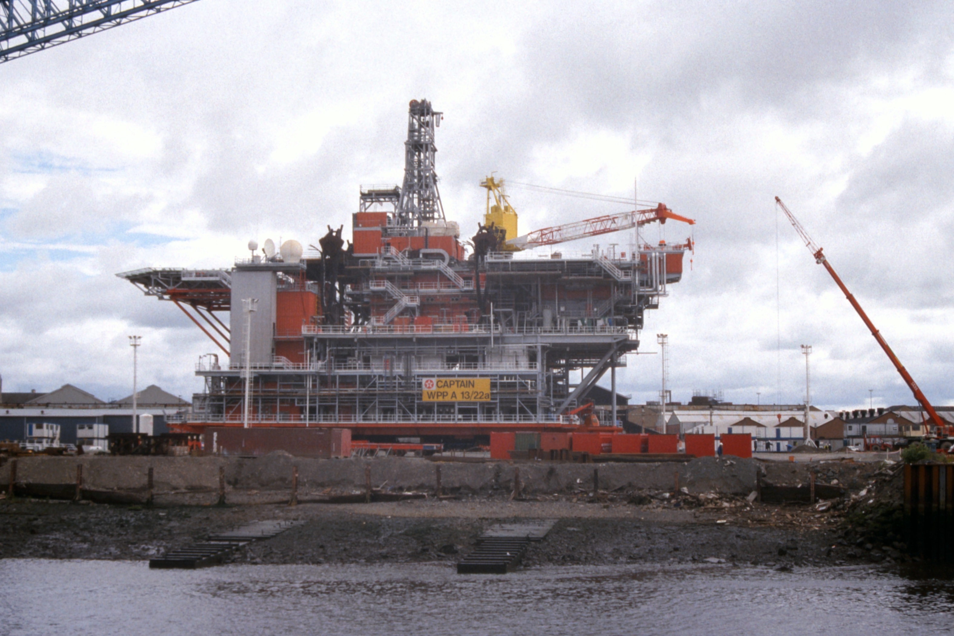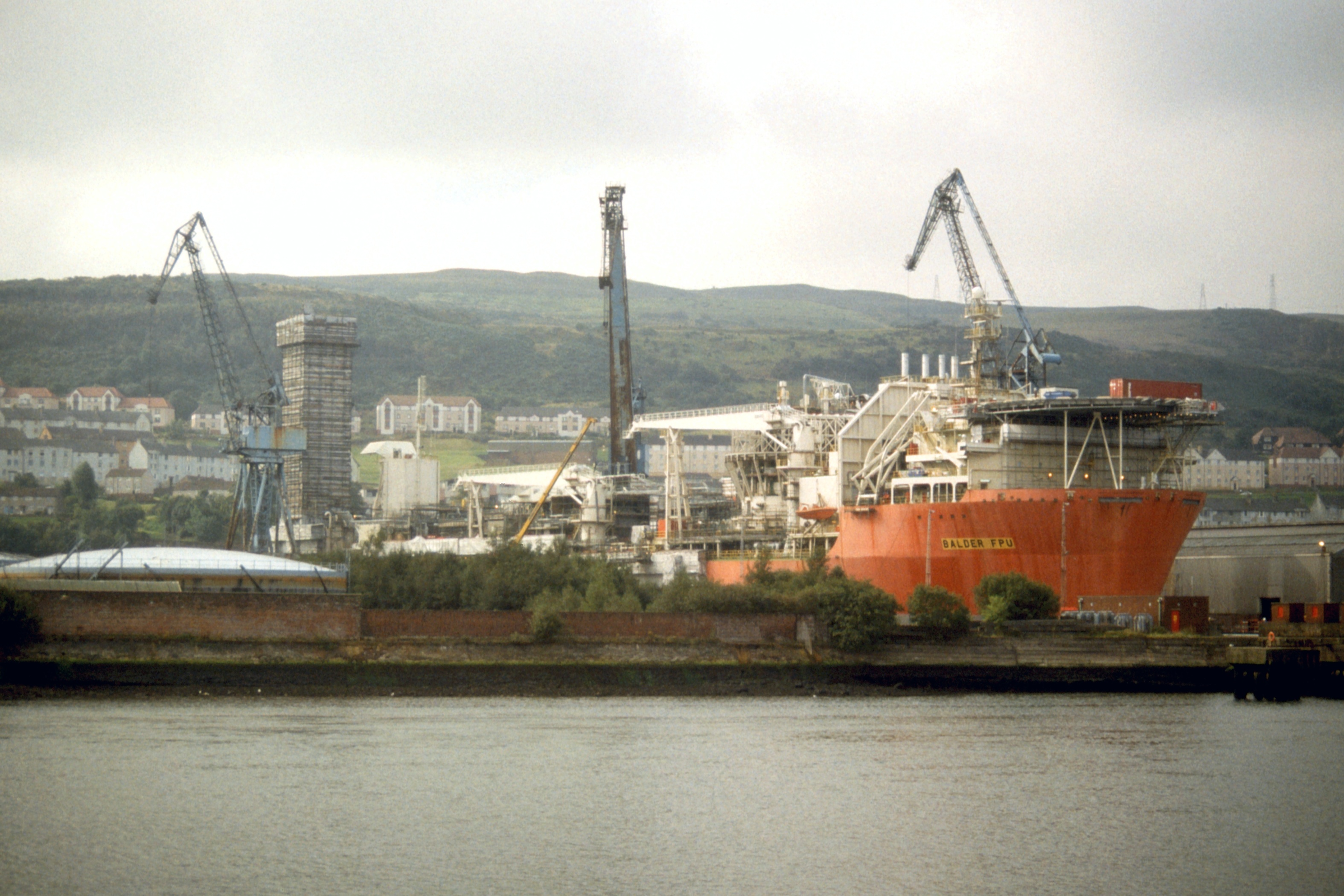 Oil rig legs on the barge "Giant 2" at U.I.E., Clydebank |