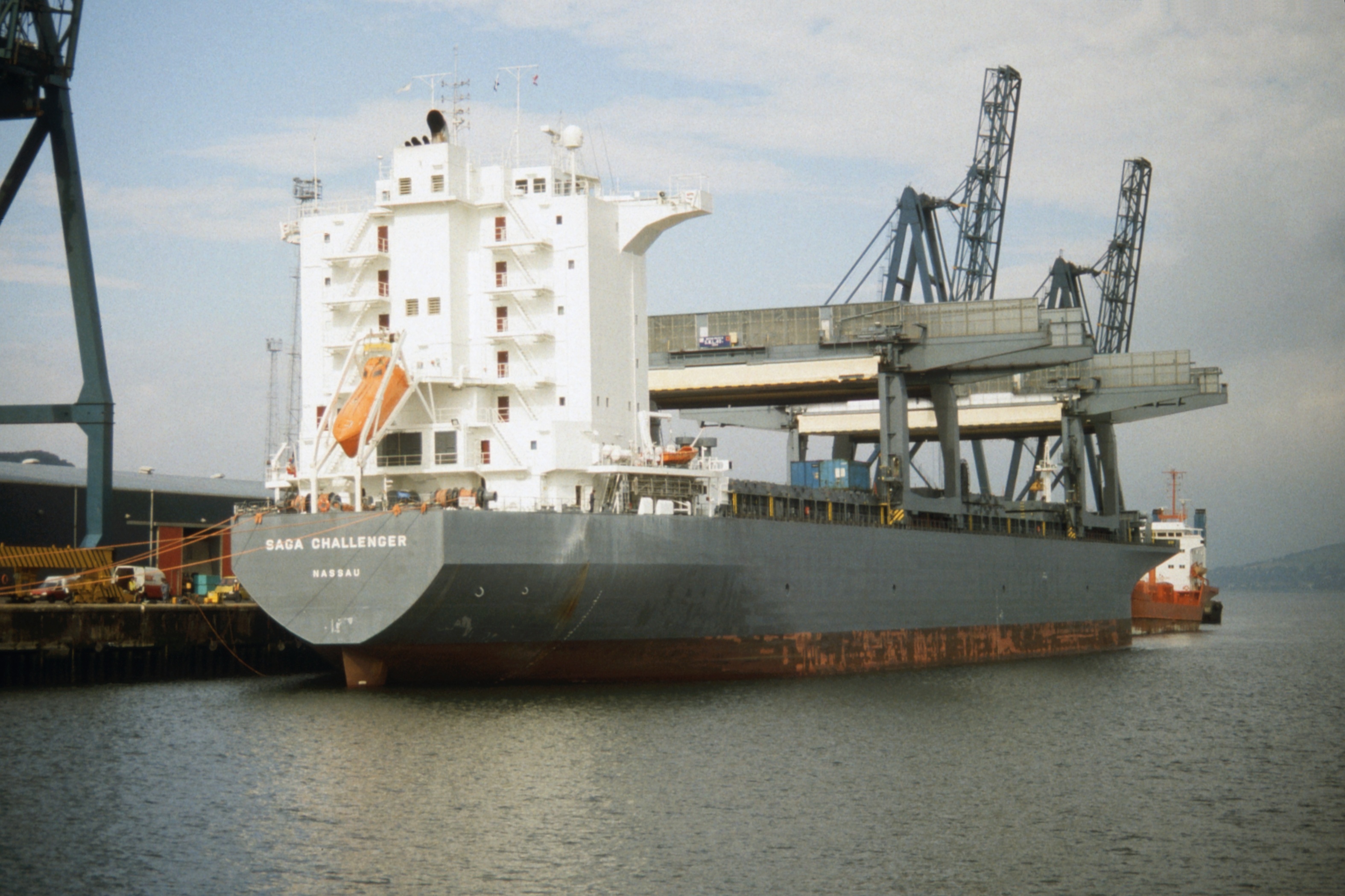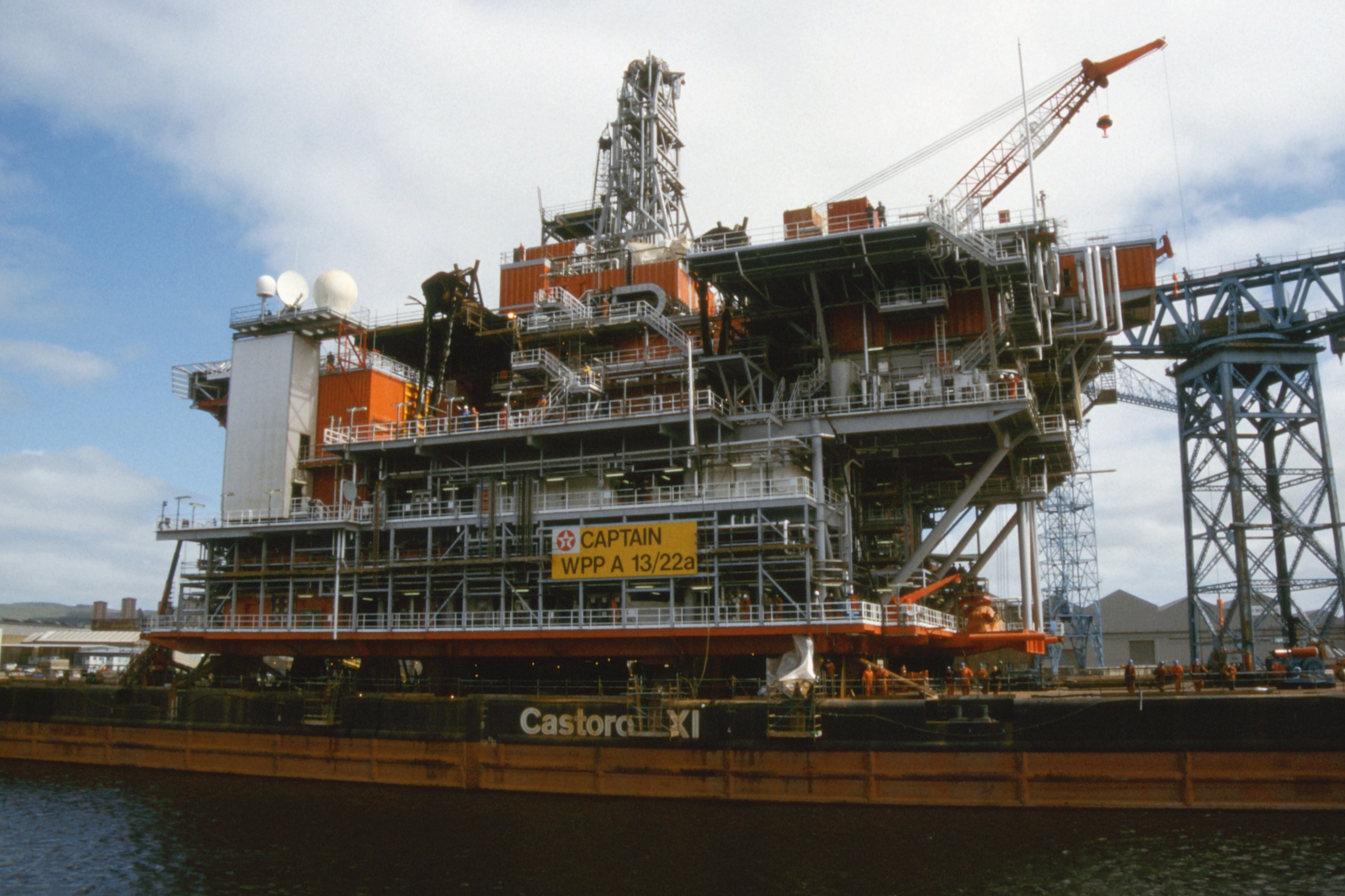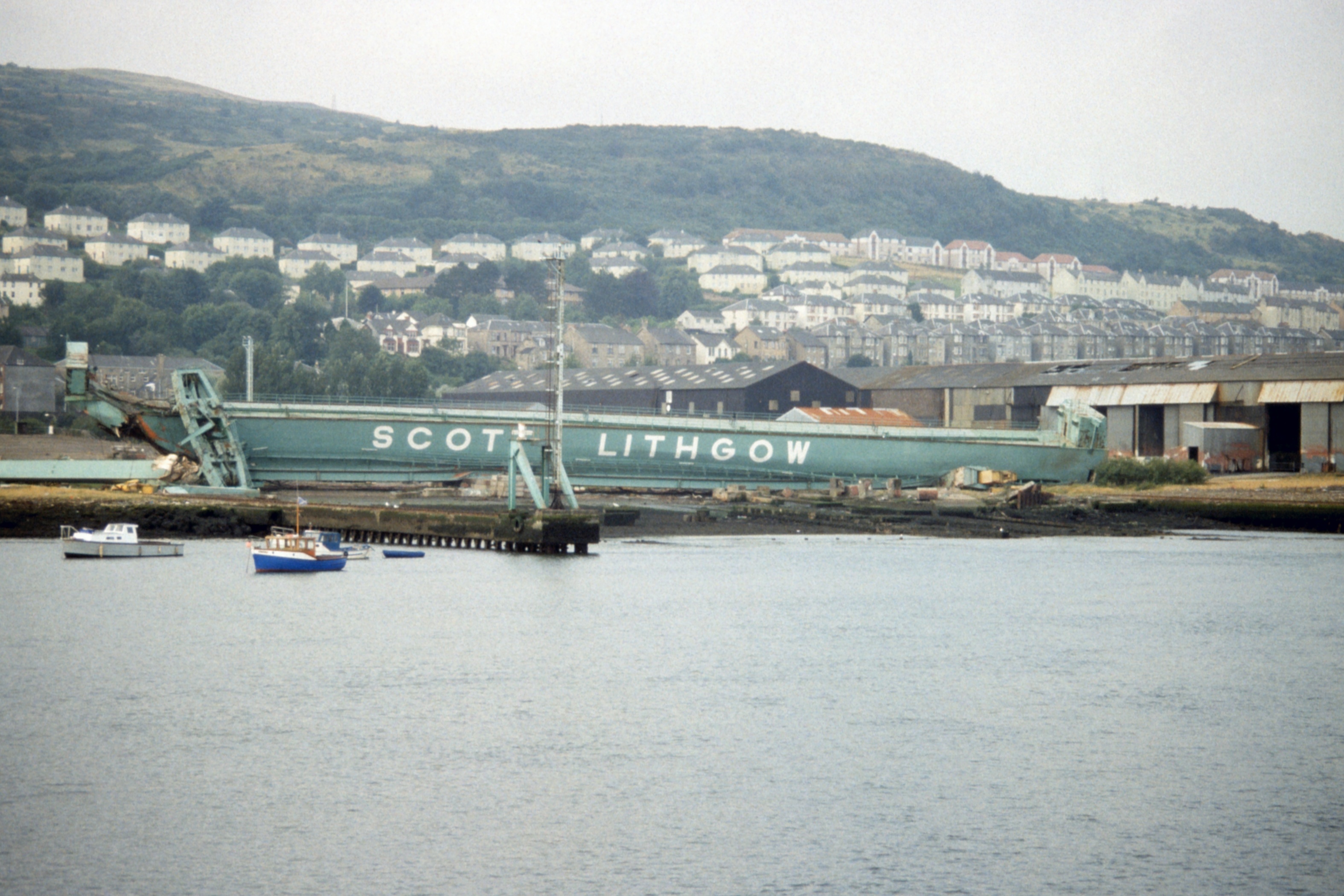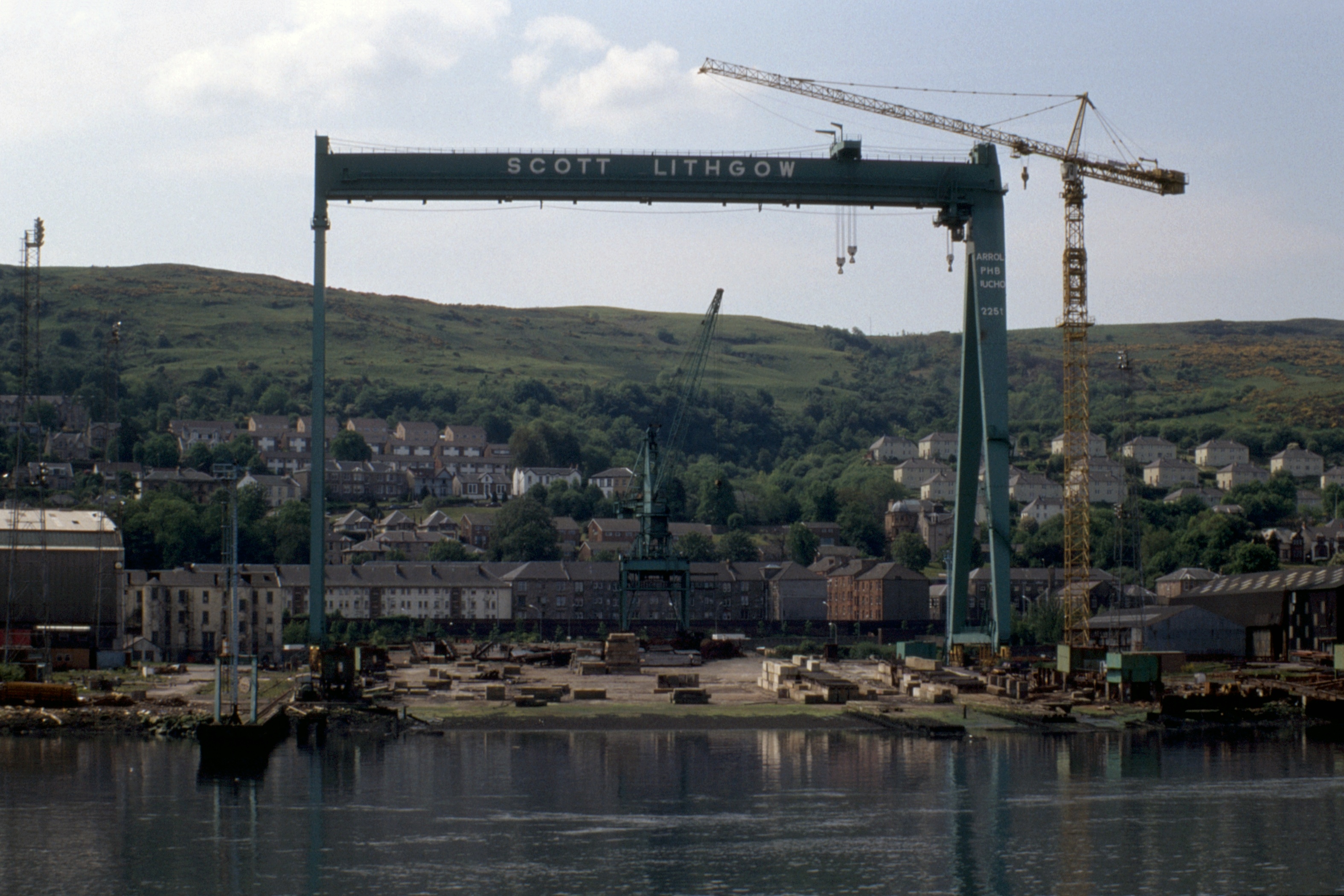 Oil rig legs on the barge "Giant 2" at U.I.E., Clydebank |