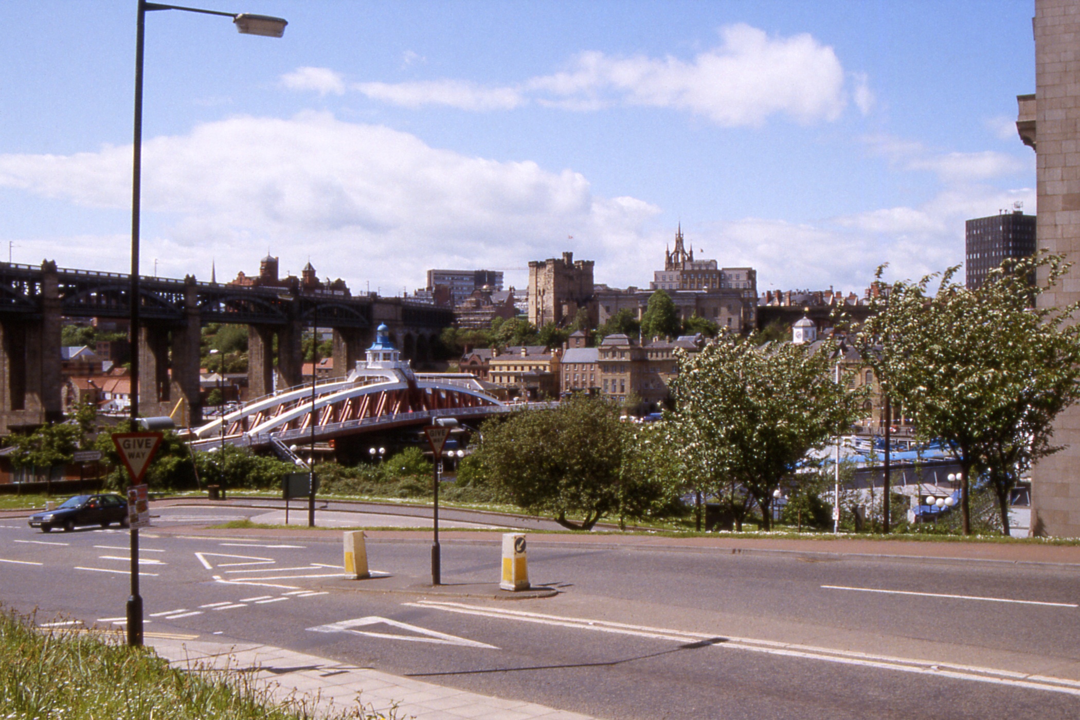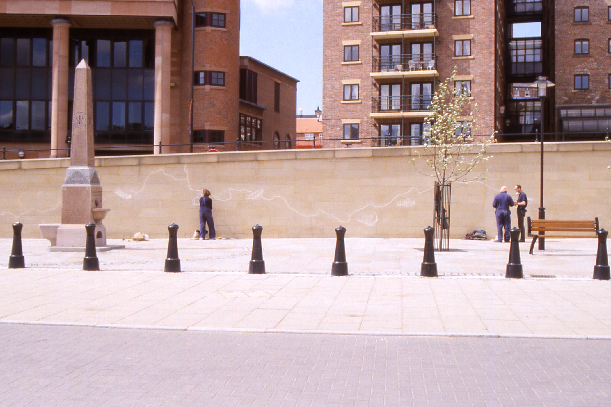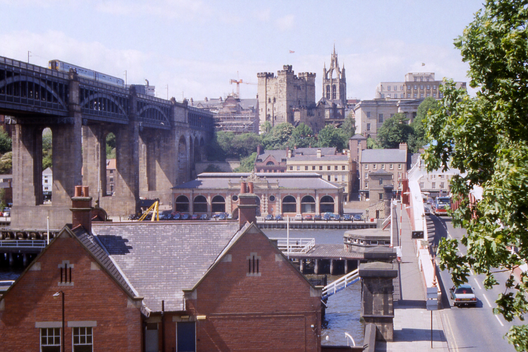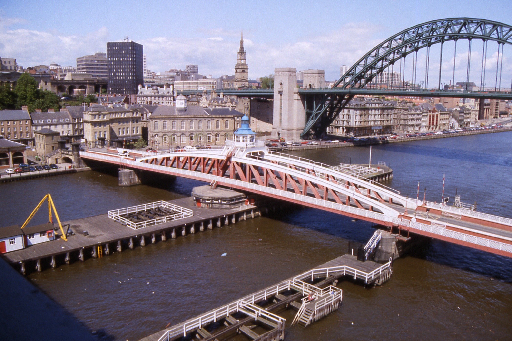 Low Level (swing) Bridge and the "New" Castle Redeveloped quayside walk with stone masons