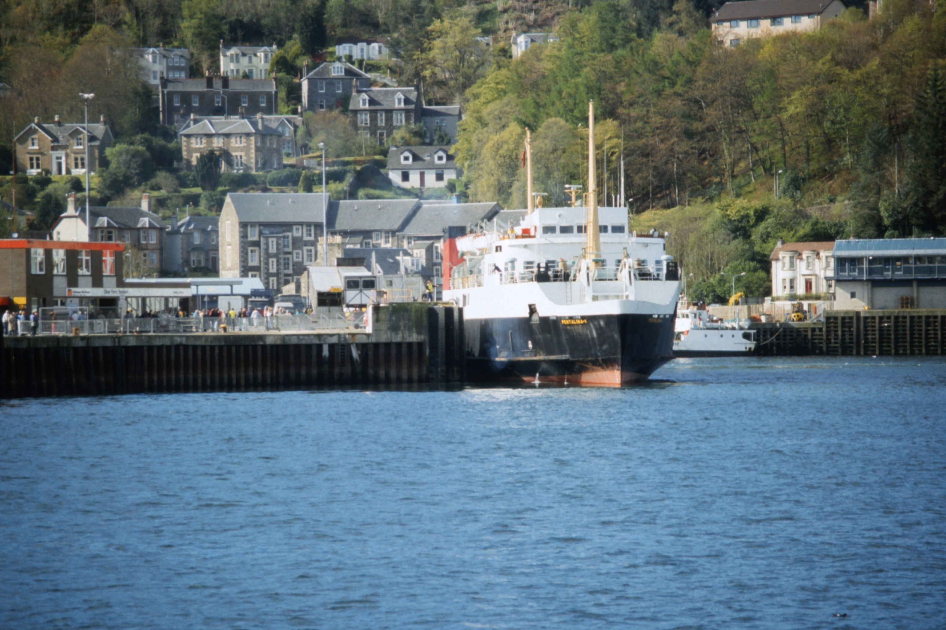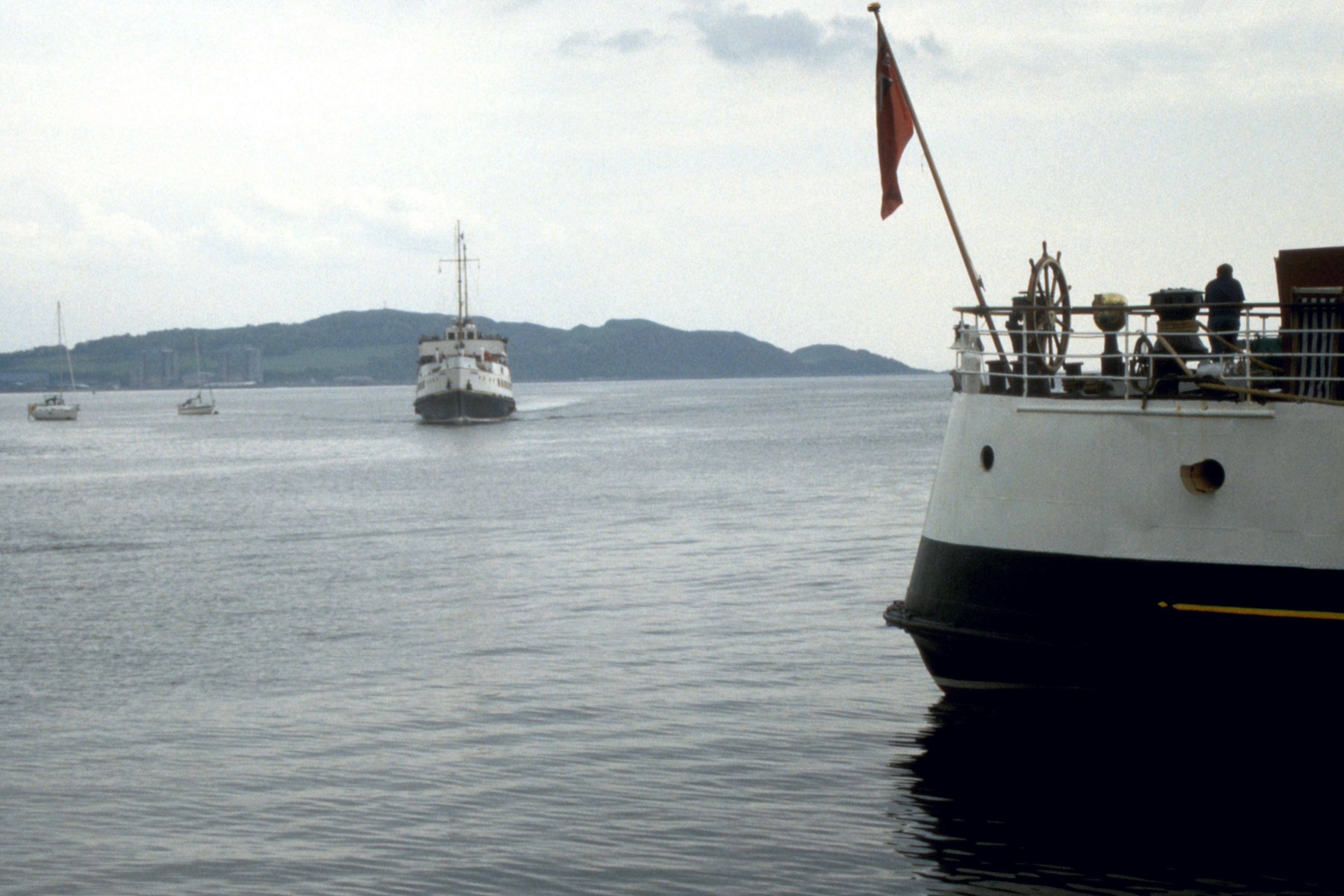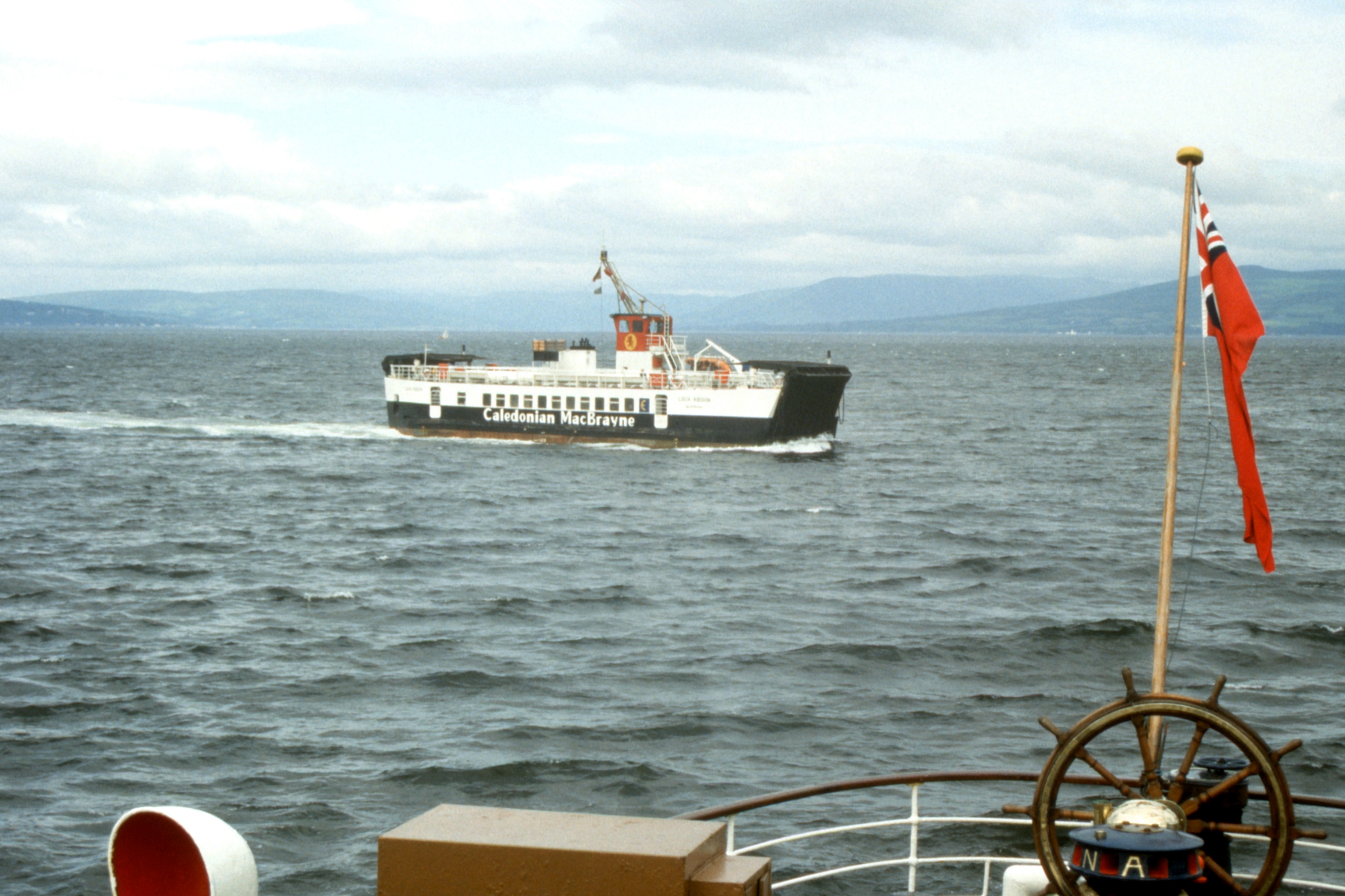 Tighnabruaich with Loch Riddon off the bow. The car ferry Lochalainn is visible above the 'promenade' deck. |