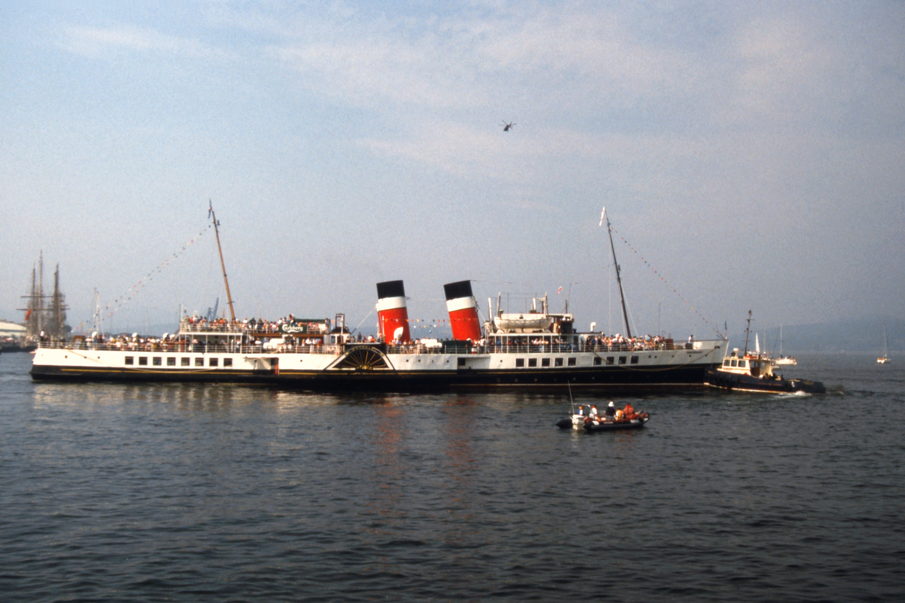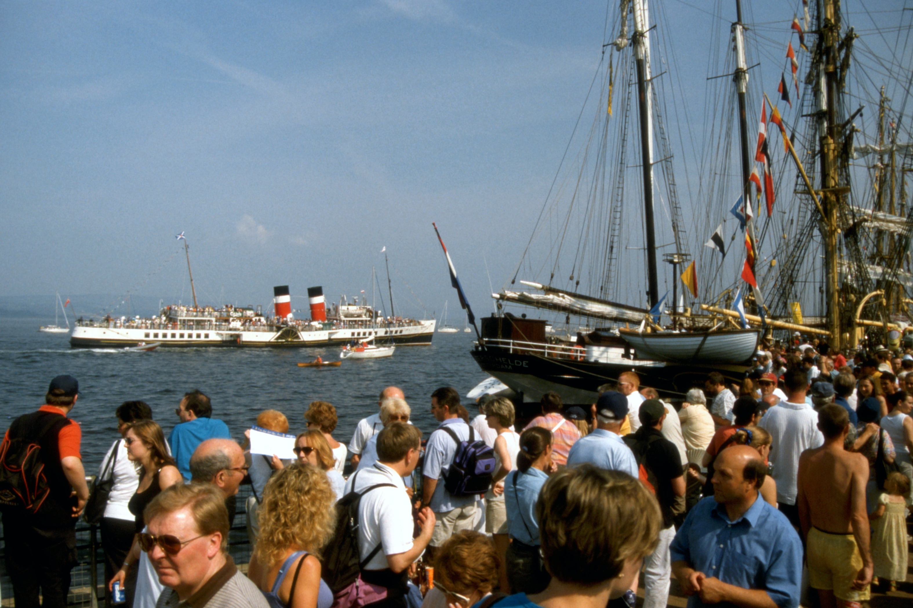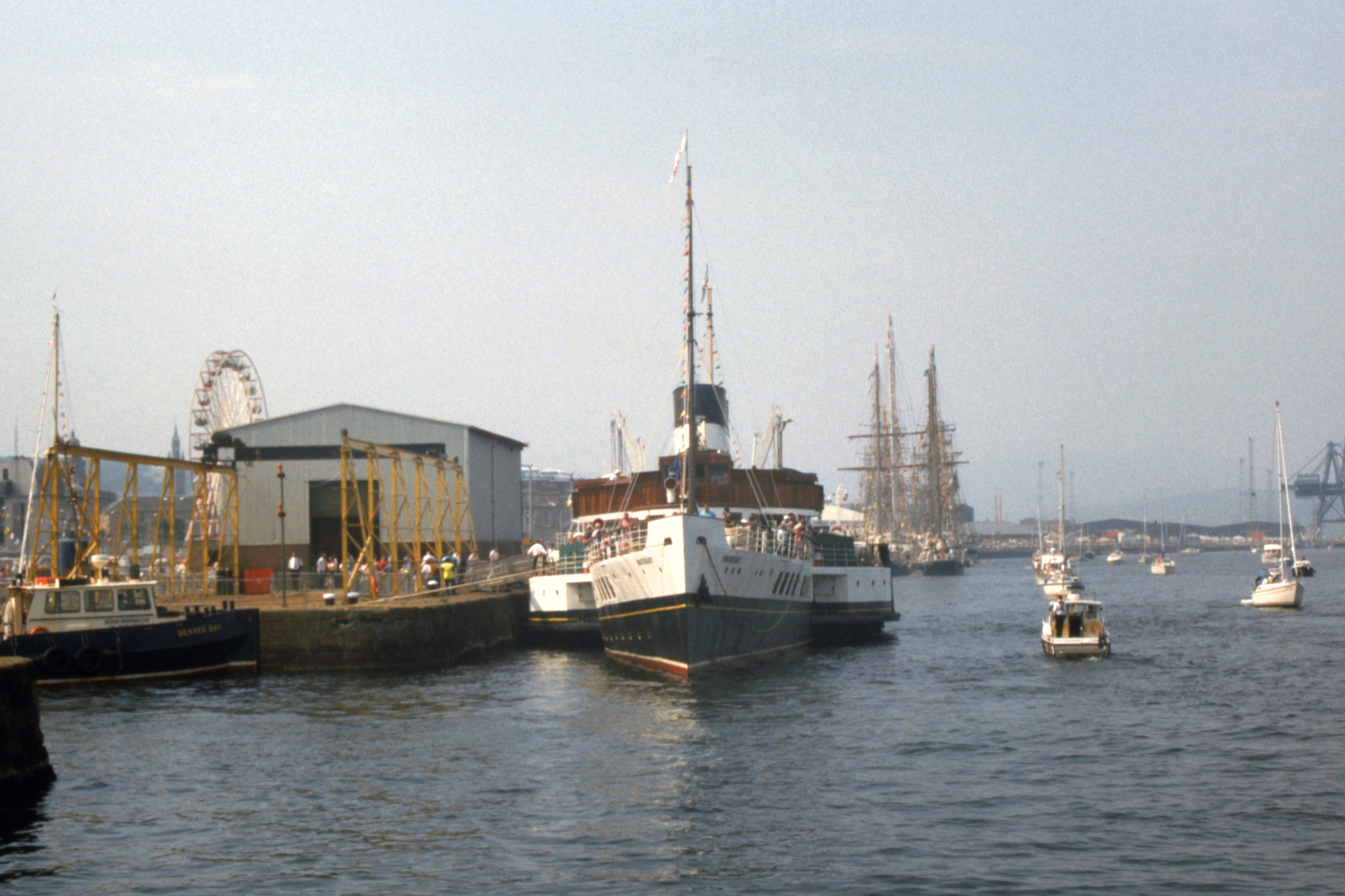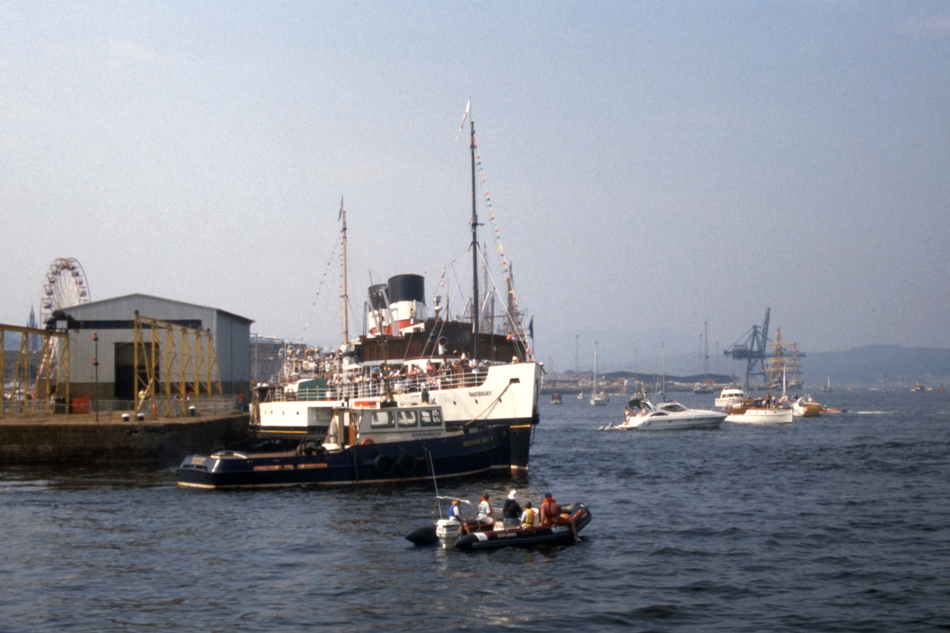To capitalise on the interest in the Tall Ships at Greenock, Waverley operated an amended schedule for 5 days, starting on the Thursday. Instead of the usual Greenock - Brodick cruise, she sailed from Ayr at 10:00 calling at Millport (11:40), Largs (12:10) and Rothesay (12:50) then cruising the wider waters of the firth to greet whatever turned up. She returned to Rothesay (17:30), Millport (18:15) and Largs (18:45) whence there was a coach return to Ayr (19:45) while Waverley viewed more Tall Ships on the way up to Glasgow to arrive at 21:45 with a coach return to Largs (22:45).