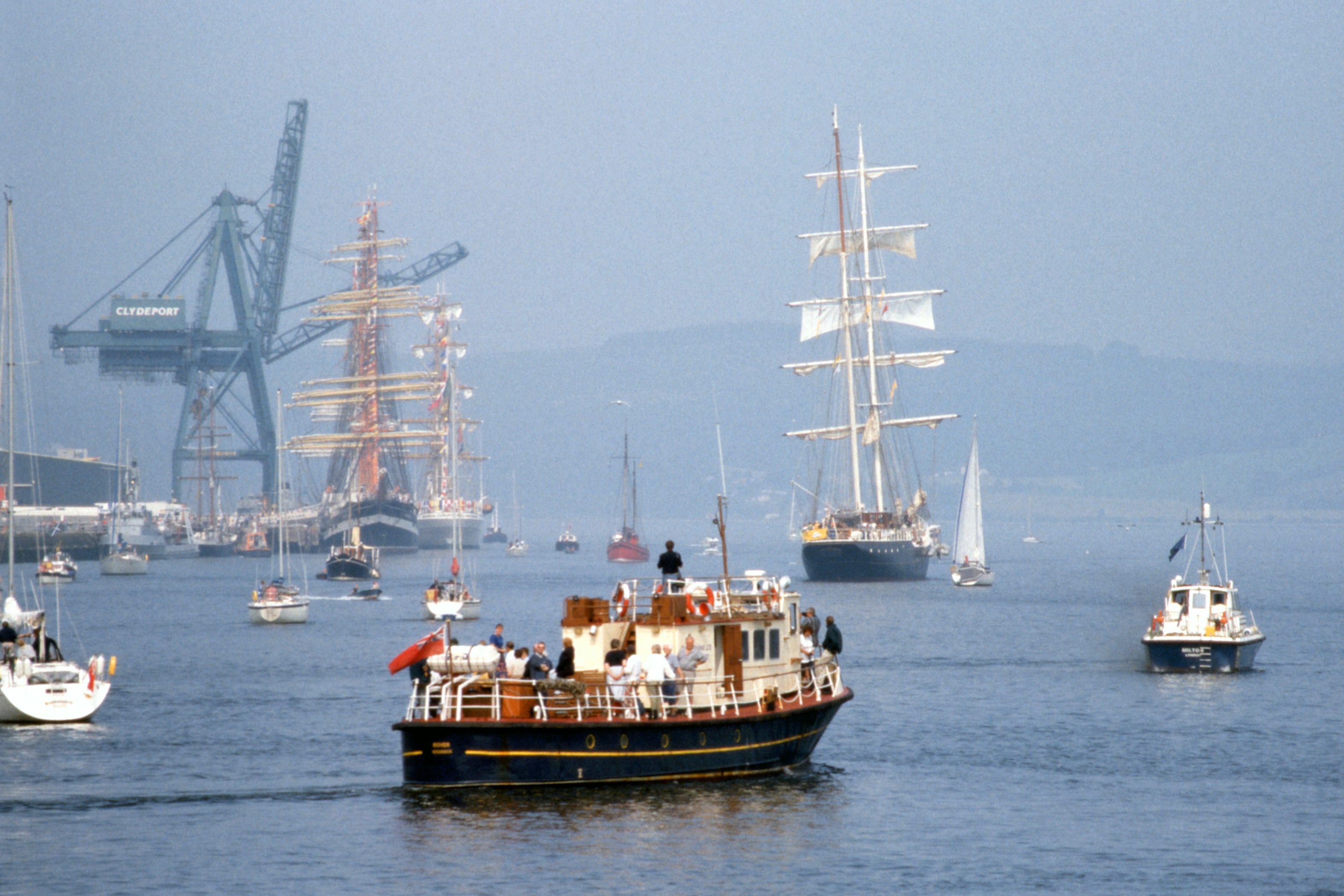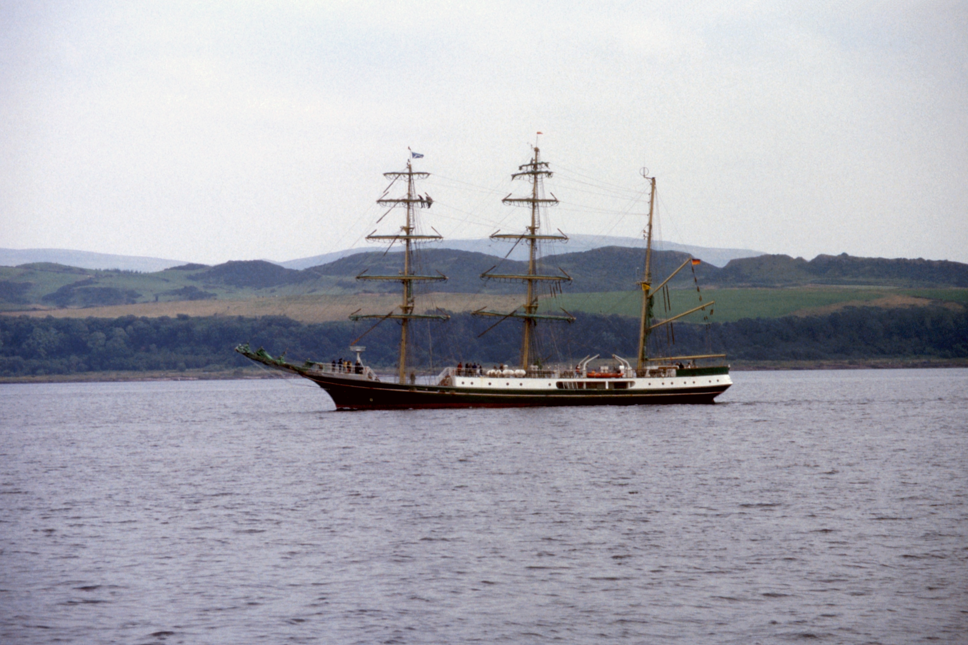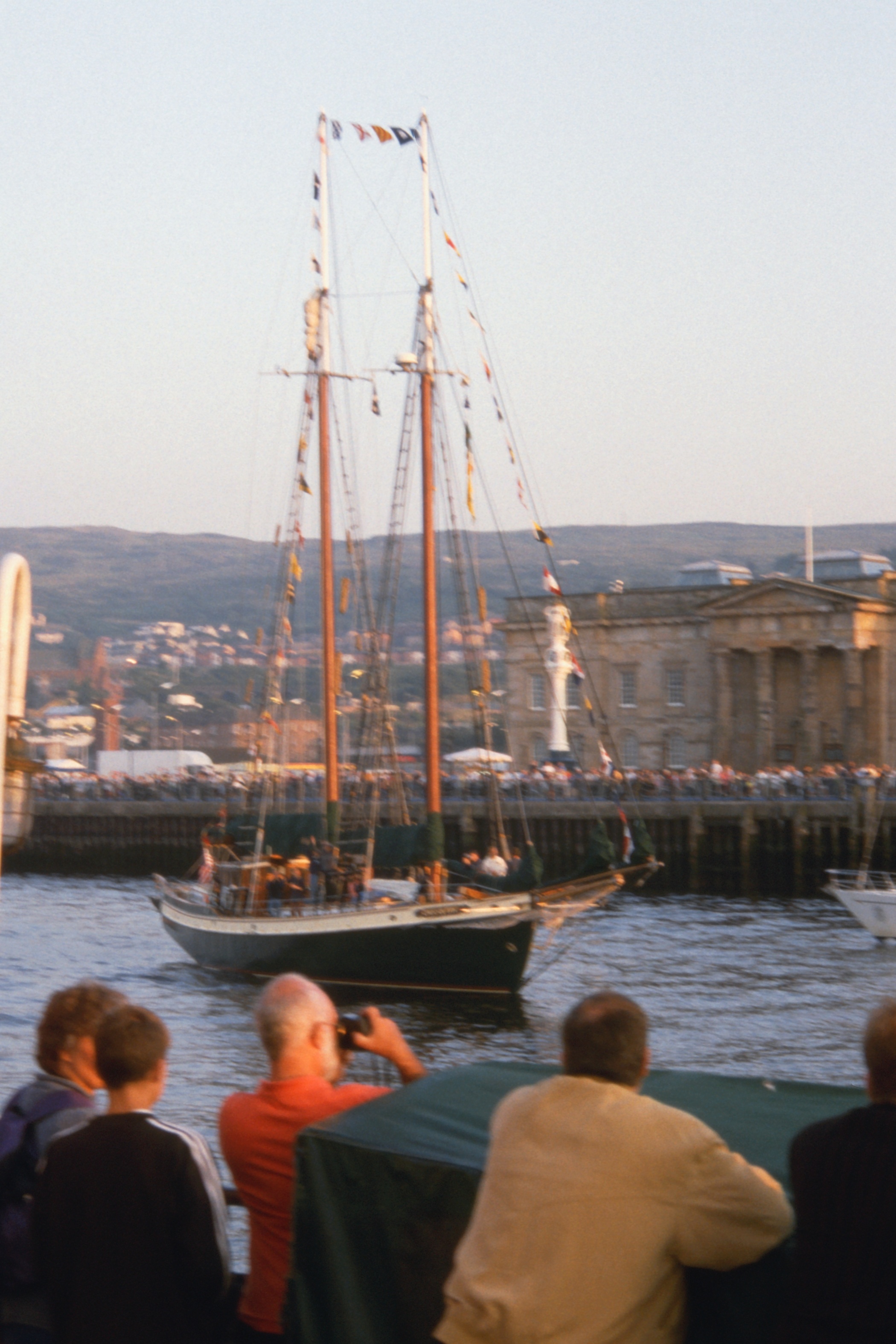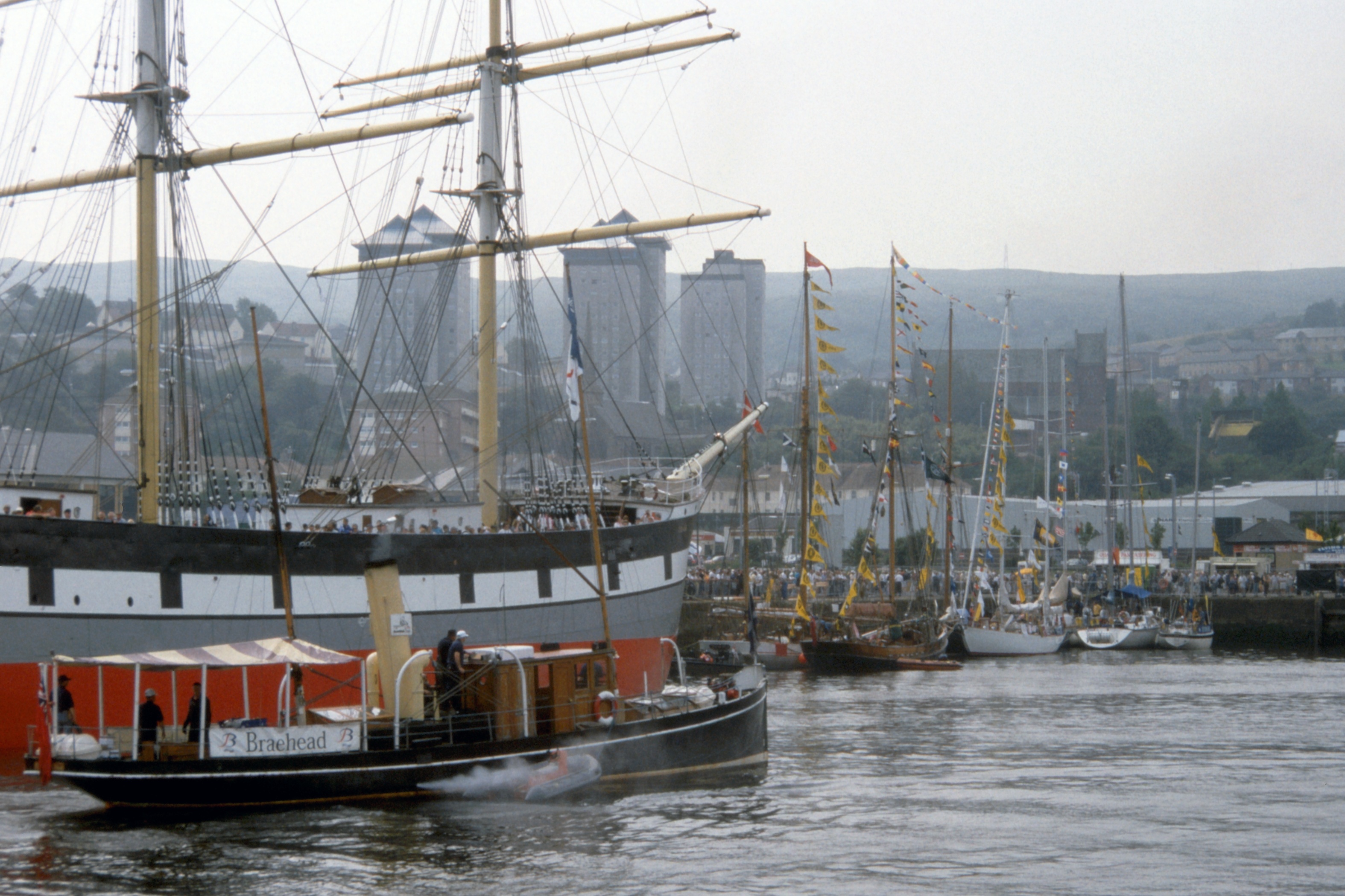 To capitalise on the interest in the Tall Ships at Greenock, Waverley operated an amended schedule for 5 days, starting on the Thursday. Instead of the usual Greenock - Brodick cruise, she sailed from Ayr at 10:00 calling at Millport (11:40), Largs (12:10) and Rothesay (12:50) then cruising the wider waters of the firth to greet whatever turned up. She returned to Rothesay (17:30), Millport (18:15) and Largs (18:45) whence there was a coach return to Ayr (19:45) while Waverley viewed more Tall Ships on the way up to Glasgow to arrive at 21:45 with a coach return to Largs (22:45).